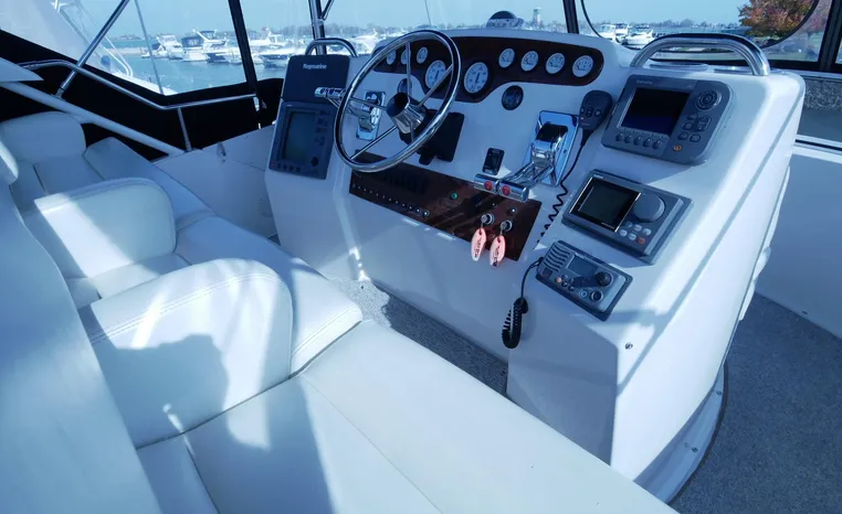 Freshwater / Great Lakes boat since new this vessel features Twin Crusader 8.2-litre EFI 405-HP Gas Engine's with only 438 original hours! Notable features include but are not limited to the following: Air-Conditioning & Heat (2-Zones), (2) Heads (Electric Flush) w/Vanity/Sink/Stall Showers, Kohler 8.0kw Generator, Windlass Anchor, Complete Electronics Package (Standard Horizon Explorer VHF Marine Radio (New in 2023), Raytheon C-Series GPS w/Chartplotter, Raytheon R80 Pathfinder Radar, Autopilot, etc.), Aft Deck Hardtop w/Full Isin-Glass Surround; Aft Deck Wet Bar w/Sink / Ice-Maker, Transom Shower, and MUCH more!