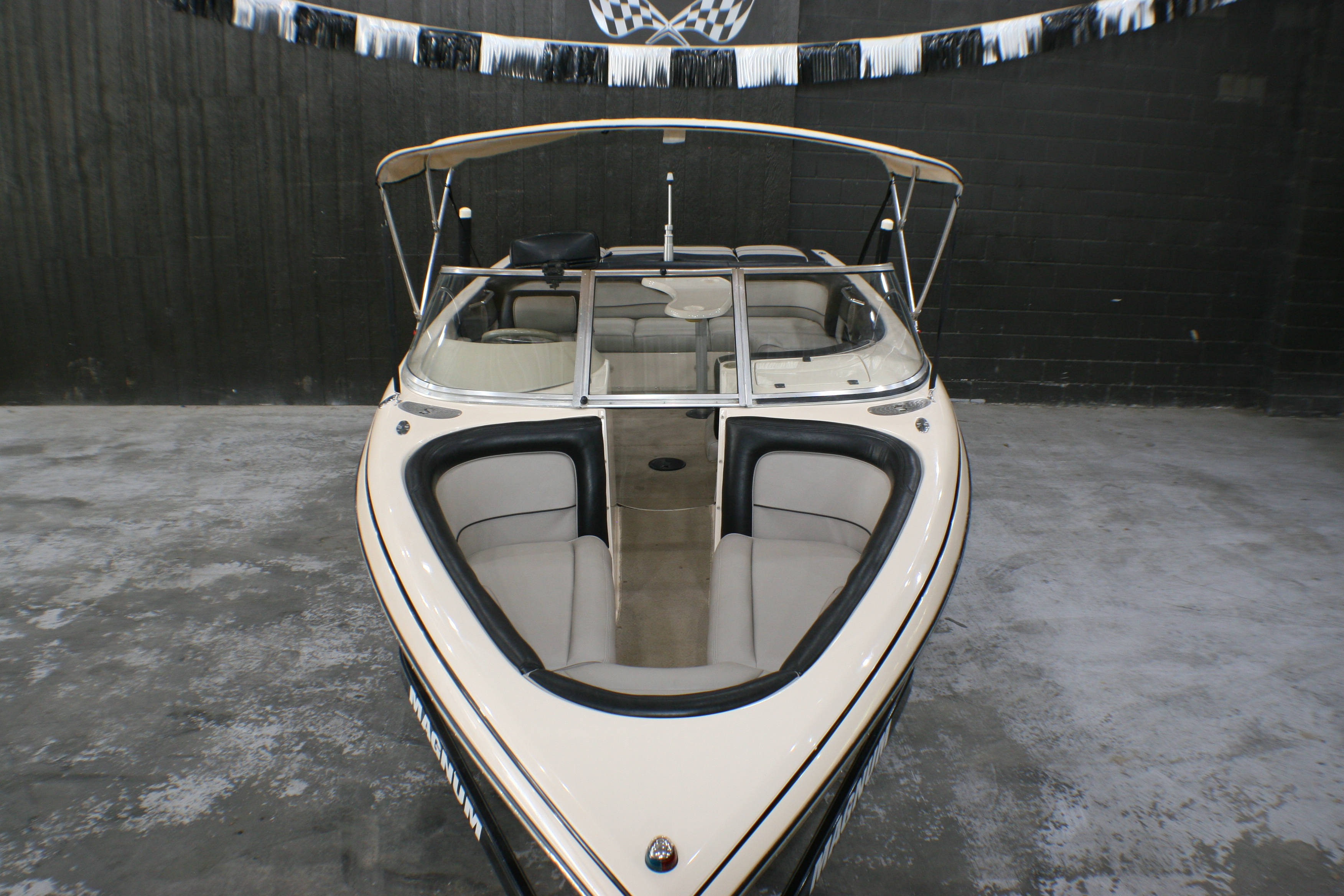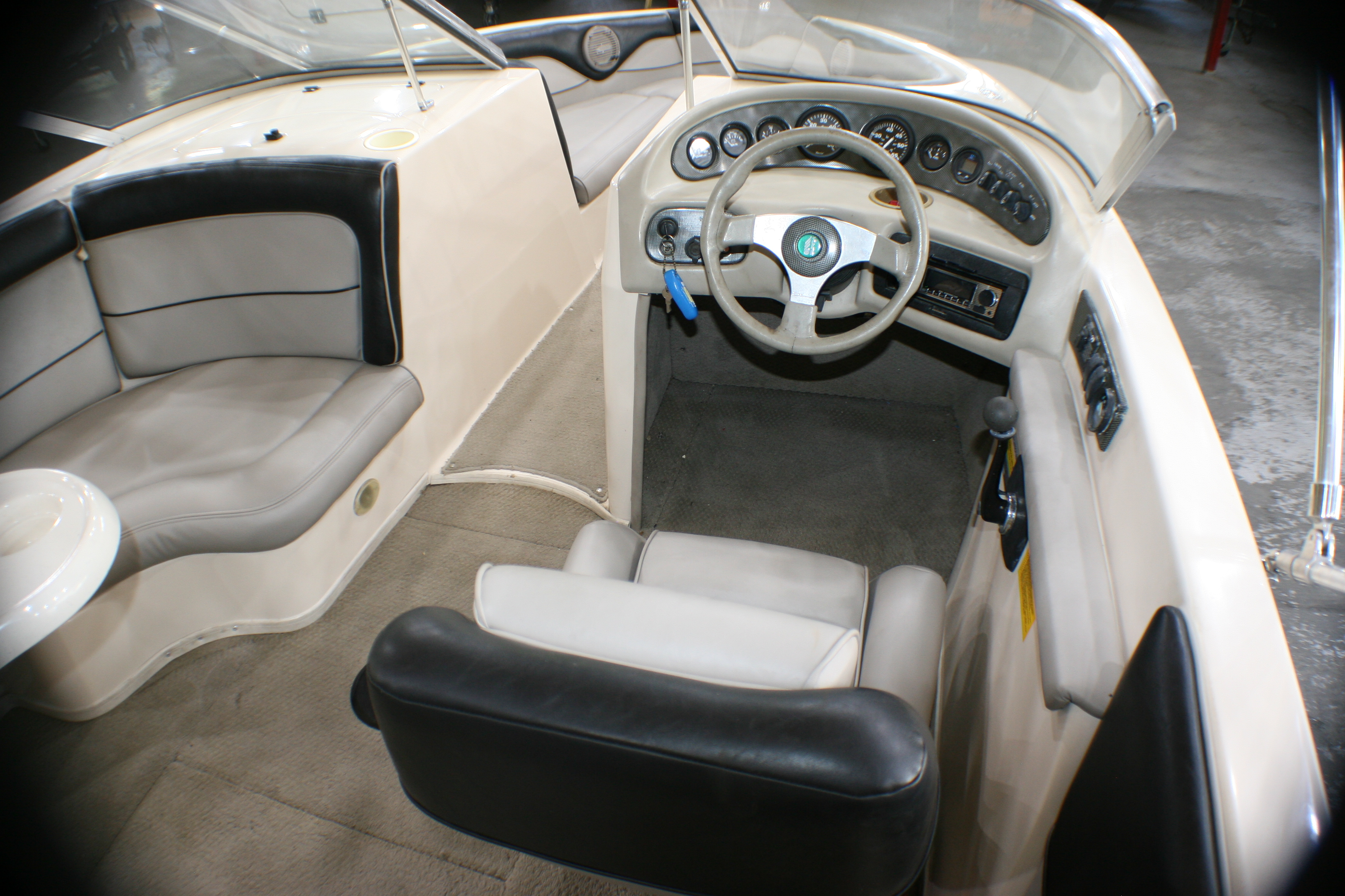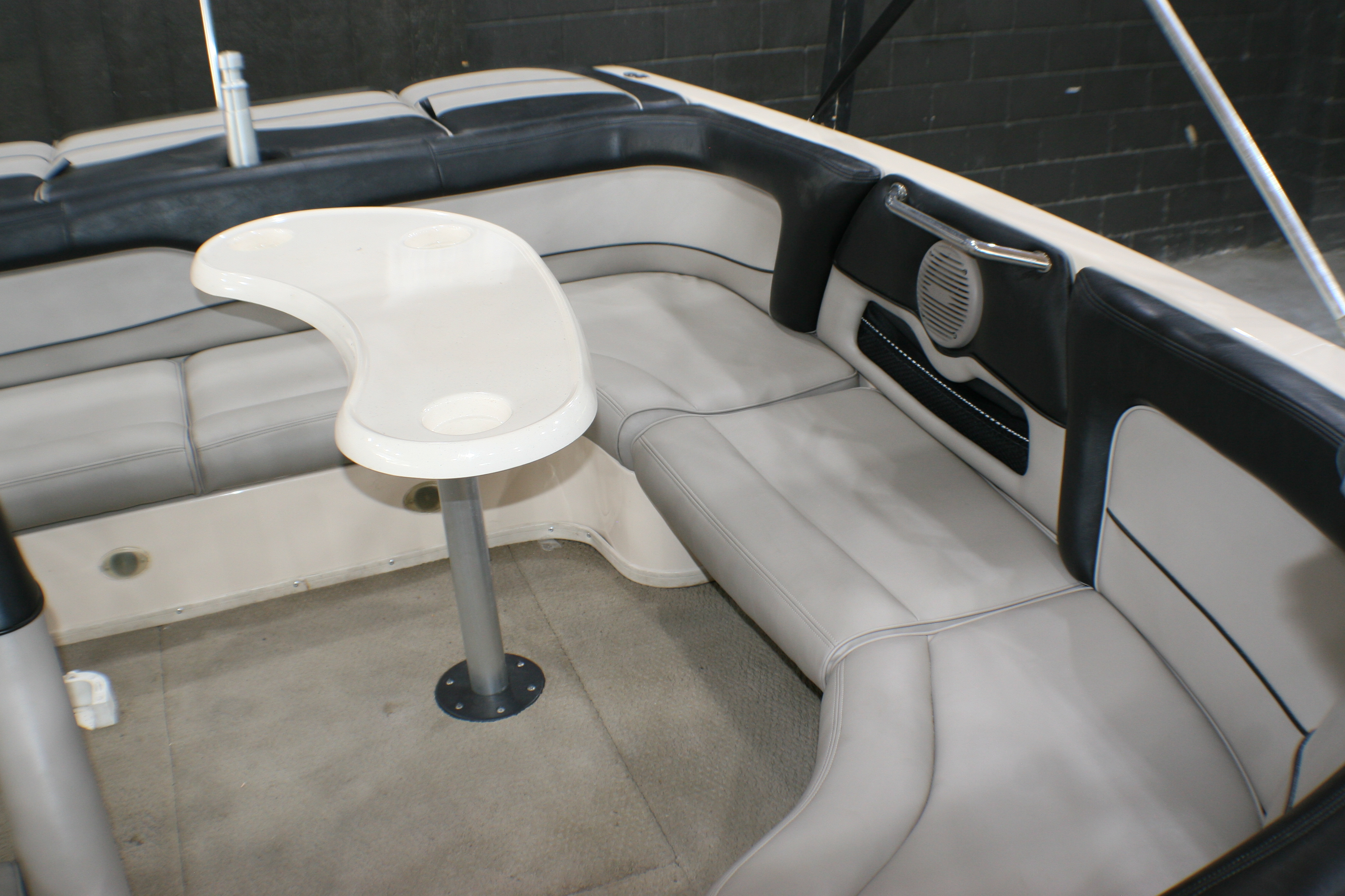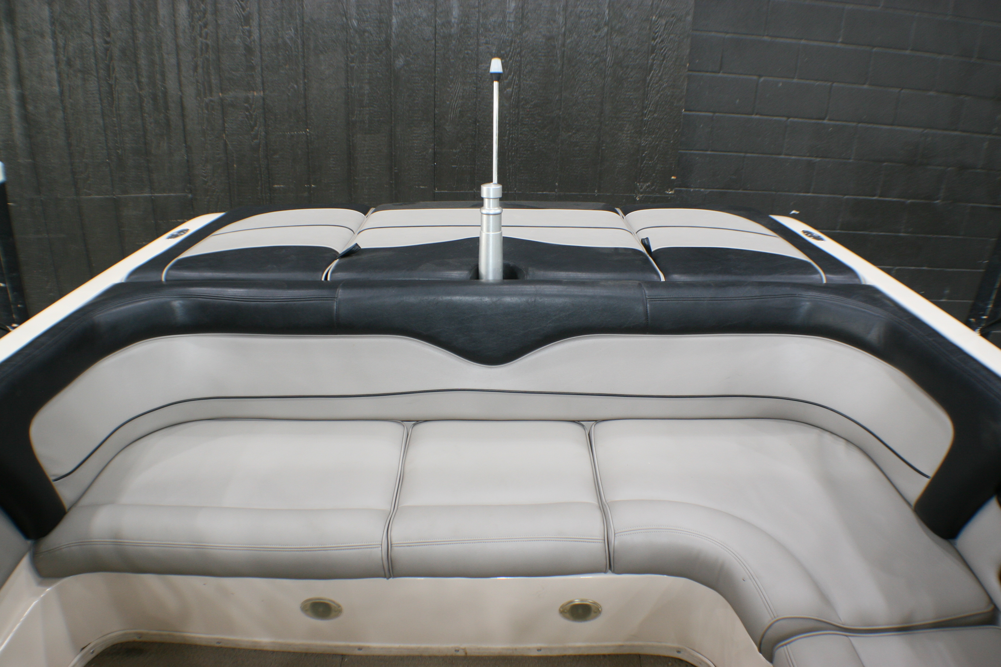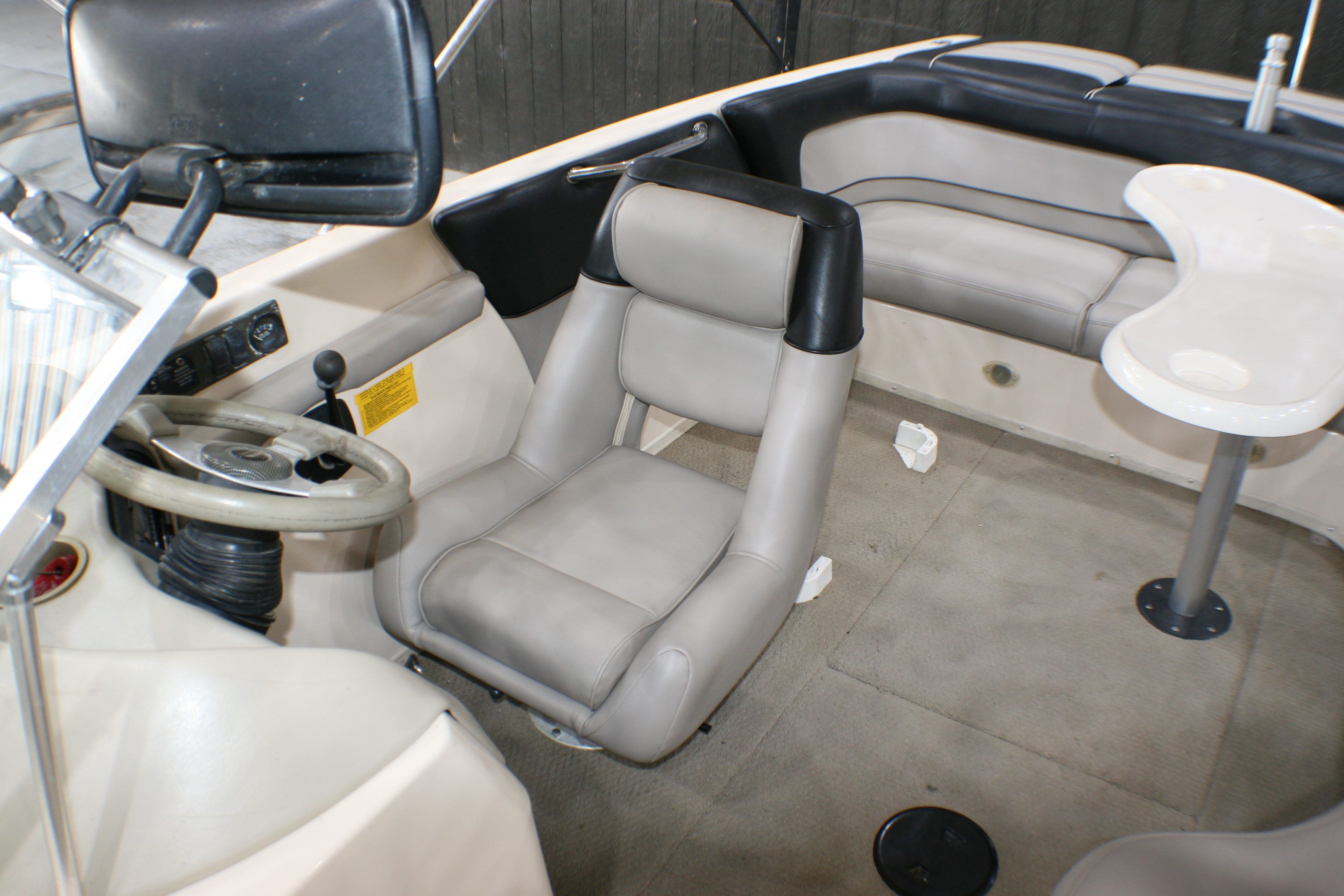 At the center of the boat, you'll find wrap-around seating and all the seats have storage space underneath. The stern is home to a triple-hatch sunpad and a large, fiberglass platform. The engine is under the center hatch, and storage space is hidden underneath the port and starboard hatches.