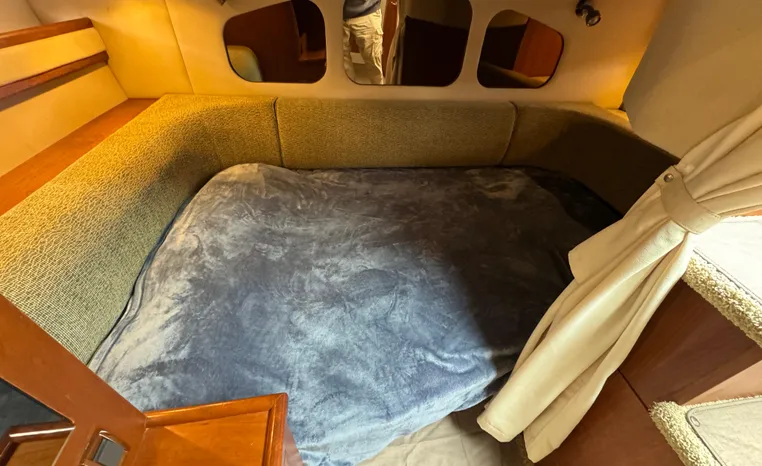 The Cruisers 3470 Express comes available with two well-thought-out layouts and features smooth, precise handling in both stern drive and inboard power. Her interior accommodations, boasting six feet, five inches of headroom throughout, will sleep up to six comfortably. The forward stateroom features a double bed with easy access, and a privacy curtain - or an optional bulkhead and door - providing complete privacy. Aft, owners can select either a fixed double berth or an alternate layout with a convertible circular settee. With the settee layout, this area can effectively lengthen the salon into one wide open living space or, with the privacy curtain, it can serve as a comfortable midcabin. The facing dinette to starboard easily converts into another berth. To port of the companionway is a full-service galley with a large refrigerator / freezer, microwave, and double-burner electric stove. The 3470 also provides a spacious head with a large, separate shower stall and full standing headroom. Abovedecks, the generous cockpit seating arrangement is ideal for dockside or on-the-water entertaining. She features a wetbar, cockpit shower, and available cockpit refrigerator or ice maker. A custom-fitted enclosure will keep everyone protected from the hot sun or inclement weather.