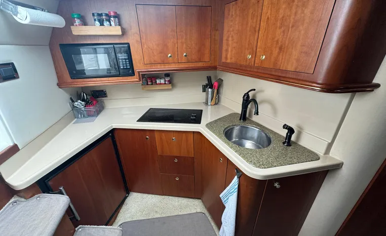 The Cruisers 3470 Express comes available with two well-thought-out layouts and features smooth, precise handling in both stern drive and inboard power. Her interior accommodations, boasting six feet, five inches of headroom throughout, will sleep up to six comfortably. The forward stateroom features a double bed with easy access, and a privacy curtain - or an optional bulkhead and door - providing complete privacy. Aft, owners can select either a fixed double berth or an alternate layout with a convertible circular settee. With the settee layout, this area can effectively lengthen the salon into one wide open living space or, with the privacy curtain, it can serve as a comfortable midcabin. The facing dinette to starboard easily converts into another berth. To port of the companionway is a full-service galley with a large refrigerator / freezer, microwave, and double-burner electric stove. The 3470 also provides a spacious head with a large, separate shower stall and full standing headroom. Abovedecks, the generous cockpit seating arrangement is ideal for dockside or on-the-water entertaining. She features a wetbar, cockpit shower, and available cockpit refrigerator or ice maker. A custom-fitted enclosure will keep everyone protected from the hot sun or inclement weather.