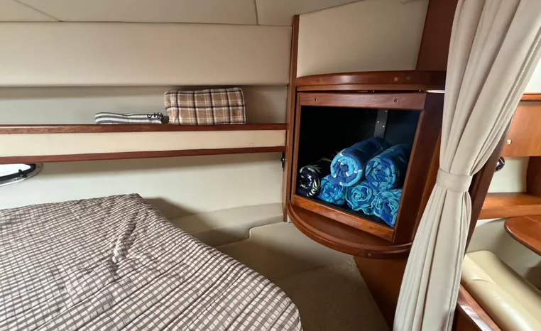 The Cruisers 3470 Express comes available with two well-thought-out layouts and features smooth, precise handling in both stern drive and inboard power. Her interior accommodations, boasting six feet, five inches of headroom throughout, will sleep up to six comfortably. The forward stateroom features a double bed with easy access, and a privacy curtain - or an optional bulkhead and door - providing complete privacy. Aft, owners can select either a fixed double berth or an alternate layout with a convertible circular settee. With the settee layout, this area can effectively lengthen the salon into one wide open living space or, with the privacy curtain, it can serve as a comfortable midcabin. The facing dinette to starboard easily converts into another berth. To port of the companionway is a full-service galley with a large refrigerator / freezer, microwave, and double-burner electric stove. The 3470 also provides a spacious head with a large, separate shower stall and full standing headroom. Abovedecks, the generous cockpit seating arrangement is ideal for dockside or on-the-water entertaining. She features a wetbar, cockpit shower, and available cockpit refrigerator or ice maker. A custom-fitted enclosure will keep everyone protected from the hot sun or inclement weather.