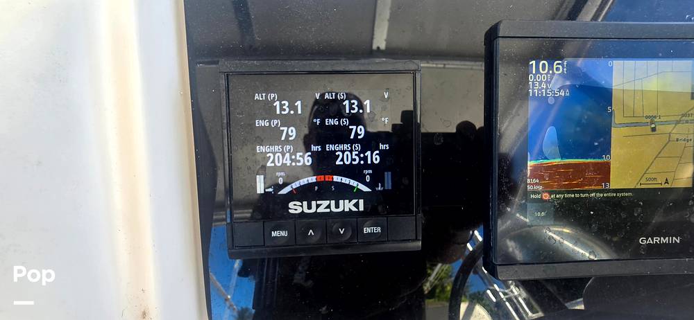 Electronics have been fully modernized with a Garmin GPSmap 7610sxv and a 9" Garmin installed in dash, paired with a 1000 ft transducer, a Garmin autopilot, Suzuki Engine management display, Icom ICM-330 VHF, and a Clarion Bluetooth stereo system for entertainment on the water.