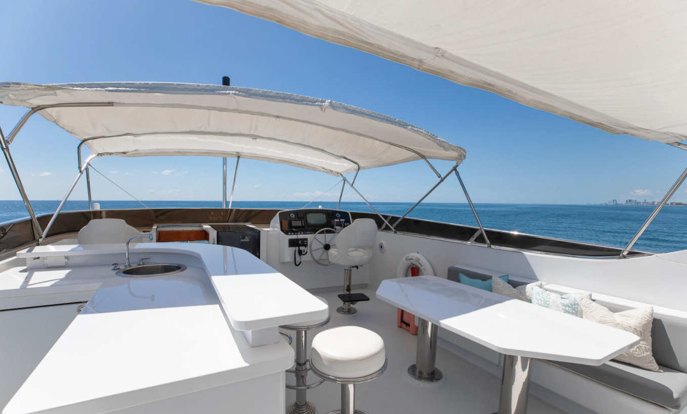 • Flybridge: Bar, dining area, starboard-side helm, tender storage