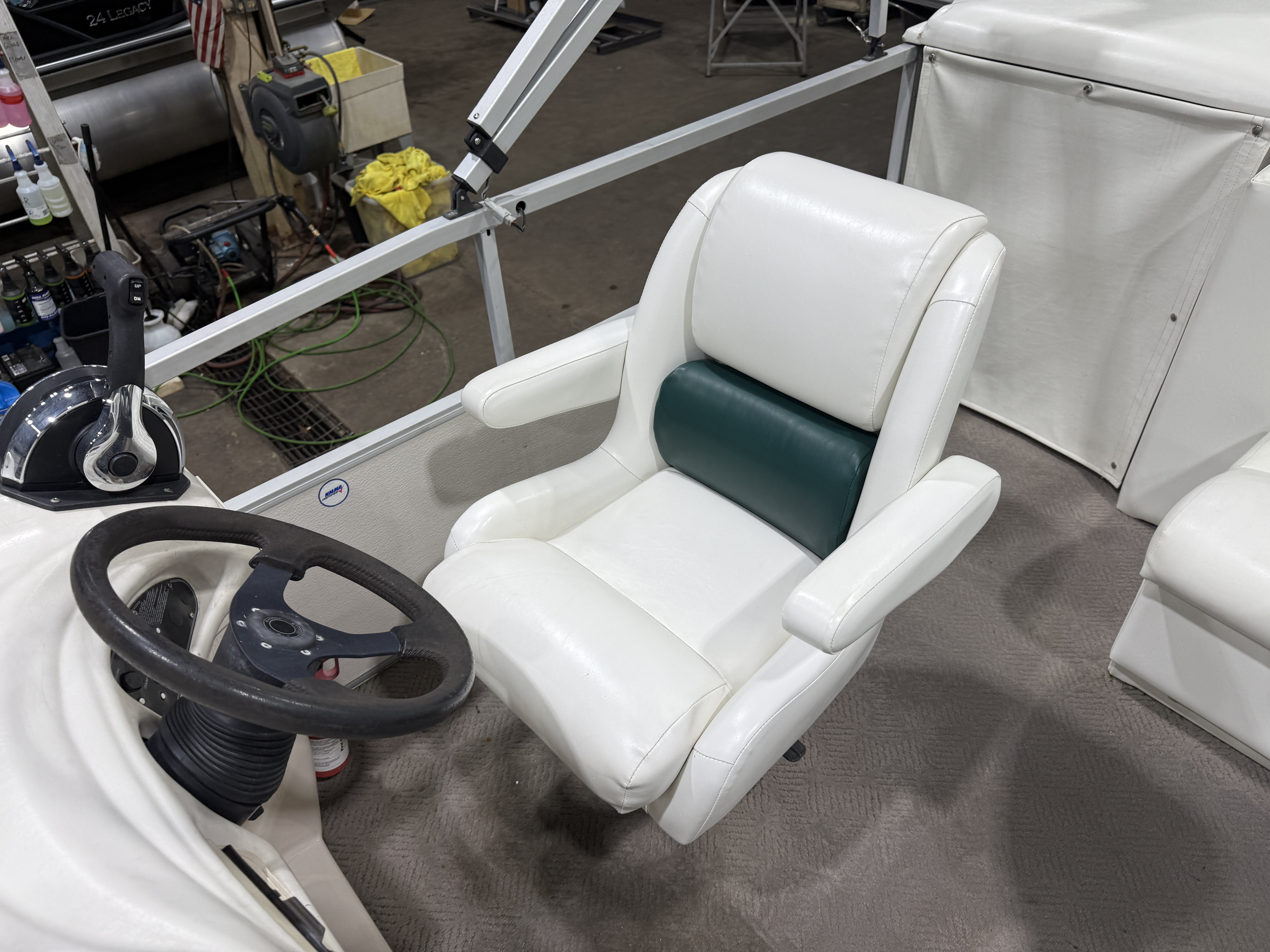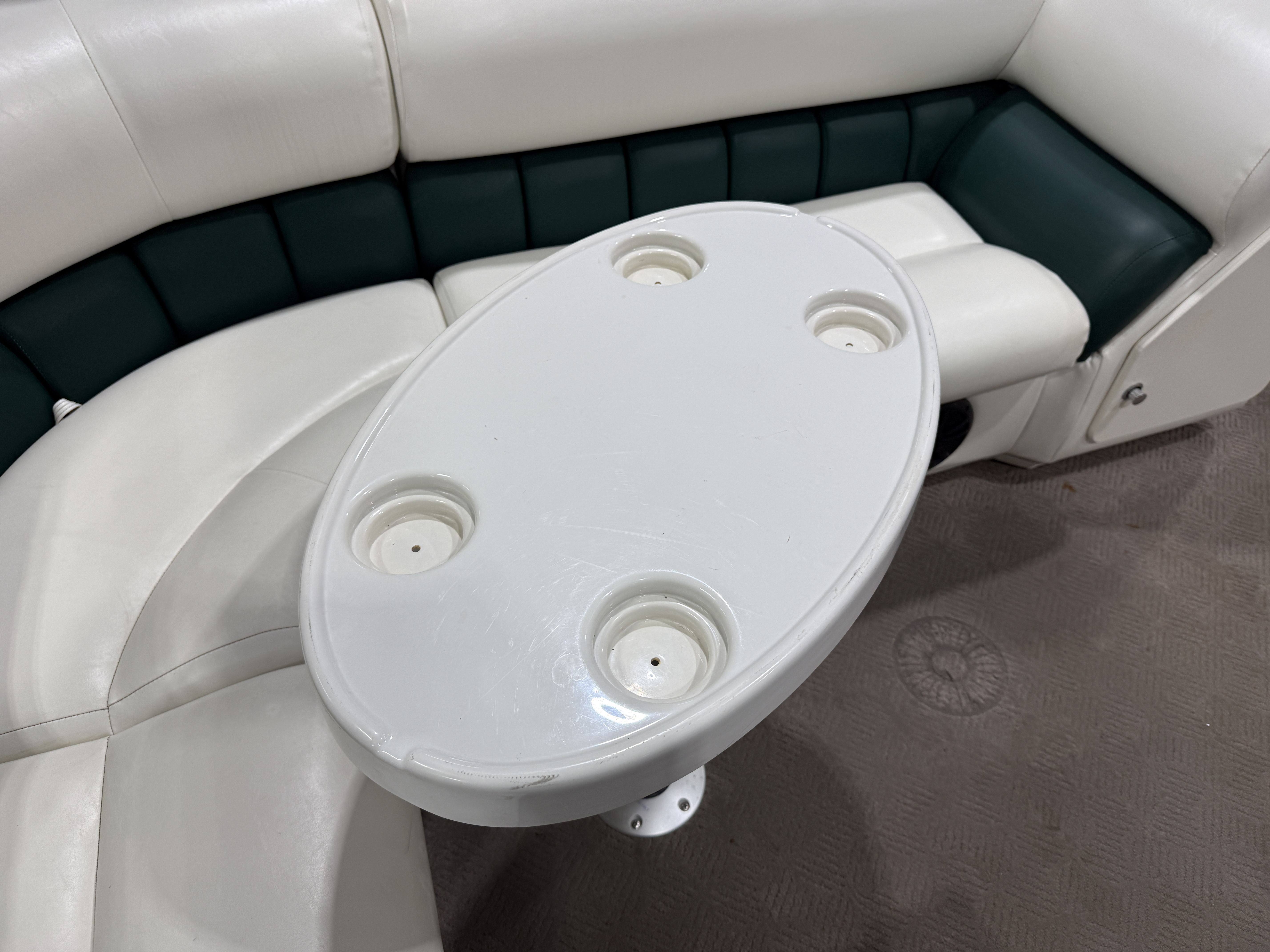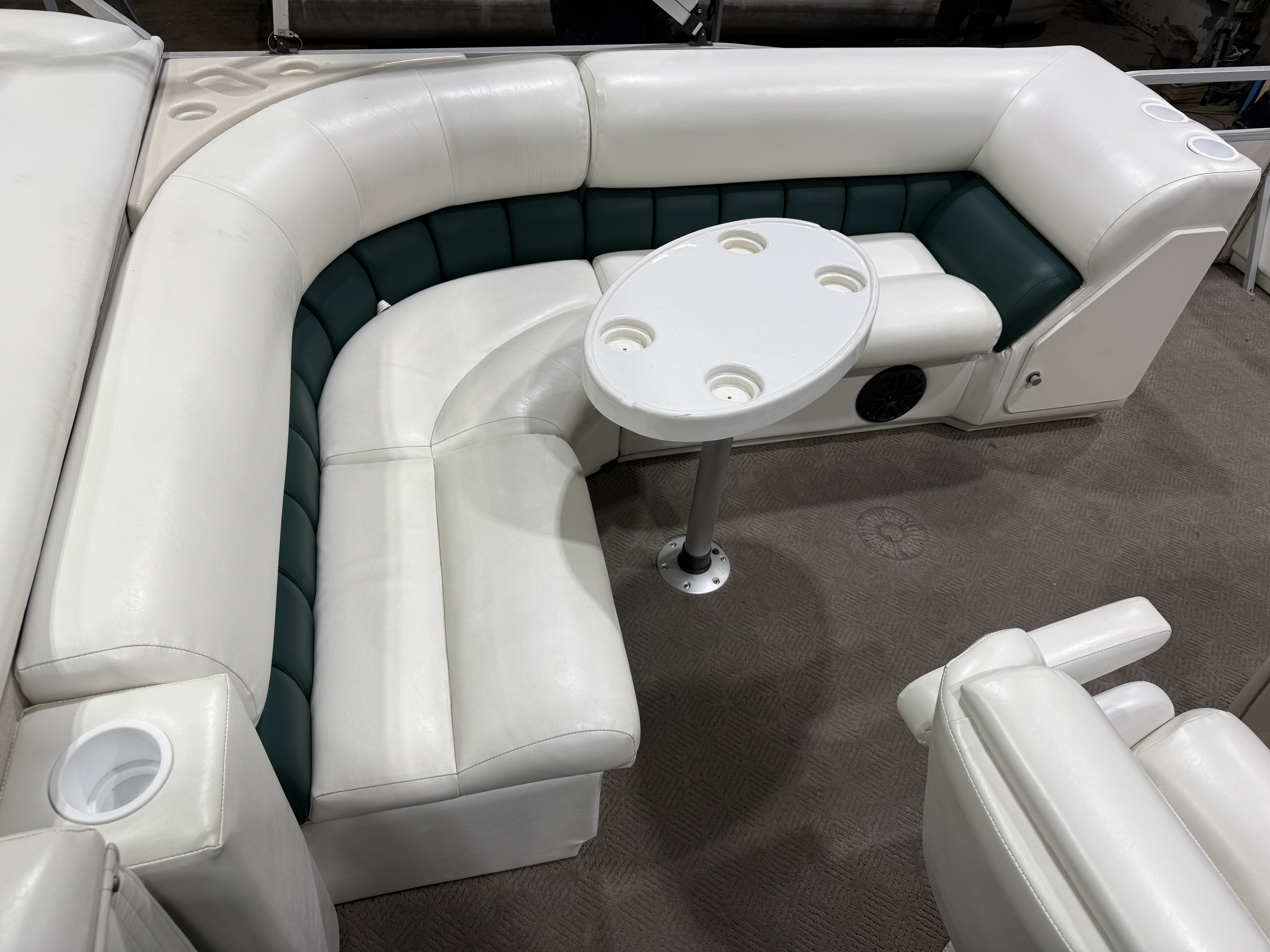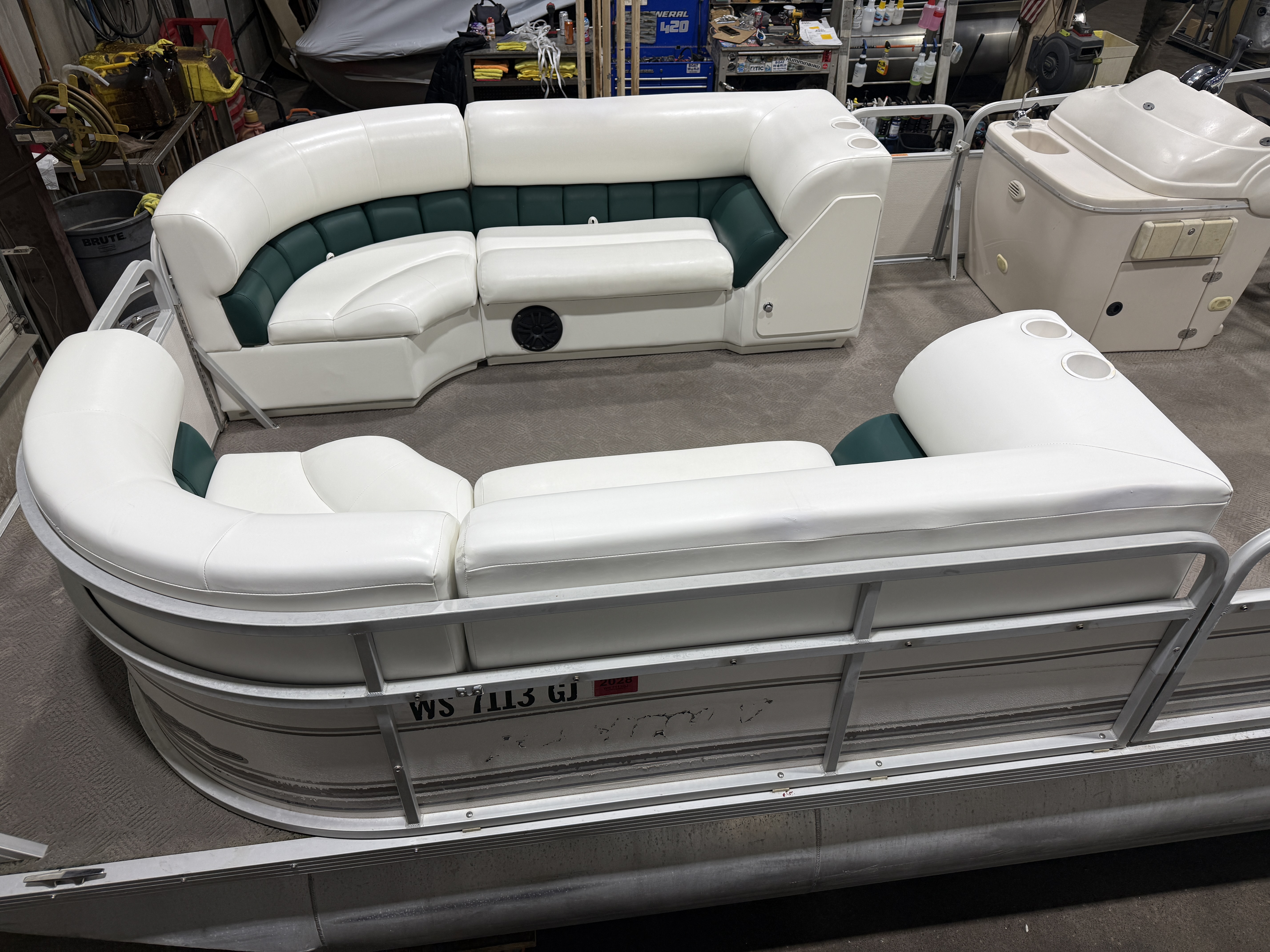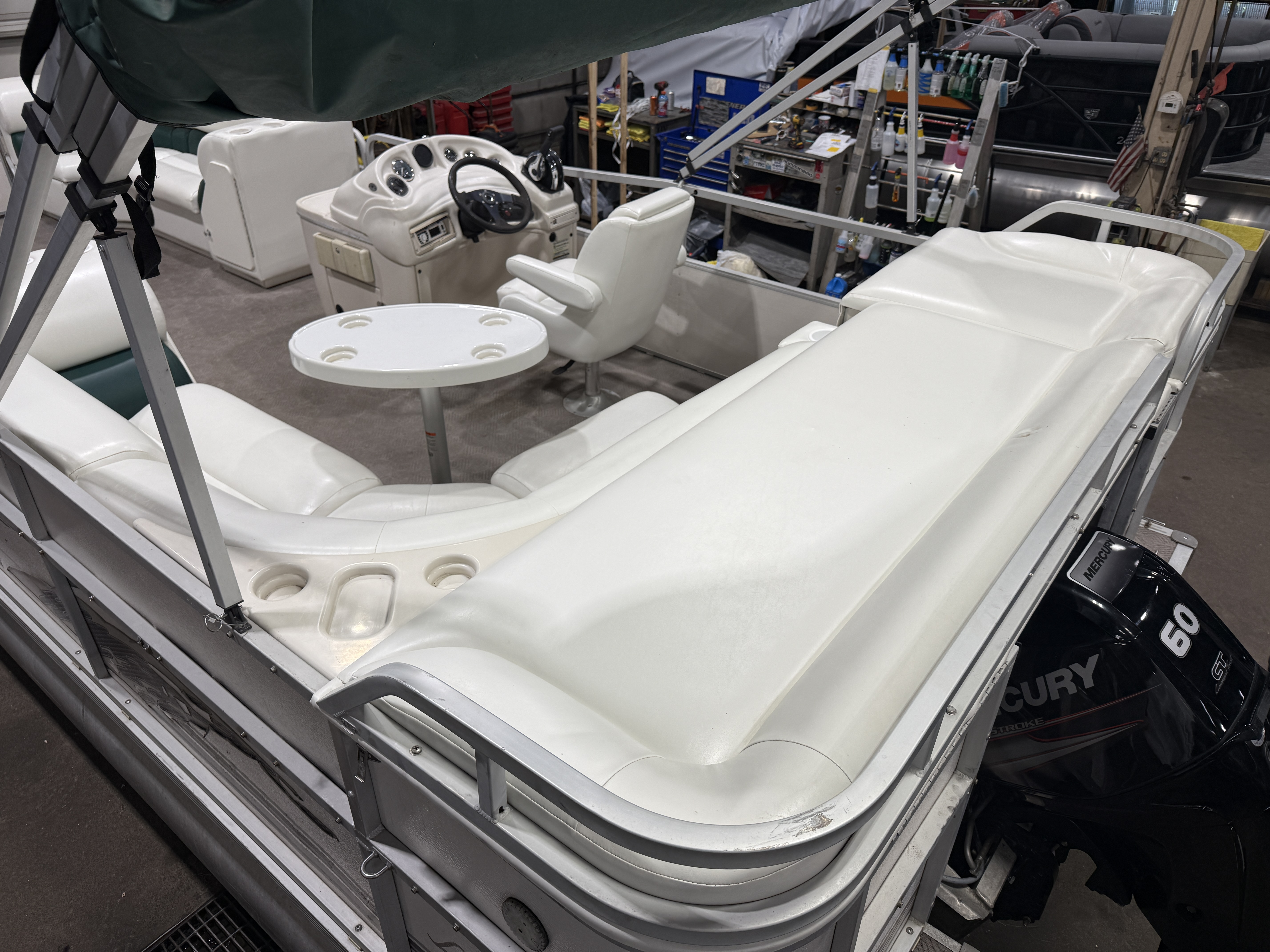 2001 Manitou Legacy 240 & 2017 Mercury Command Thrust Fourstroke EFI. Seating includes 2 lounge couches, L-shaped couch, captain's chair and sun deck. Features include in-seat storage, table, bimini top, courtesy light, docking lights, Bluetooth Stereo, Tachometer, Fuel, Volt and Trim gauges. Other features include sink with fresh water supply, storage compartments on lounge ends of couches with cup holders on top.