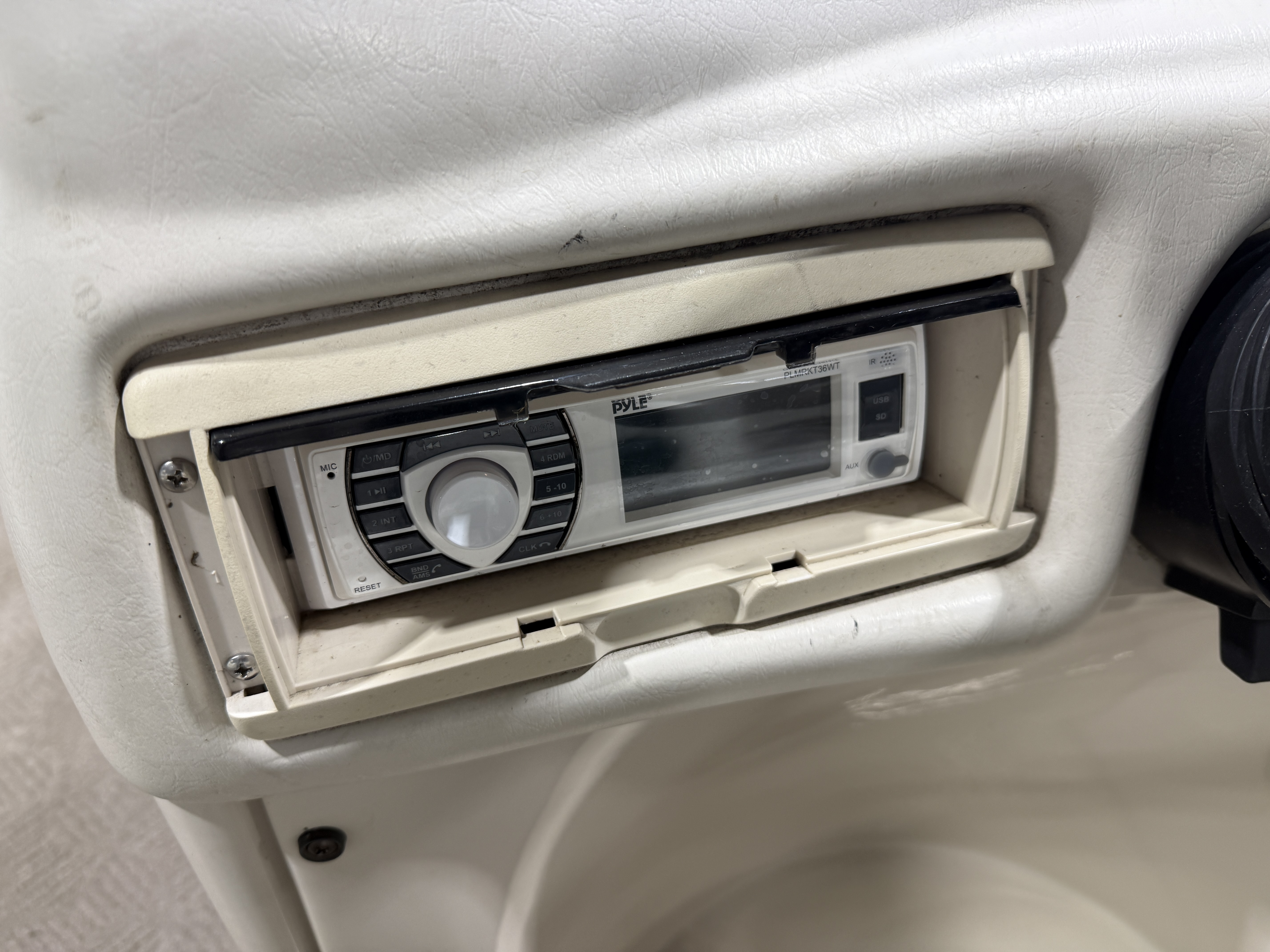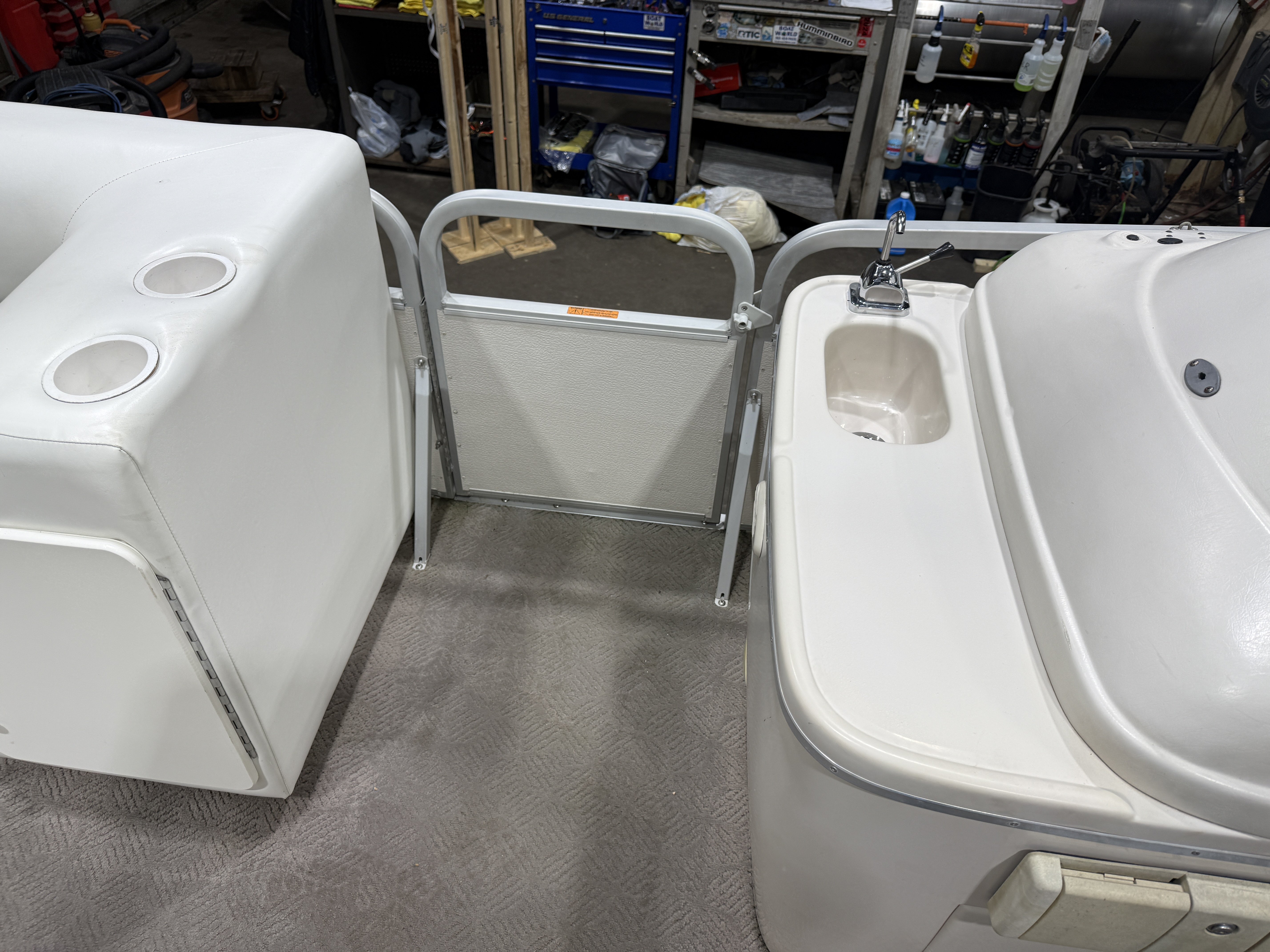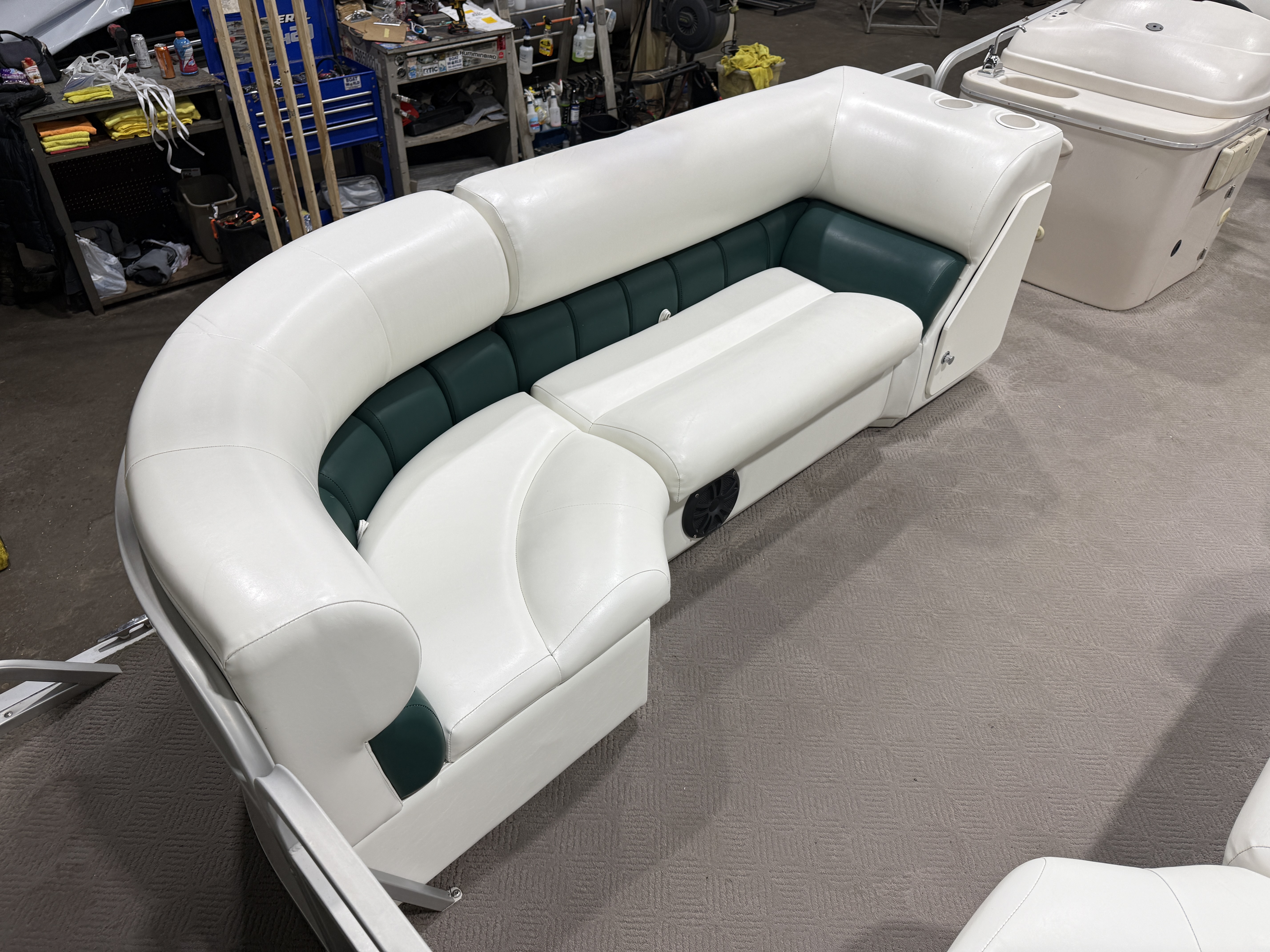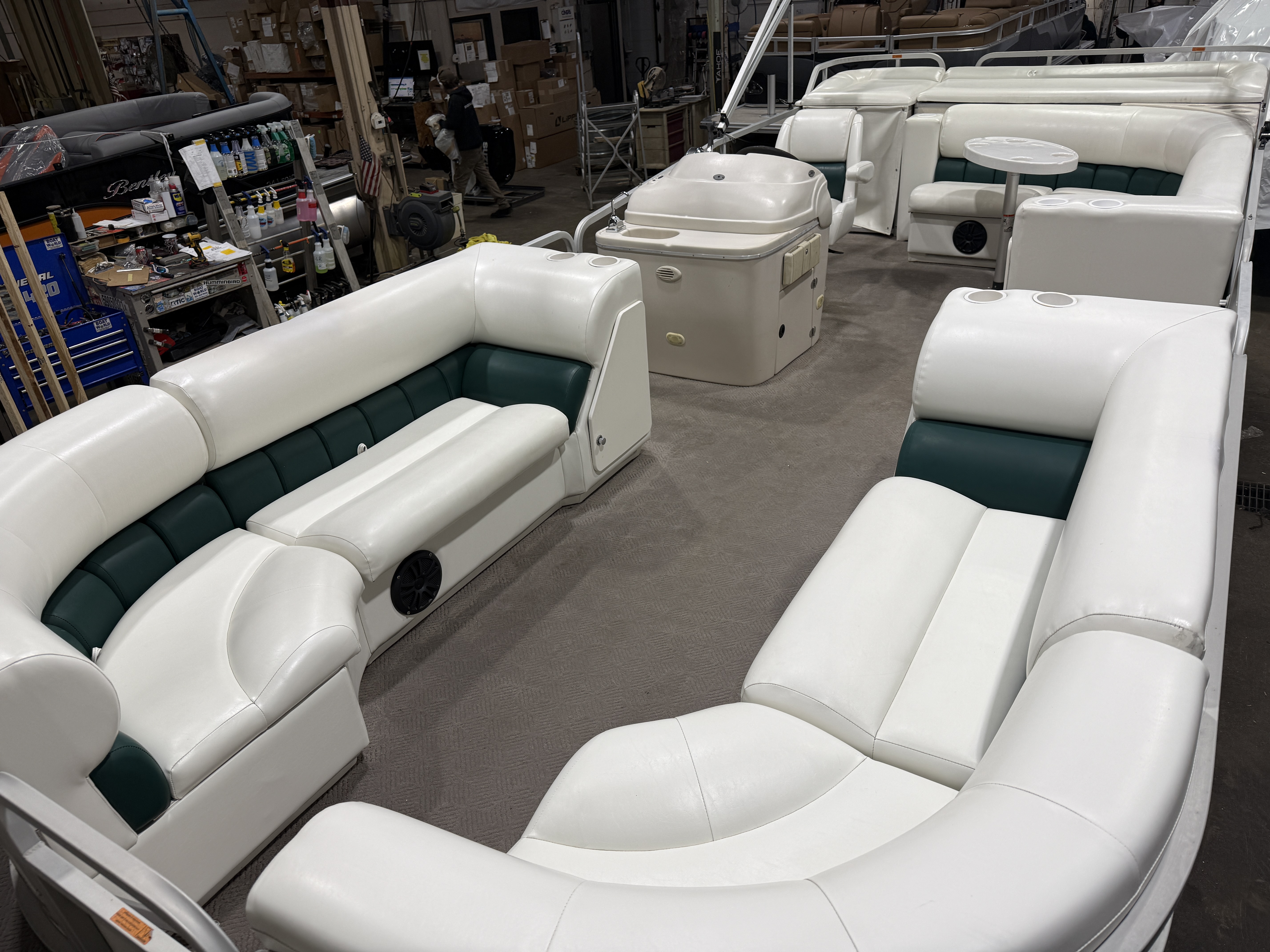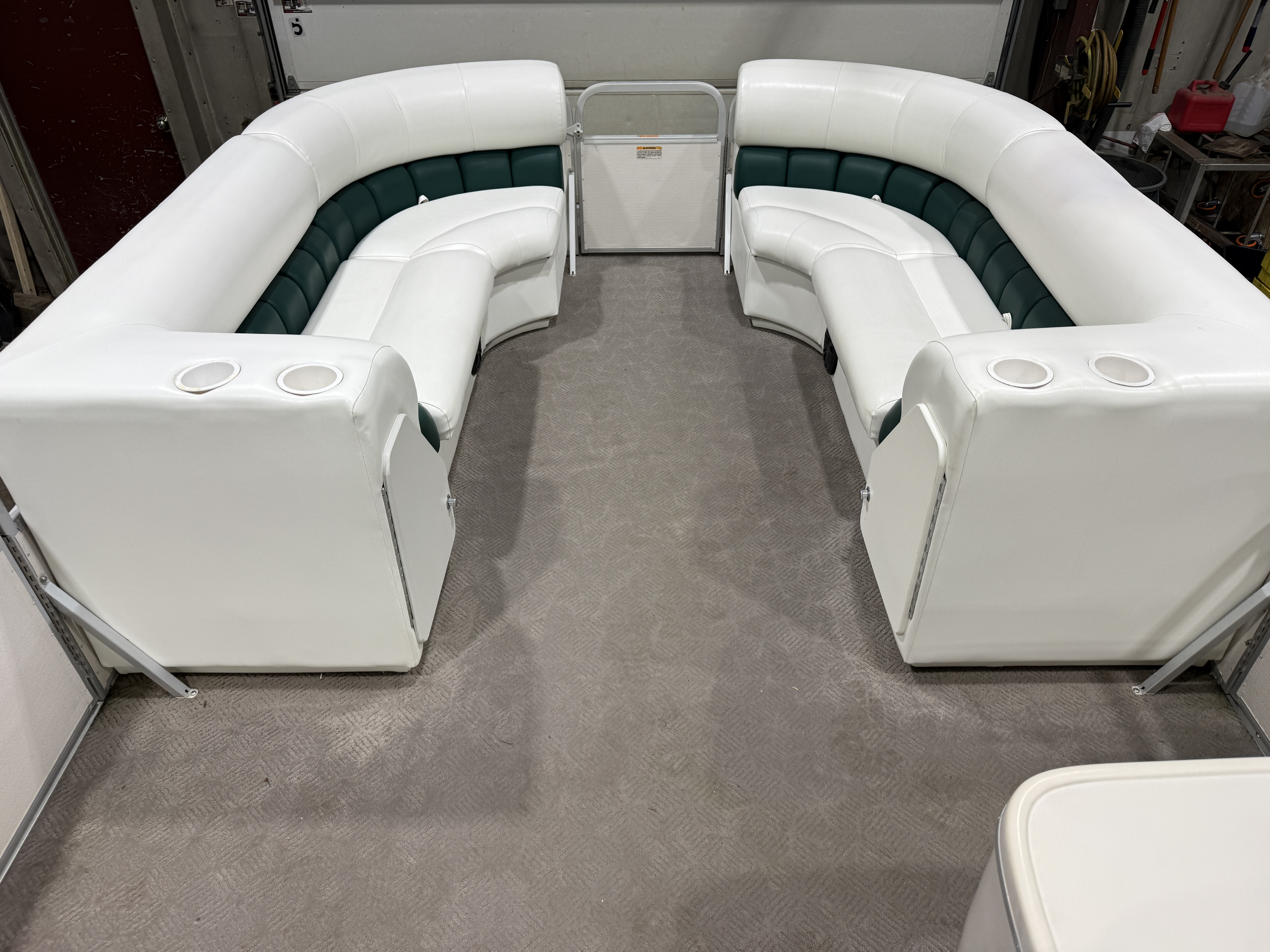 2001 Manitou Legacy 240 & 2017 Mercury Command Thrust Fourstroke EFI. Seating includes 2 lounge couches, L-shaped couch, captain's chair and sun deck. Features include in-seat storage, table, bimini top, courtesy light, docking lights, Bluetooth Stereo, Tachometer, Fuel, Volt and Trim gauges. Other features include sink with fresh water supply, storage compartments on lounge ends of couches with cup holders on top.