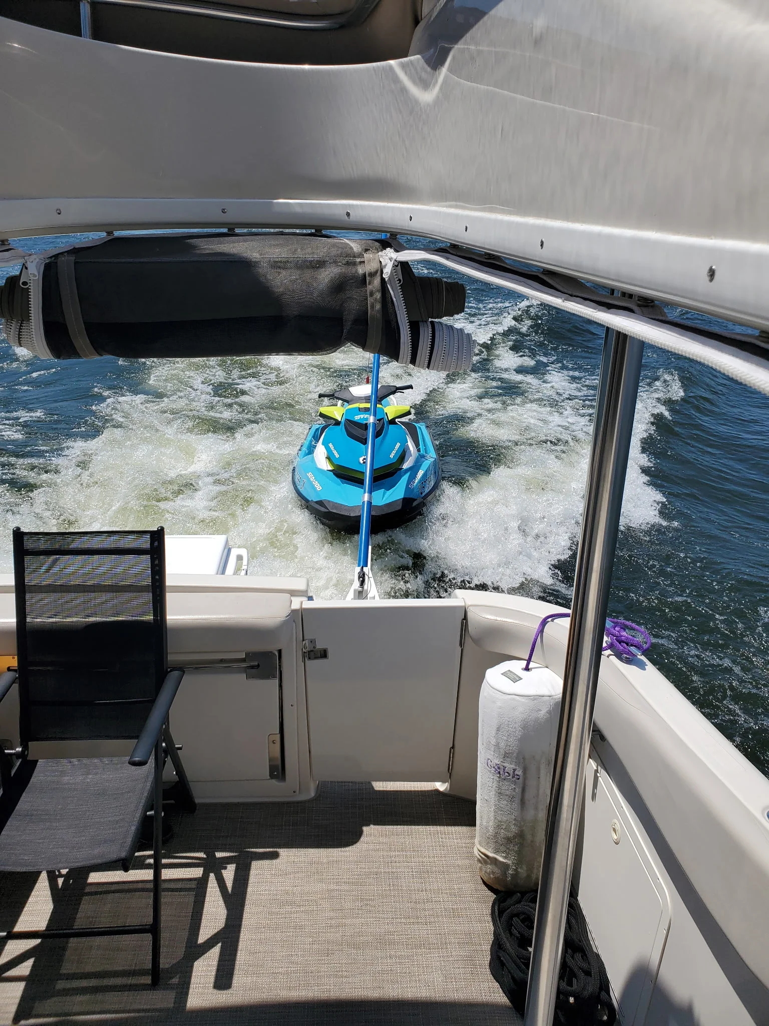 Recent upgrades include a brand-new three-bank battery charger, enhancing onboard reliability and convenience. Additionally, the boat comes equipped with a Magic Marine tow system, perfect for safely towing a jet ski or tender—adding versatility and fun to your time on the water.