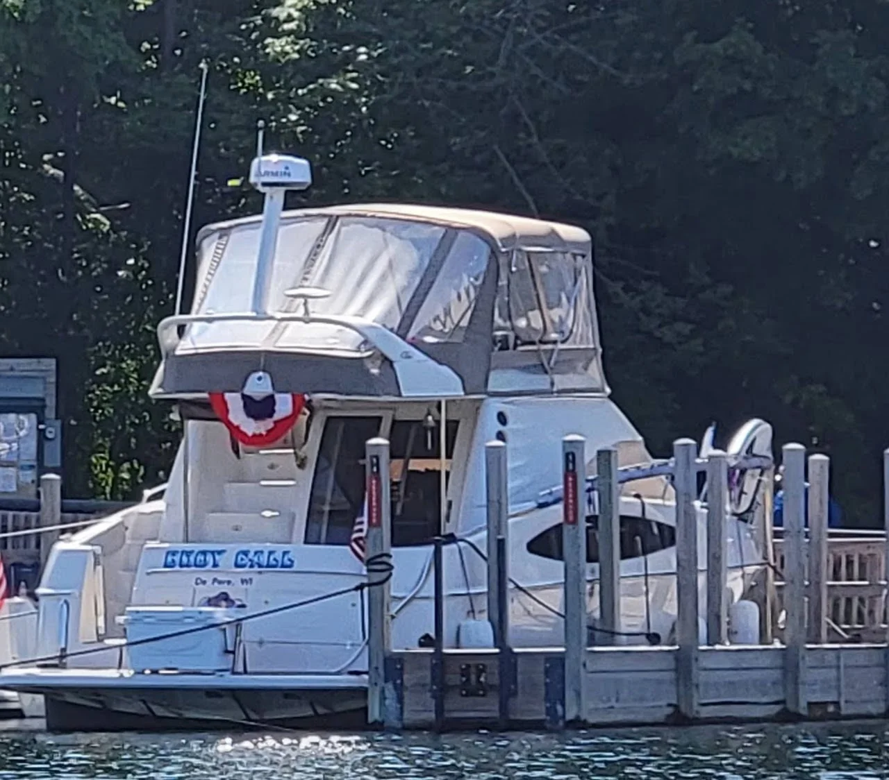 Powered for smooth, confident cruising, she offers a spacious cockpit ideal for entertaining and a beautifully appointed cabin with rich cherry cabinetry, generous seating, and comfortable overnight accommodations.