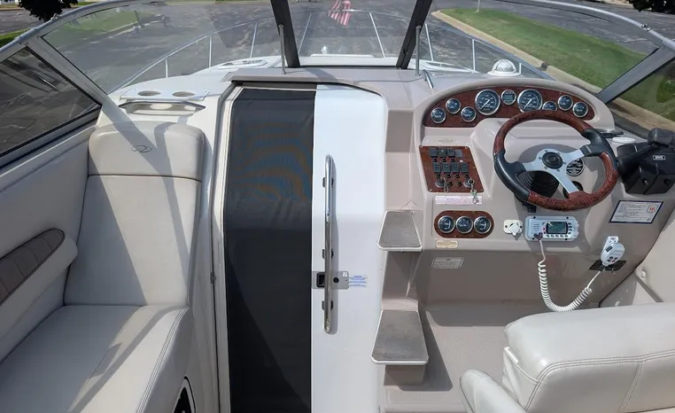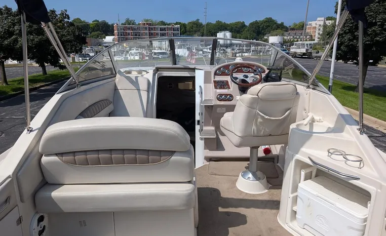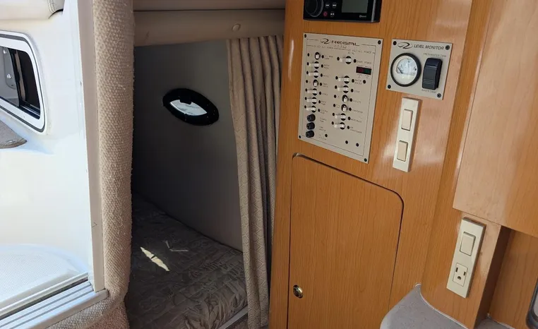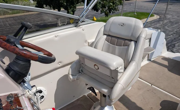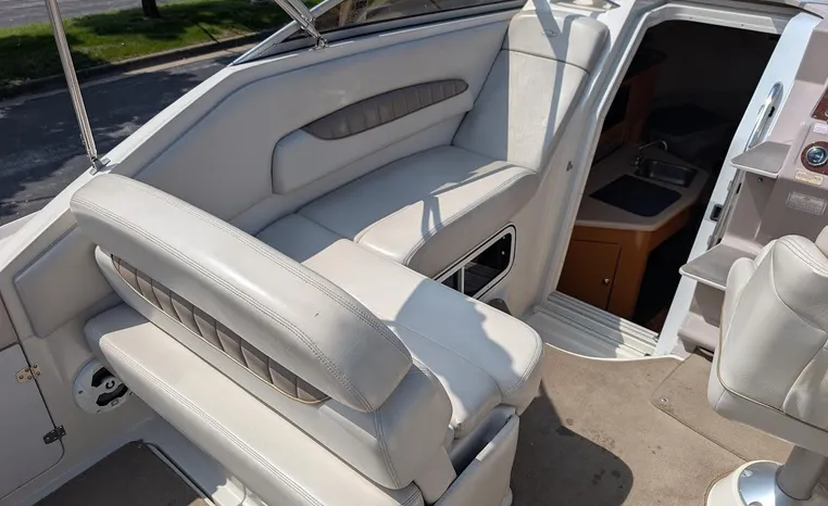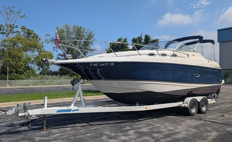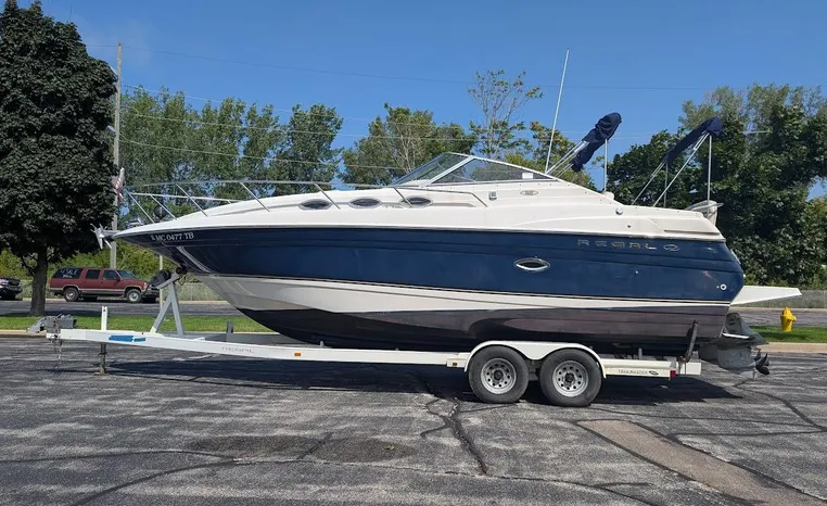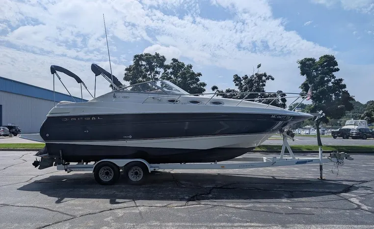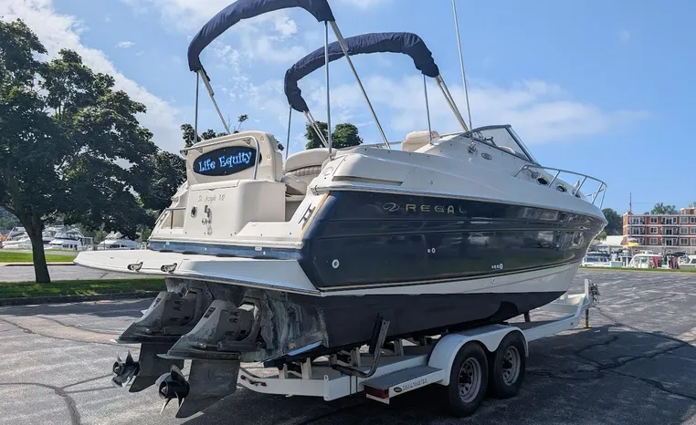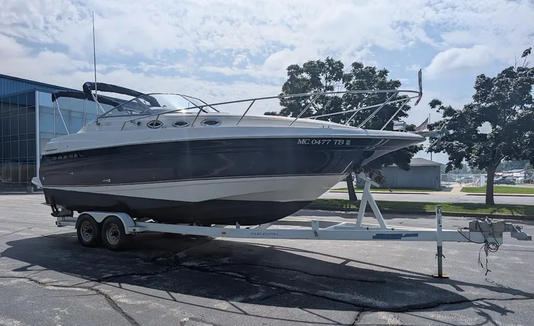 Tandem Axle Trailer included! Twin Volvo V-6's. Luxurious, sporty and spacious, this Regal 2660 Commodore also features the option of trailering to your summer destinations! The cockpit is neatly arranged with a large companion lounge -- with reversible seating -- bucket helm and comfortable aft bench. The cabin layout features a traditional vberth/dinette lounge, plus galley and mid-cabin.