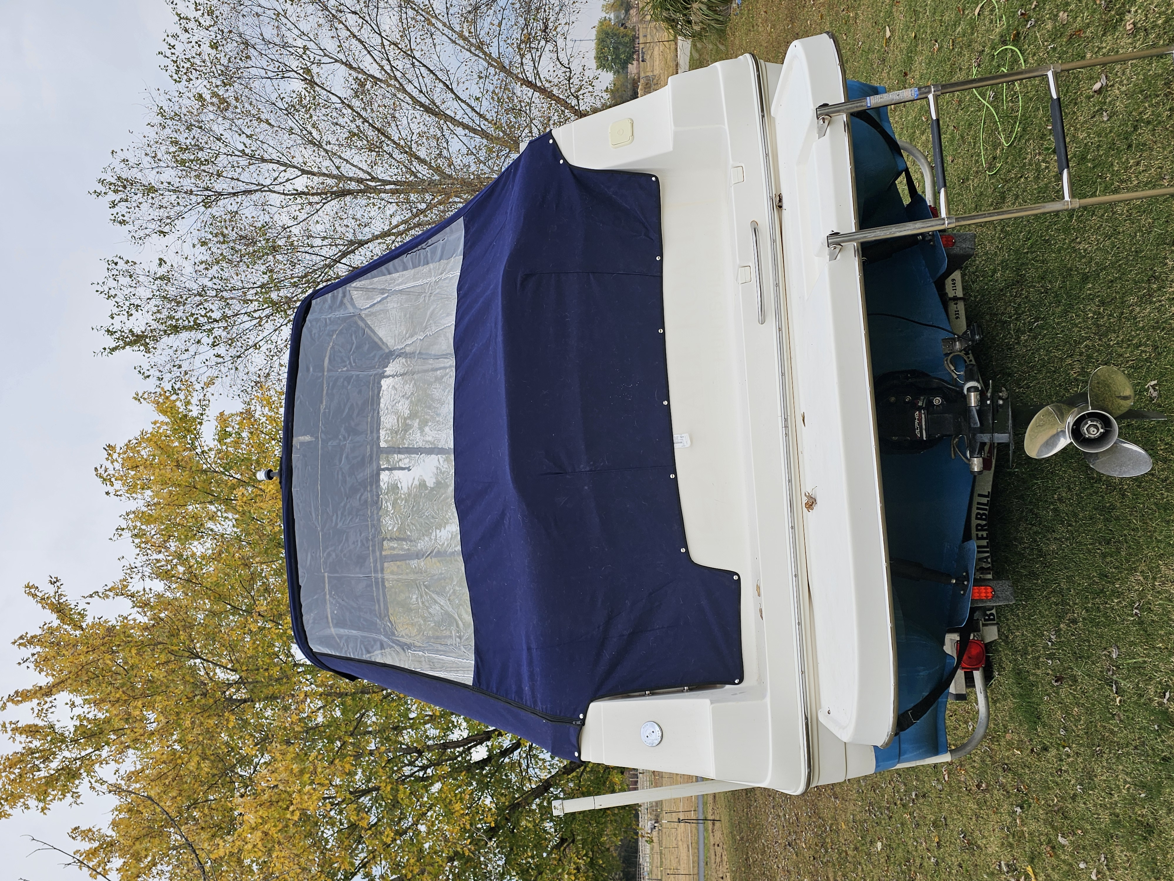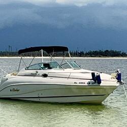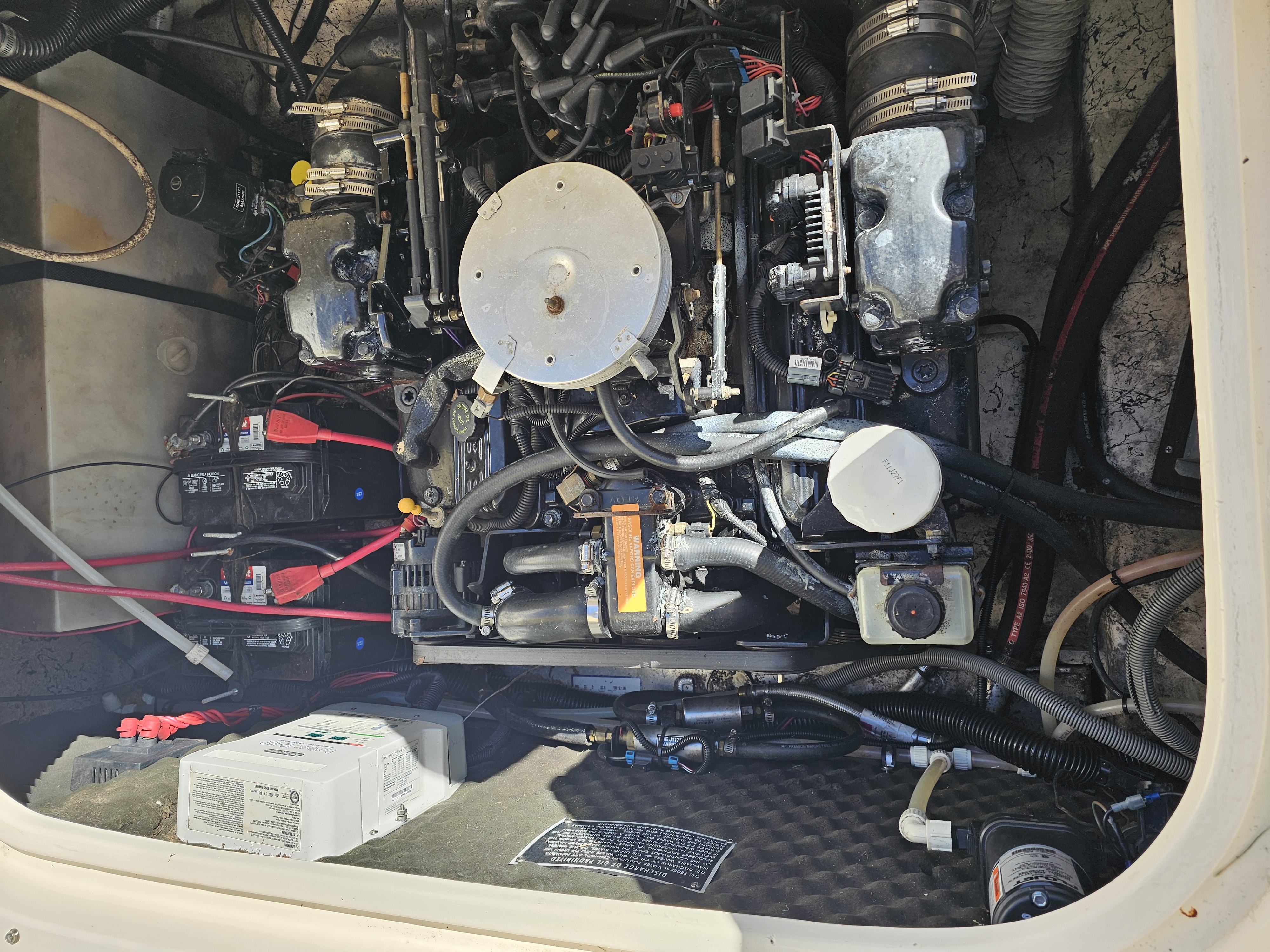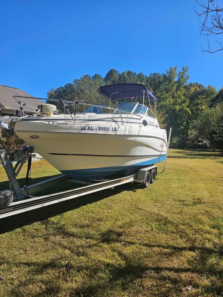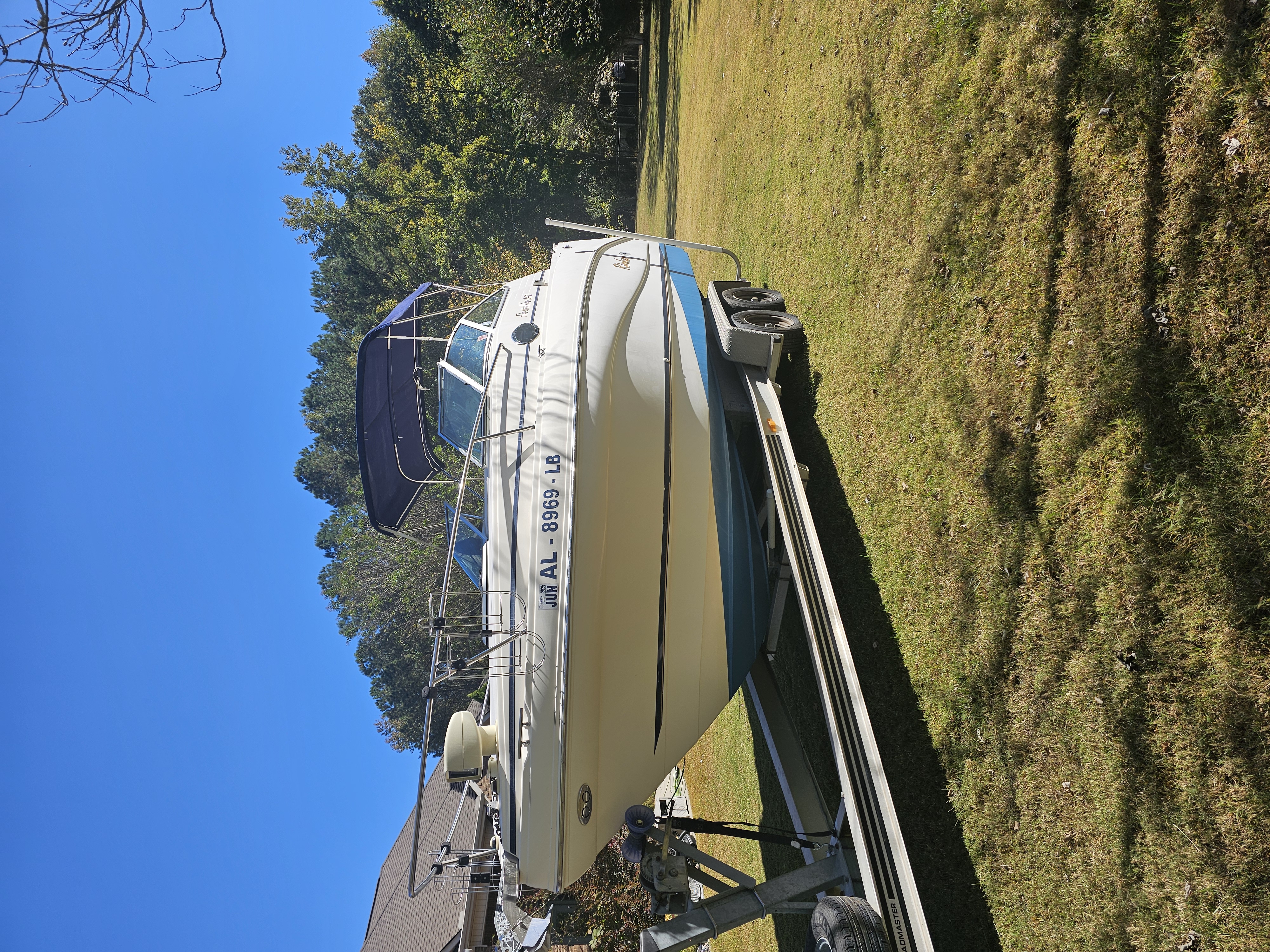 Trailer-able weekender, 24.5 ft Cuddy with 8'6 beam, it is legal to tow but yet has the room on the inside for a great boat to stay on with all the amenities of a larger boat. Swim platform and ladder. Ample seating and new Sunbrella Bimini Top and new Sunbrella full camper cover. V-berth with new bottom paint, full private head and shower. Bed in galley area and full underfloor bed. Powered by a 5.0 EFI Mercruiser with fully serviced Alpha one outdrive with just 214 hours Full of accessories: Twin batteries with charger/conditioner, microwave, refrigerator, stovetop, sink with hot water. Water and Waste tanks with hot water heater. Engine heater. Hummingbird Helix 9 GPS/Sonar. Spare 4 Blade SS Prop. Bennett Marine Auto Trim Pro GPS based automated Trim Tab system. Have uninstalled Cabin AC. Have all parts but don't know condition. https://youtu.be/CruJRMOoAAg?si=1BwUIWXEMe5smwoW Very rugged 2004 Loadmaster Aluminum trailer with 5 new loadrange D tires. Fully serviced April 2025, Oil and filters, outdrive impeller and all bellows, shift cable and seal kits all new. Runs perfect.