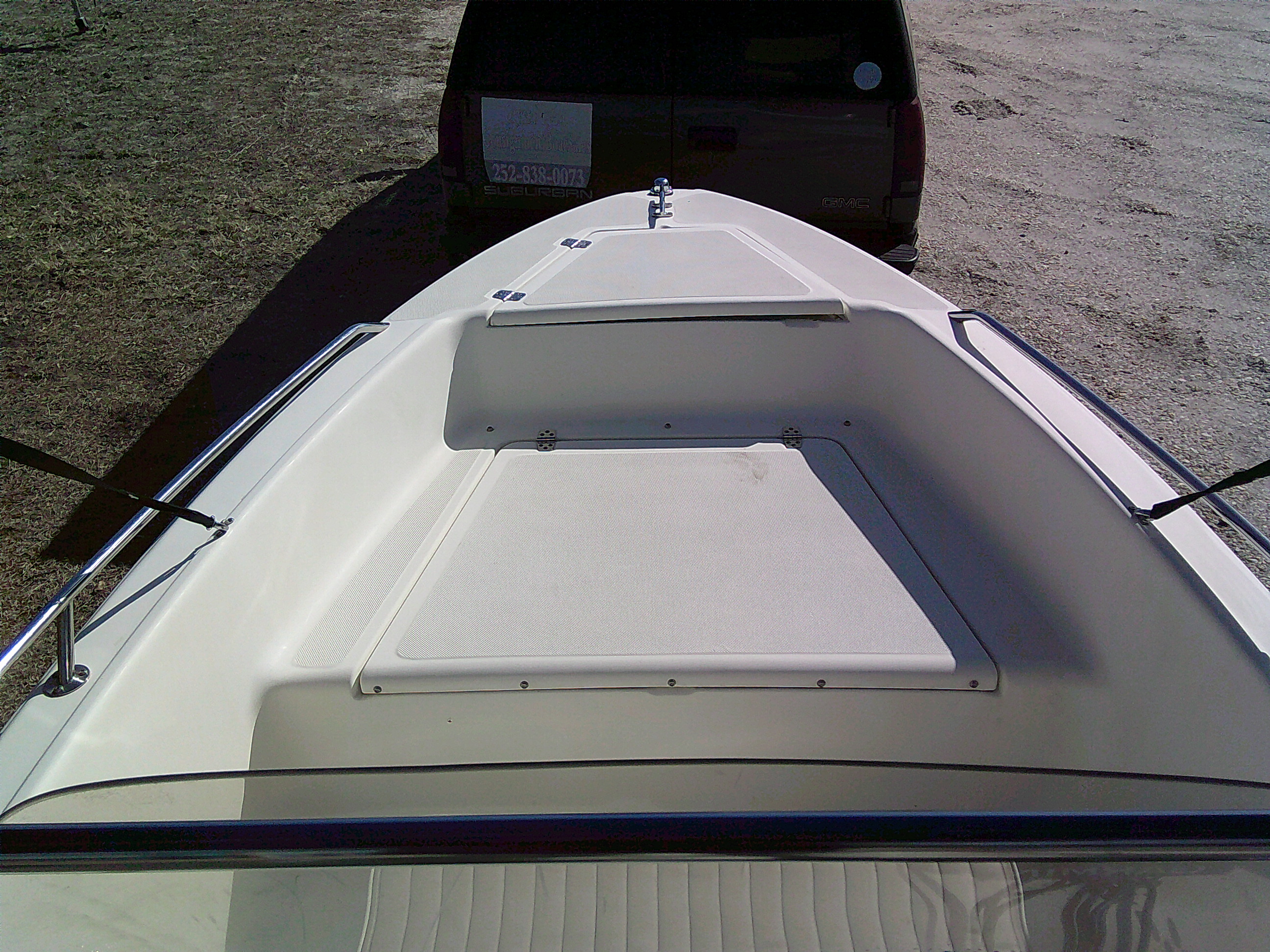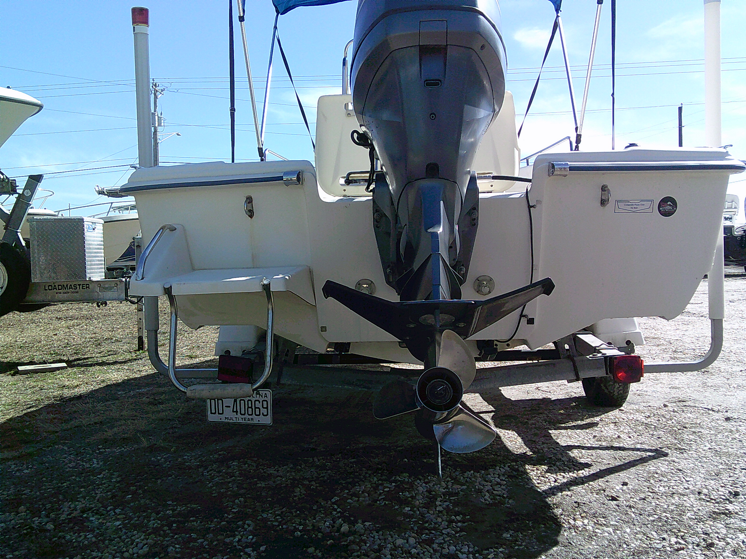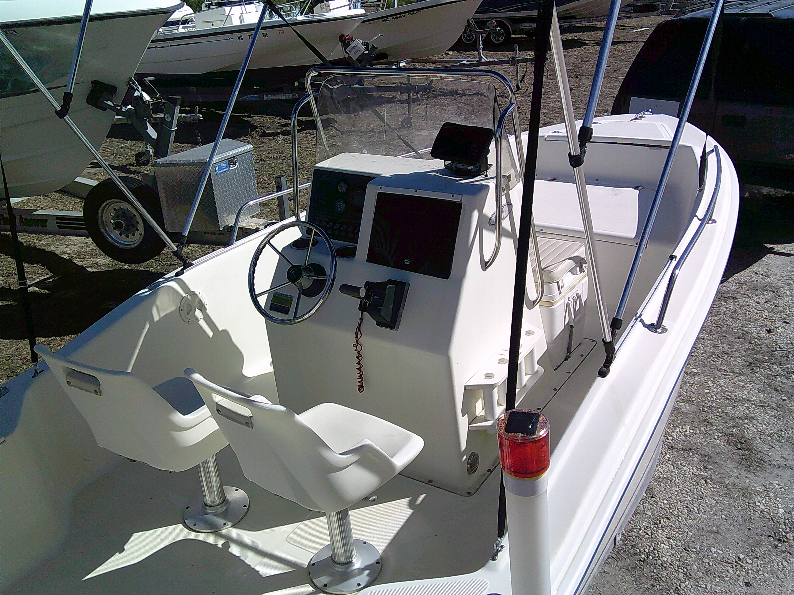 Boat Features: Large Forward Platform, Perfect for Throwing a Cast Net, Fishing or Sunning / Anchor Locker w/Anchor, Chain, Line / Large Forward Storage Box / Forward of Console Cushioned Seat/Cooler w/Back Rest / Grab Rails / Console w/Wind Screen, Grab Rails, Storage, Stainless Steel Helm and Electrical Box / Two Cushioned Swivel Helm Charis / 4 In Gunnel Rod Holders / Two Aft Storage Boxes / 2 Batteries w/Switch / Self Bailing Deck / Swim Platform w/ladder.