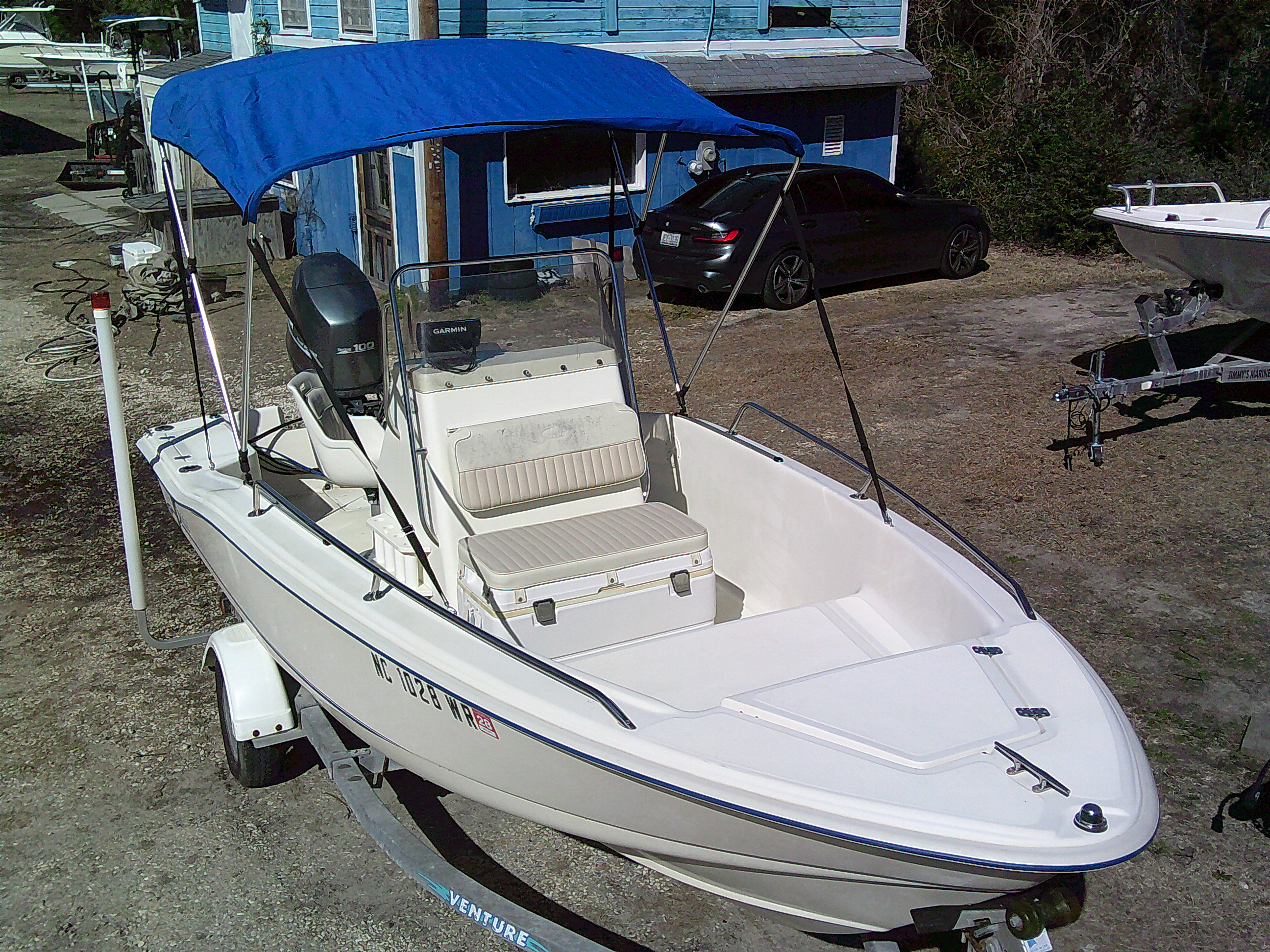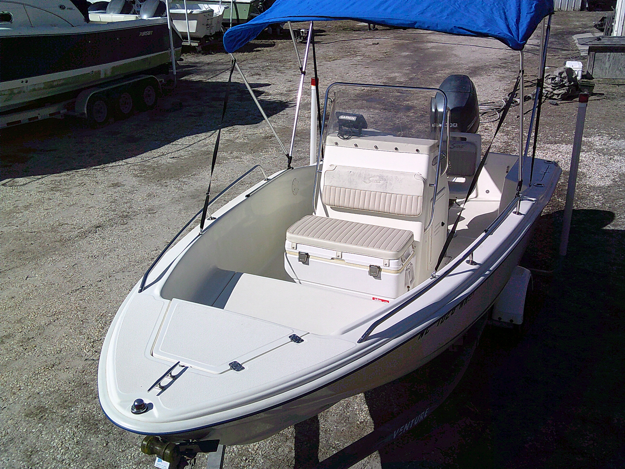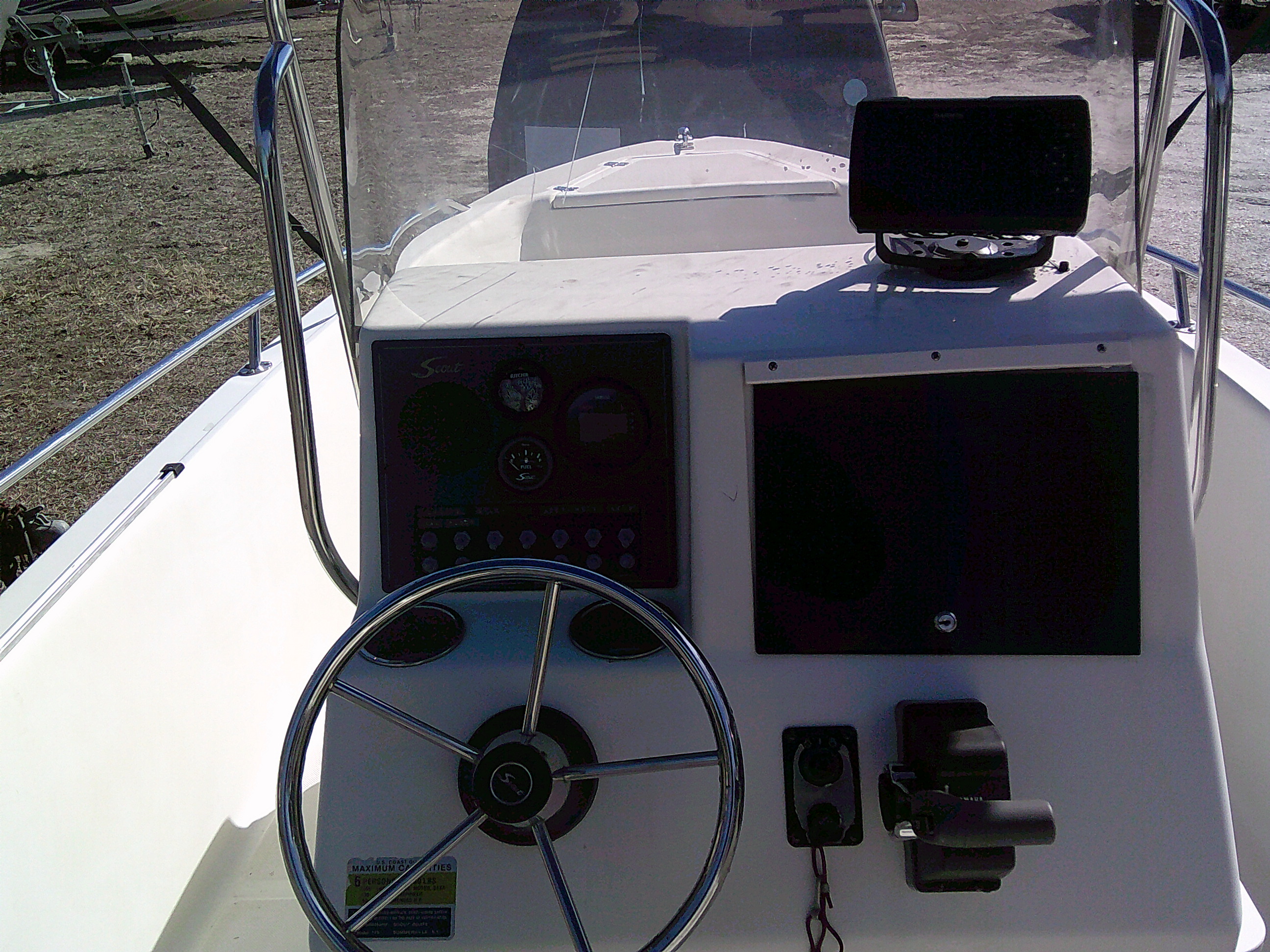 Boat Features: Large Forward Platform, Perfect for Throwing a Cast Net, Fishing or Sunning / Anchor Locker w/Anchor, Chain, Line / Large Forward Storage Box / Forward of Console Cushioned Seat/Cooler w/Back Rest / Grab Rails / Console w/Wind Screen, Grab Rails, Storage, Stainless Steel Helm and Electrical Box / Two Cushioned Swivel Helm Charis / 4 In Gunnel Rod Holders / Two Aft Storage Boxes / 2 Batteries w/Switch / Self Bailing Deck / Swim Platform w/ladder.