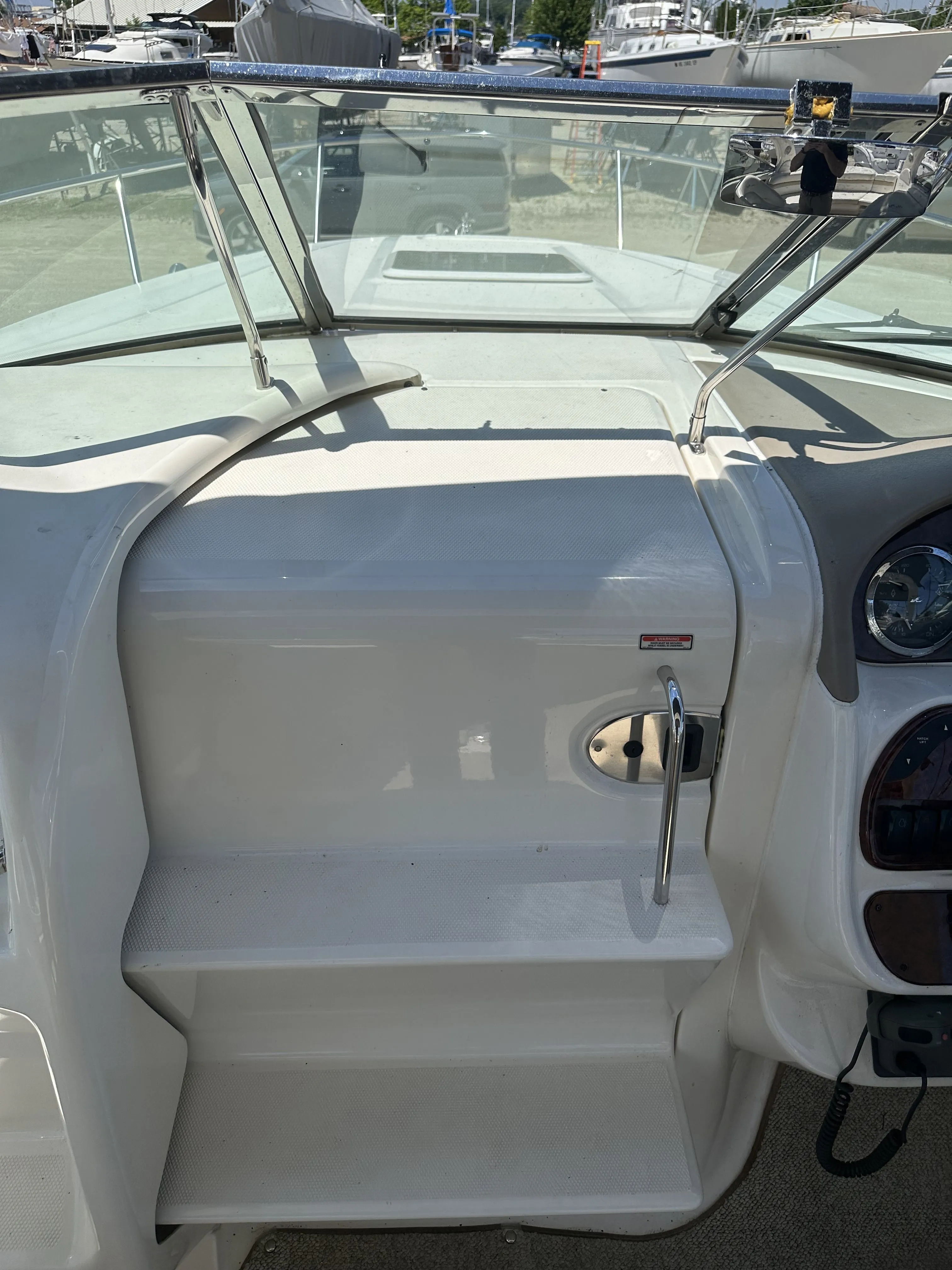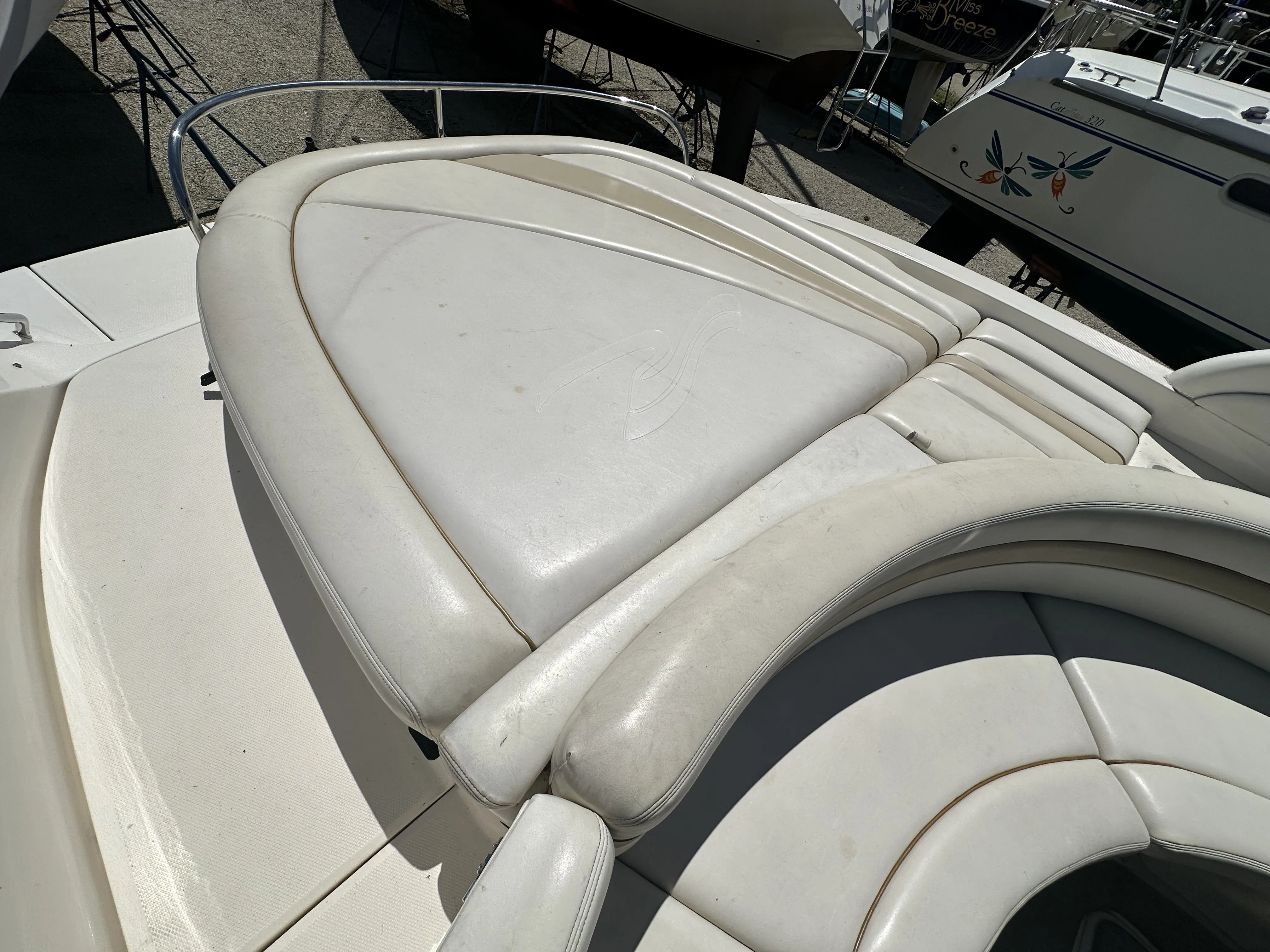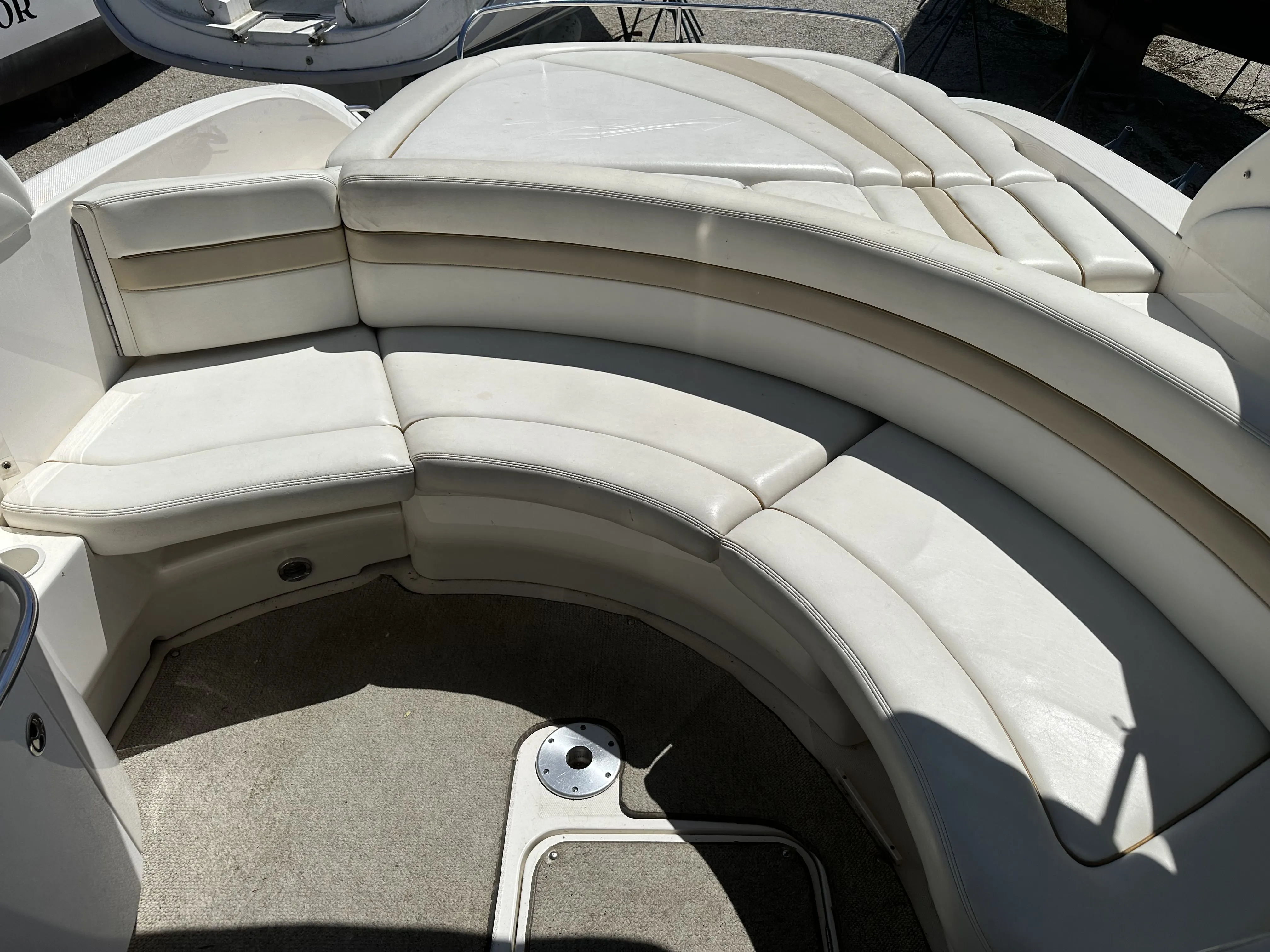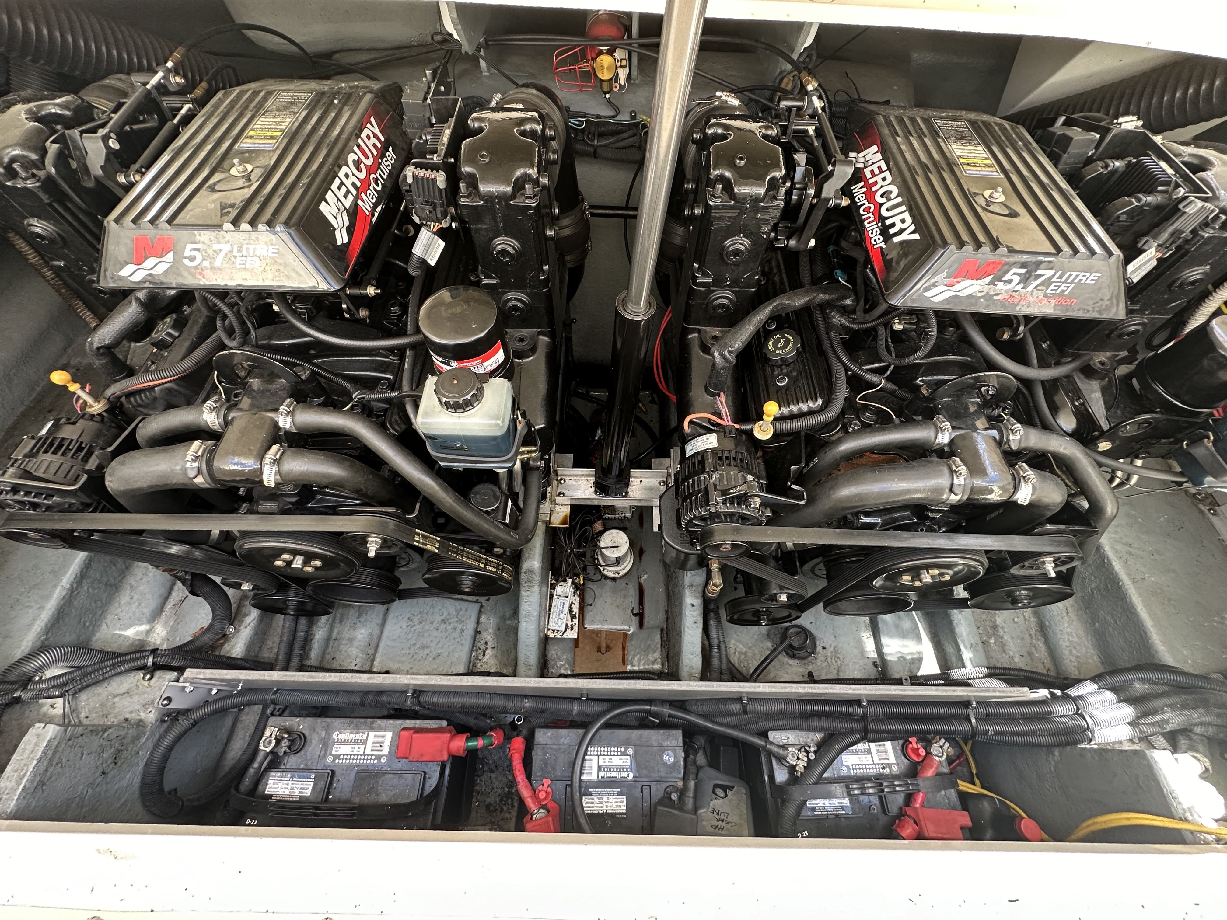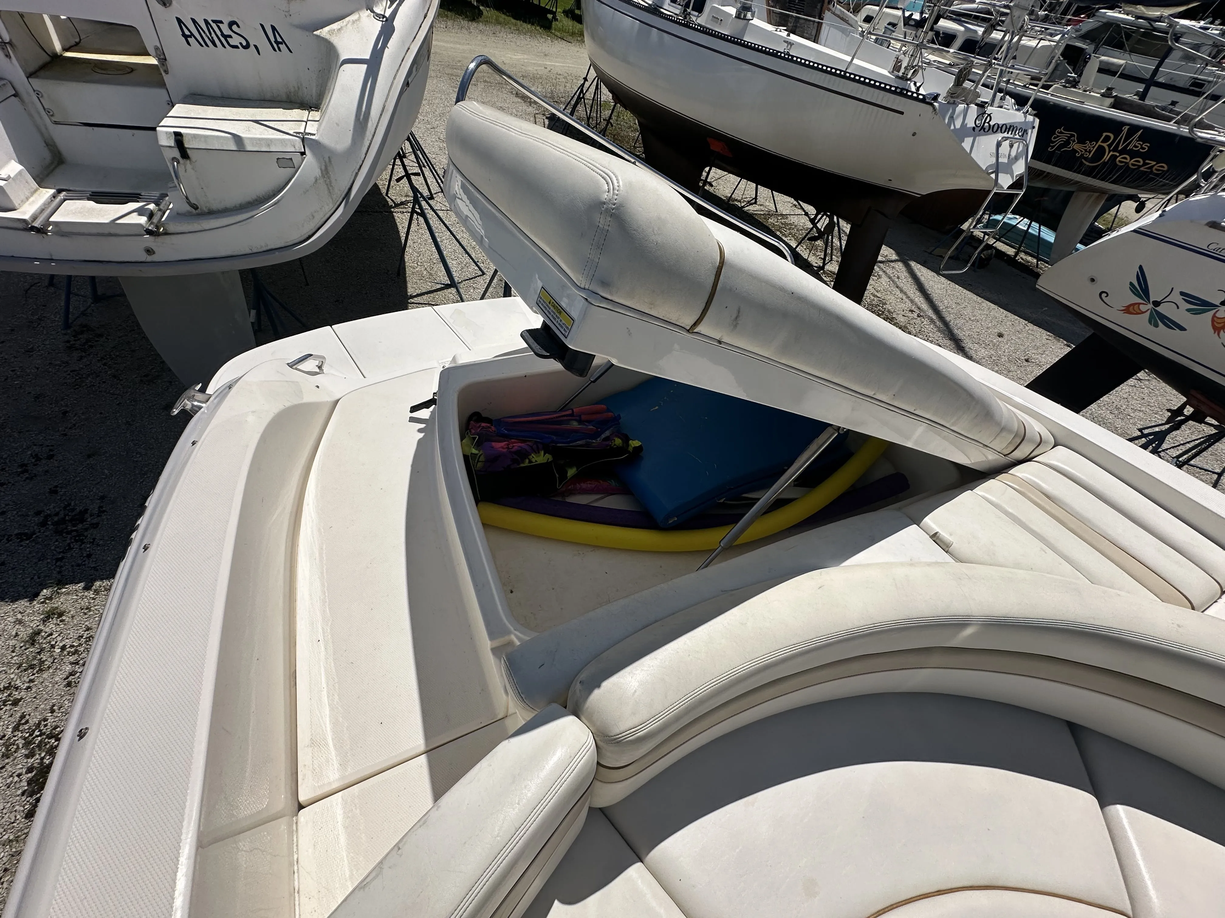 Highlights include separate enclosed vacuflush head, electric windlass, and on board refrigerator. Incredible seating topside with large aft sunpad. Other recent improvements are the Raymarine GPS and bottom paint. Repowered in 2017 port / 2024 stbd. The Mercruiser 5.7EFI BII Engines have had limited use. The boat has approx 870 hours on it total. Trailer included. Call to schedule showing today! Trades considered.