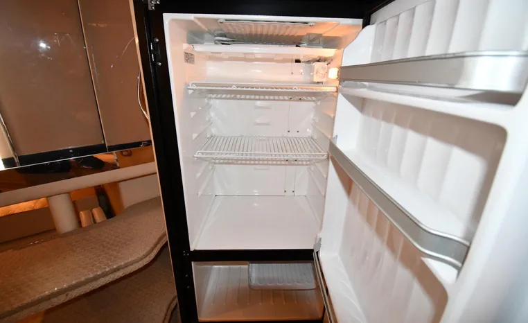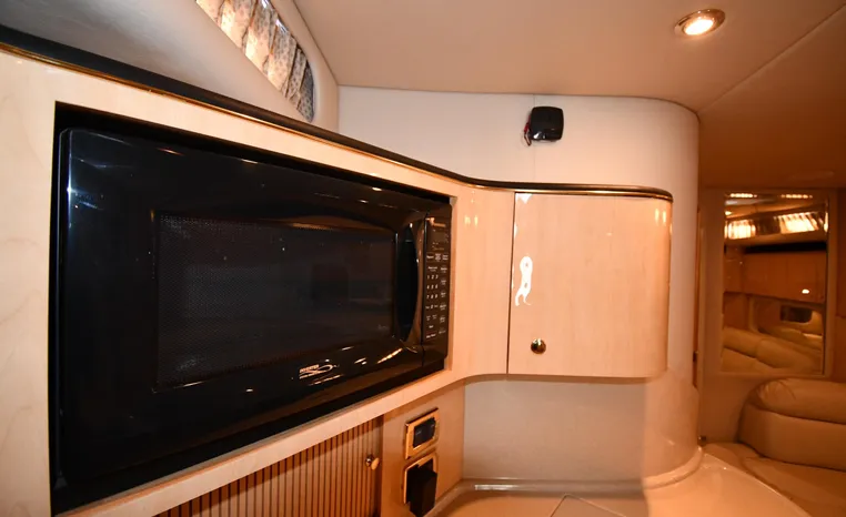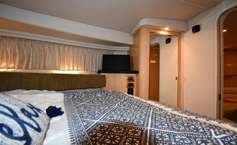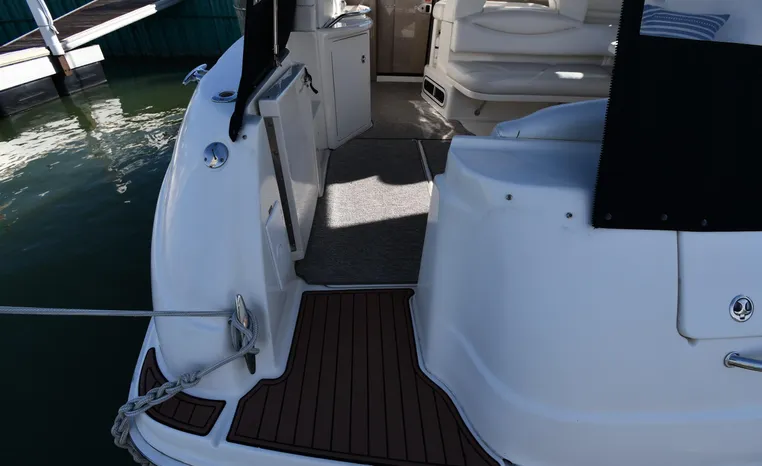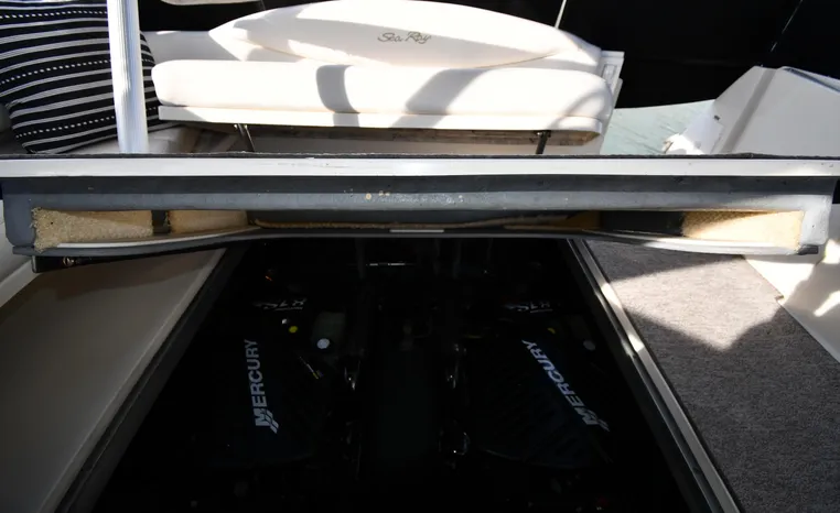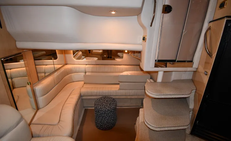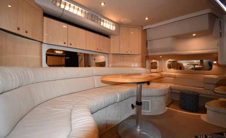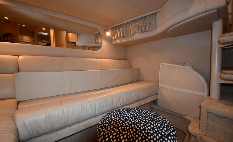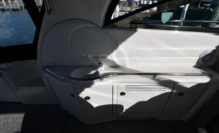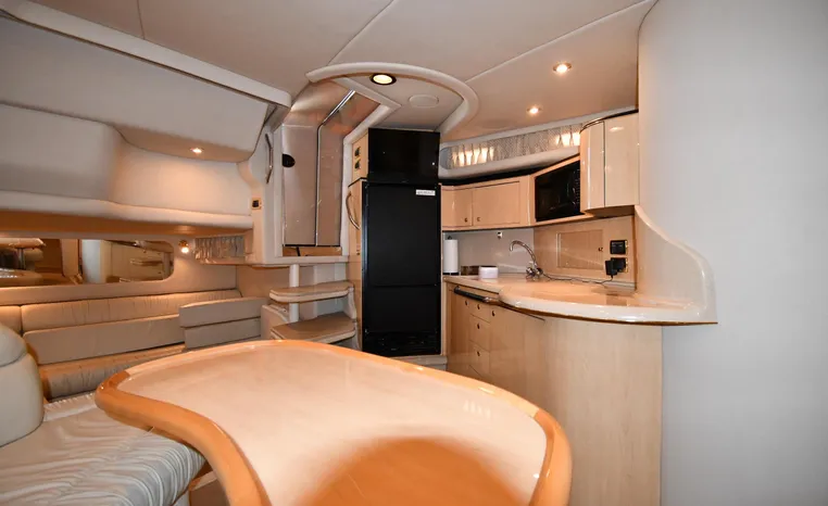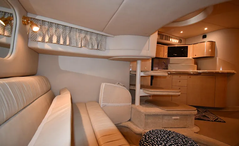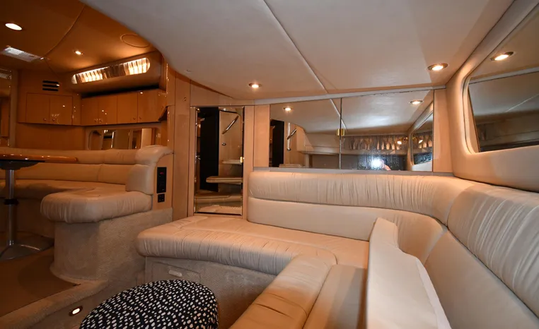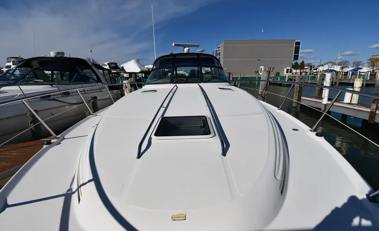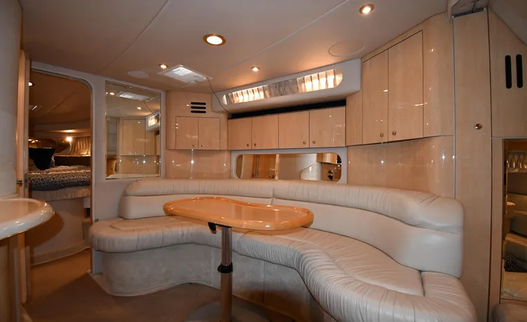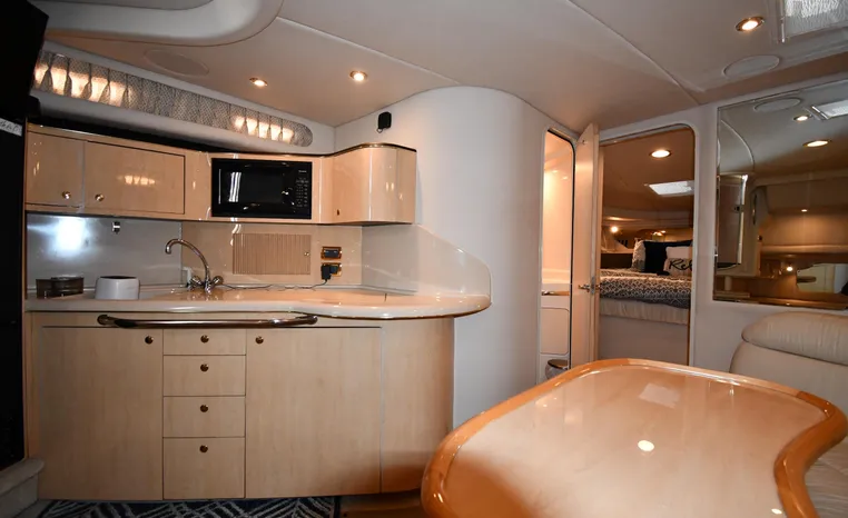 Great styling has long been a Sea-Ray trademark, and while few American spor-tboats are as glamorous as their European counterparts, the quality found in late-model Sundancers is second to none. Built on a fully-cored deep-V hull with a wide beam, few imports can match the spacious interior of the 380 Sundancer with her superb galley (including a full-size refrigerator), excellent storage, and wide-open floor-plan. The layout is typical of most Sundancers with double berths fore and aft and a sofa in the salon that converts to a double berth for extra guests. The mid-cabin stateroom serves as a conversation area during the day, then electrically converts into a bed at night. A door separates the forward stateroom from the main cabin, while a curtain provides privacy for the mid-cabin. On deck, the spacious cockpit provides wraparound seating for 6-7 adults and comes with a wet bar, fender storage, and a removable table that converts into a sun-pad. An electric hatch provides access to the engine compartment.