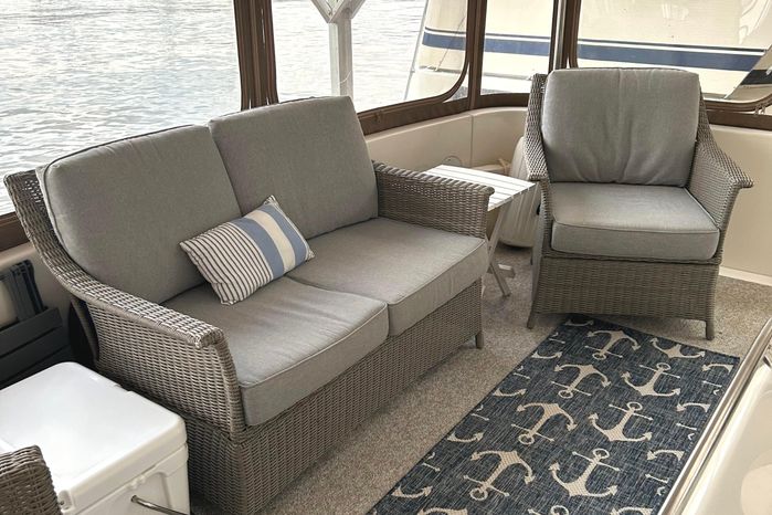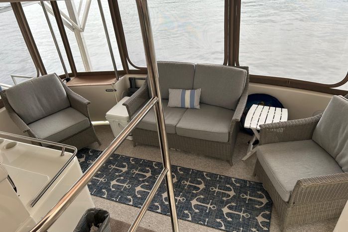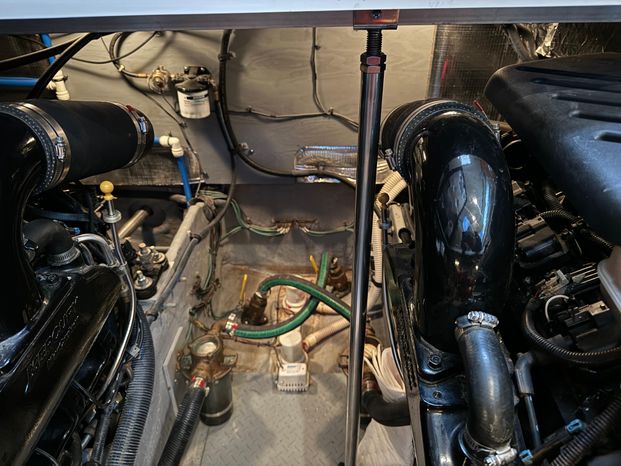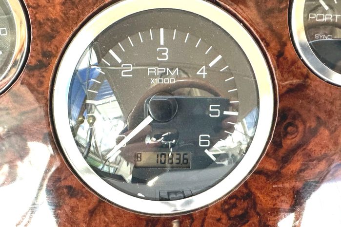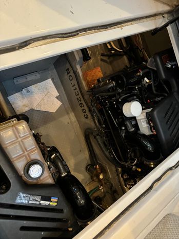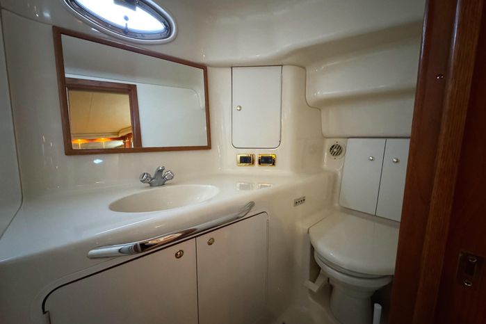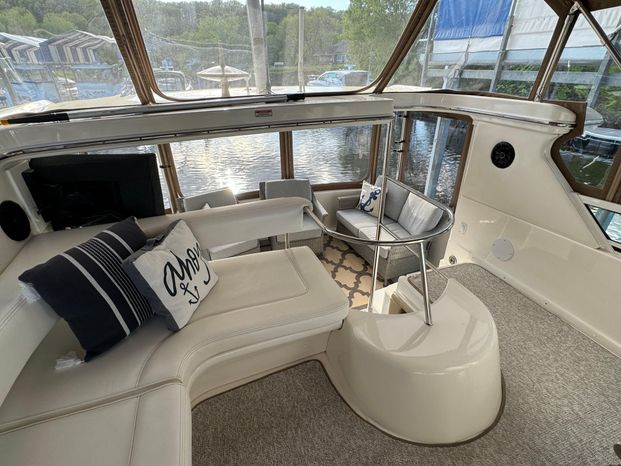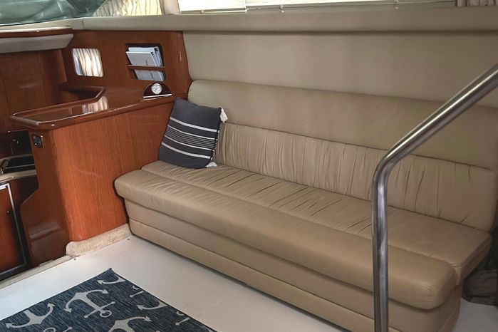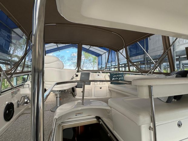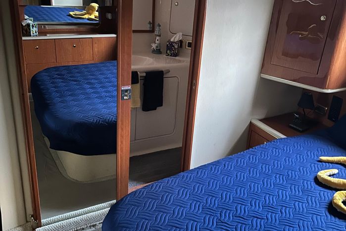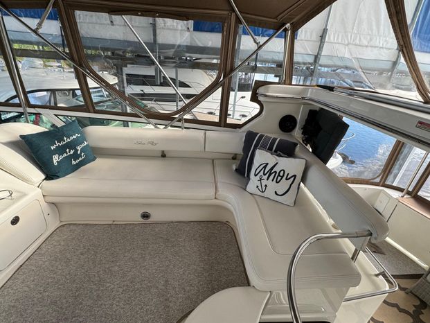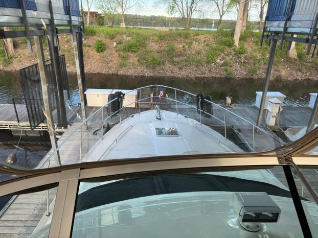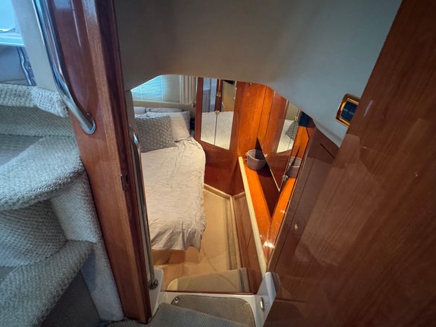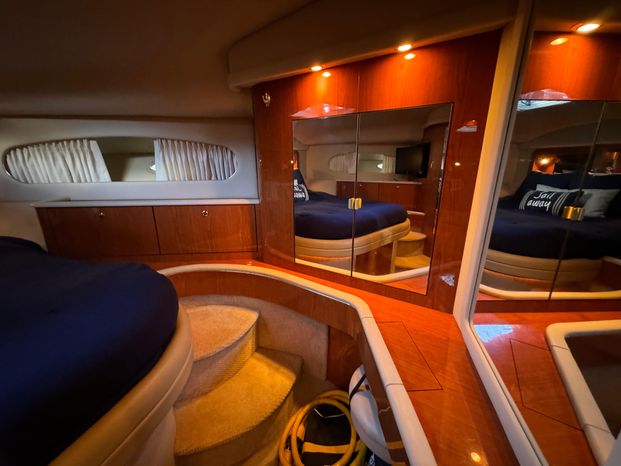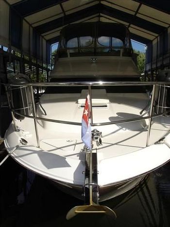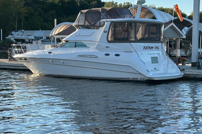 2001 Sea Ray 420 Aft Cabin, twin Mercruiser 370 hp, GM 496 CID 8.1L.,1050 approximate hours, enclosed cooling, Westerbeke 10kw generator, sound shield, 910 approximate hours, single 50 amp 125/250vac, one 25' , five batteries, battery charger, water heater, three CruiseAir reverse cycle heat/air units, sleeps eight, master stateroom aft with queen berth, ensuite Vacu-flush head, stall shower, vanity, guest stateroom forward with double berth, Vacu-flush head, stall shower, vanity, ultra leather interior, cherry woodwork, ultra leather convertible sofa, hi/lo cocktail table, ultra leather L-sofa, beige carpet, three built in TV's, solid surface countertops, single solid surface sink, pressure water, Norcold 12vdc/115vac under counter refrigerator and freezer, Kenyon three burner electric stove, Panasonic microwave/convection oven, Black & Decker coffee maker, Raytheon model 220 VHF marine radio, depth finder, Raytheon GPS/chart plotter, Raytheon RL80 radar, linen tweed canvas, bimini top with enclosure, hardtop with full enclosure, plexiglas wing doors, Guest remote spot light, anchor with 75' chain, Lofrans windlass, four fenders, fender racks, bow sun cushion, flybridge and aft deck carpeting, aft deck wet bar and refrigerator, aft deck furniture, dockside water, transom shower,fiberglass swim platform, boarding ladder, molded steps to aft deck, Bennett trim tabs, transom locker.