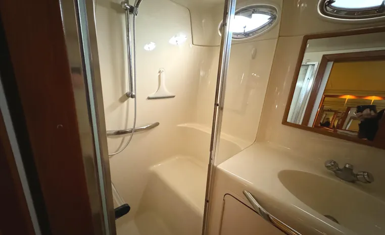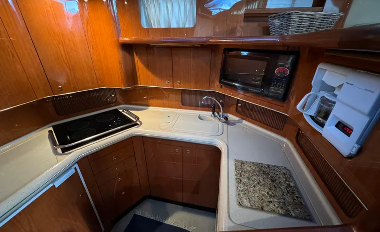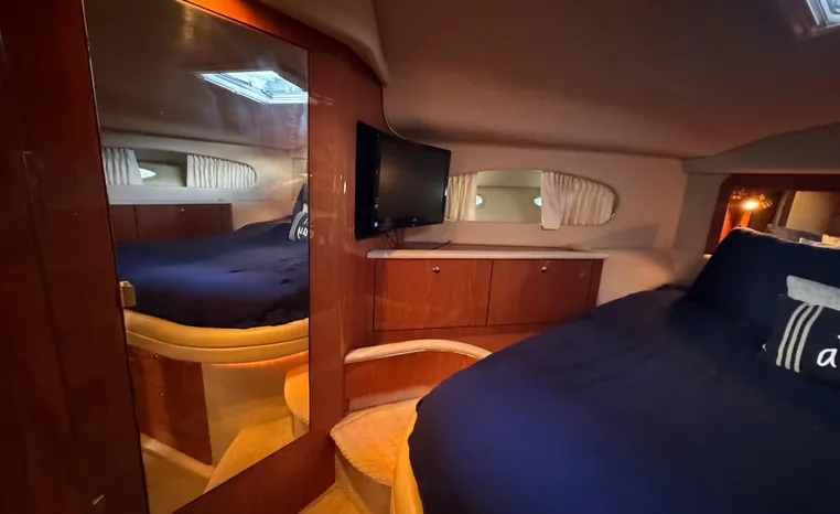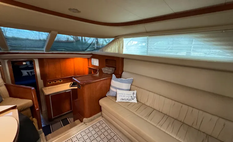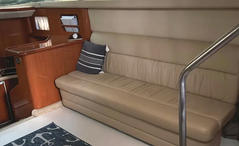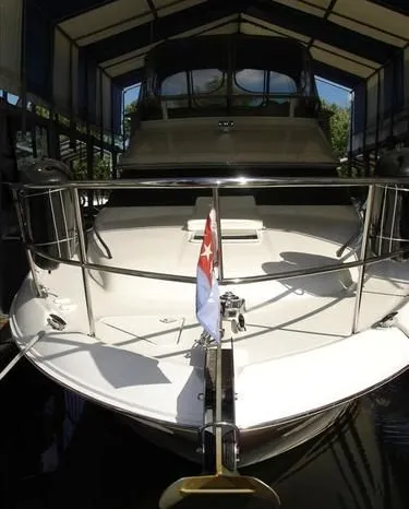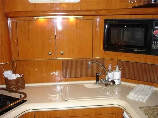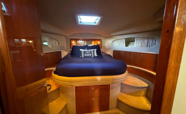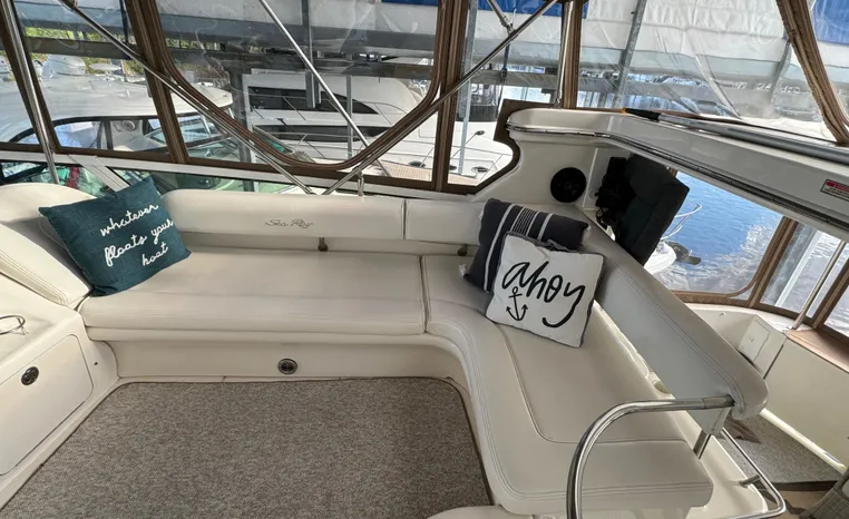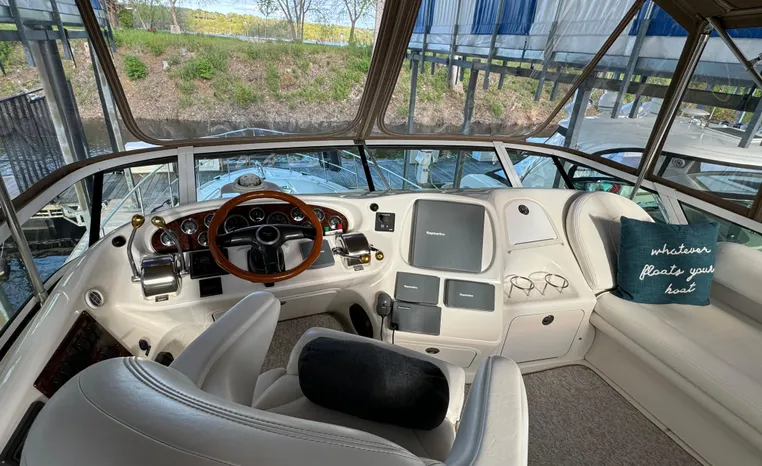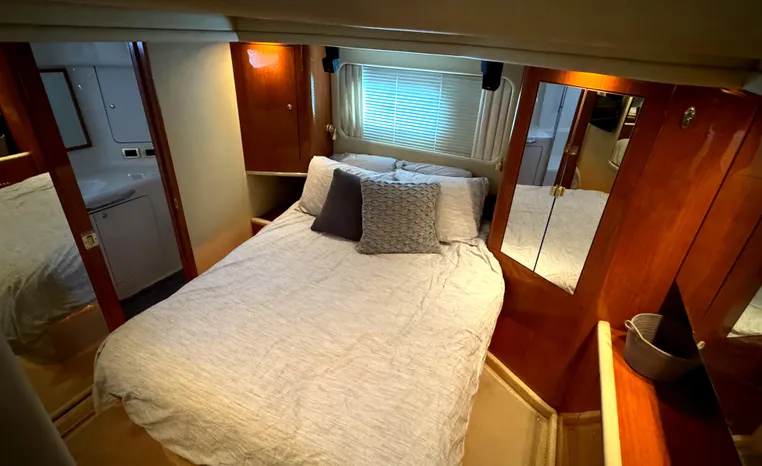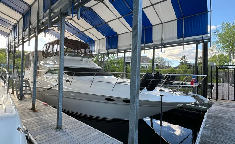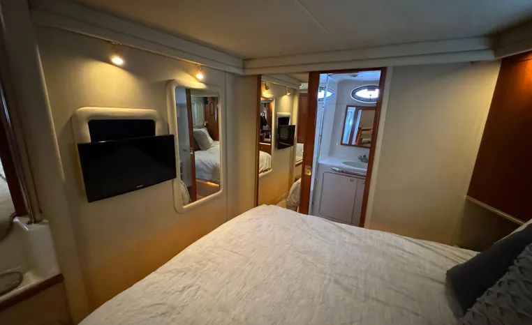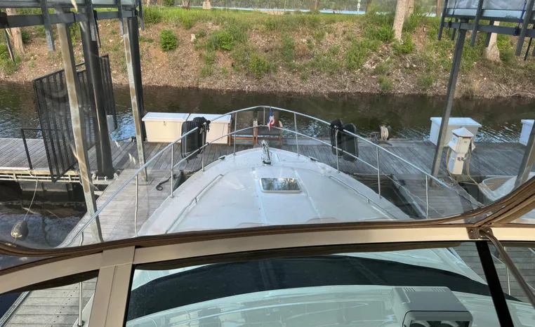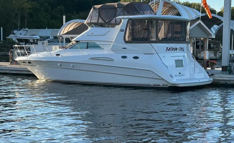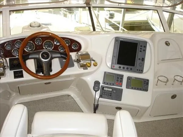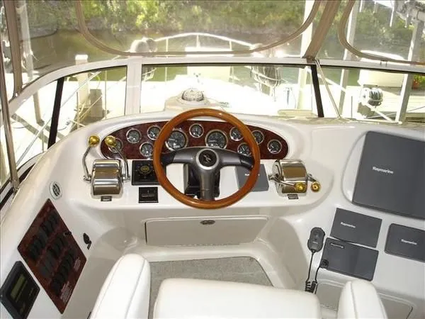 2001 Sea Ray 420 Aft Cabin, twin Mercruiser 370 hp, GM 496 CID 8.1L.,1050 approximate hours, enclosed cooling, Westerbeke 10kw generator, sound shield, 910 approximate hours, single 50 amp 125/250vac, one 25' , five batteries, battery charger, water heater, three CruiseAir reverse cycle heat/air units, sleeps eight, master stateroom aft with queen berth, ensuite Vacu-flush head, stall shower, vanity, guest stateroom forward with double berth, Vacu-flush head, stall shower, vanity, ultra leather interior, cherry woodwork, ultra leather convertible sofa, hi/lo cocktail table, ultra leather L-sofa, beige carpet, three built in TV's, solid surface countertops, single solid surface sink, pressure water, Norcold 12vdc/115vac under counter refrigerator and freezer, Kenyon three burner electric stove, Panasonic microwave/convection oven, Black & Decker coffee maker, Raytheon model 220 VHF marine radio, depth finder, Raytheon GPS/chart plotter, Raytheon RL80 radar, linen tweed canvas, bimini top with enclosure, hardtop with full enclosure, plexiglas wing doors, Guest remote spot light, anchor with 75' chain, Lofrans windlass, four fenders, fender racks, bow sun cushion, flybridge and aft deck carpeting, aft deck wet bar and refrigerator, aft deck furniture, dockside water, transom shower,fiberglass swim platform, boarding ladder, molded steps to aft deck, Bennett trim tabs, transom locker.