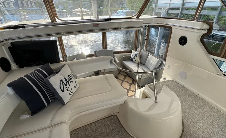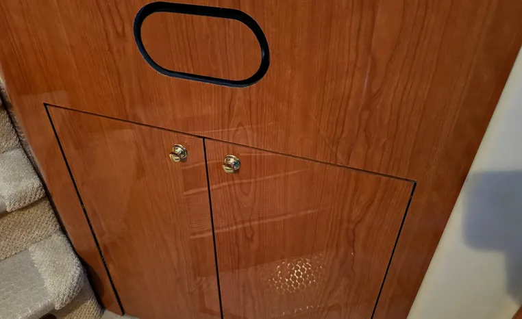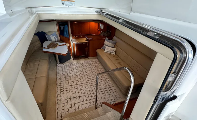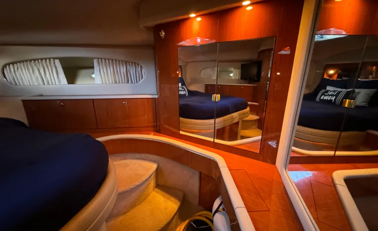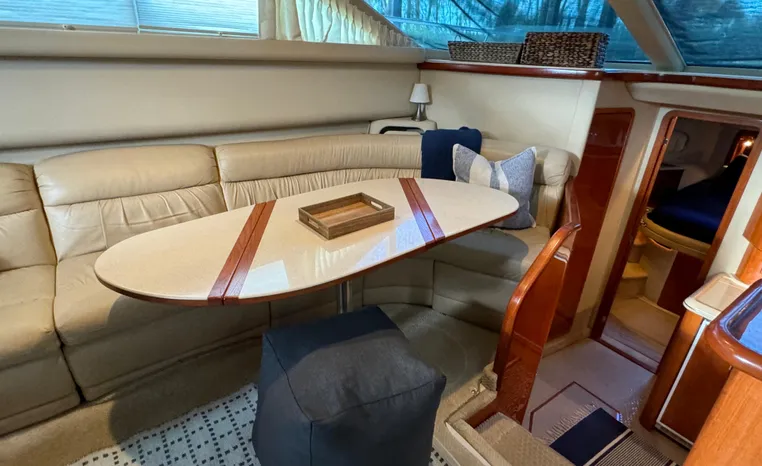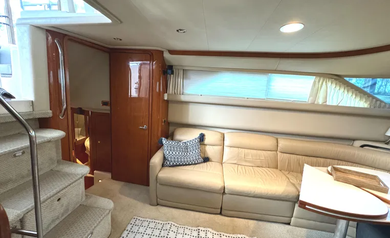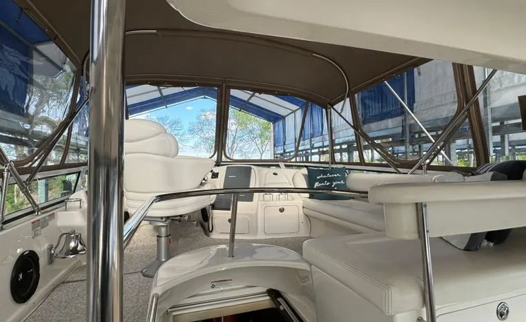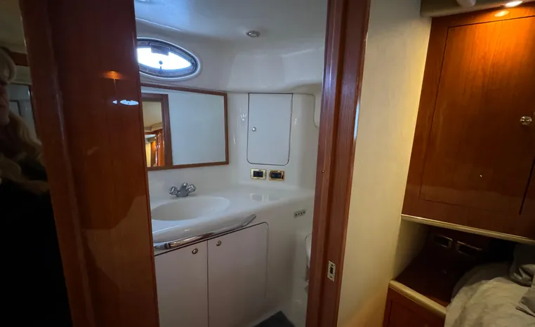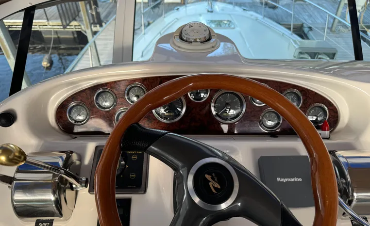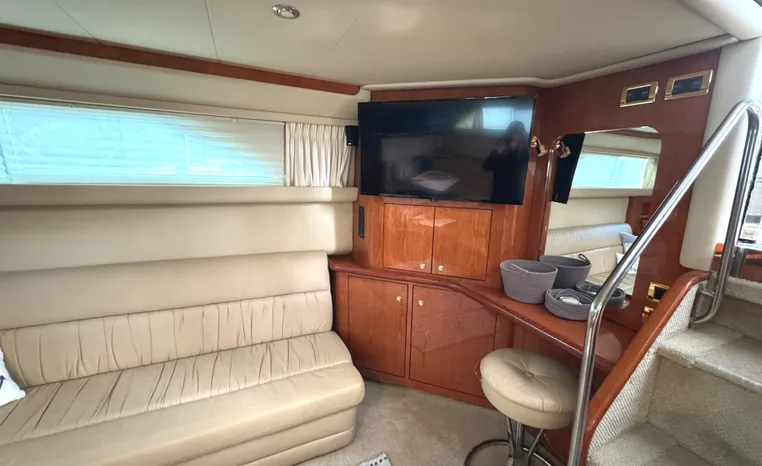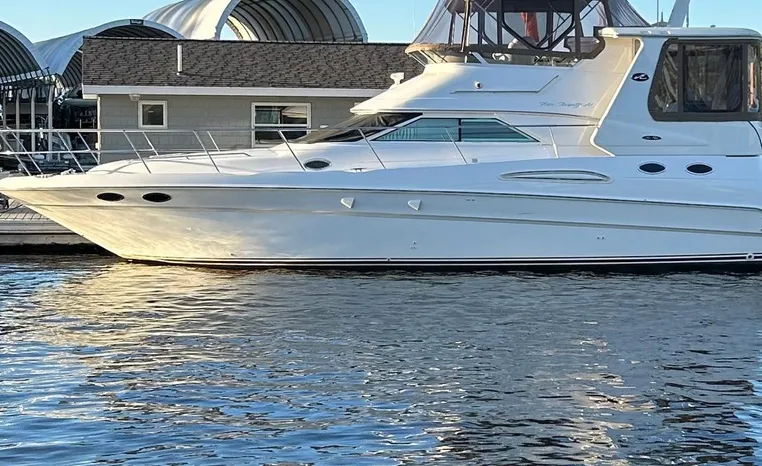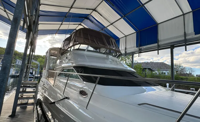 2001 Sea Ray 420 Aft Cabin, twin Mercruiser 370 hp, GM 496 CID 8.1L.,1050 approximate hours, enclosed cooling, Westerbeke 10kw generator, sound shield, 910 approximate hours, single 50 amp 125/250vac, one 25' , five batteries, battery charger, water heater, three CruiseAir reverse cycle heat/air units, sleeps eight, master stateroom aft with queen berth, ensuite Vacu-flush head, stall shower, vanity, guest stateroom forward with double berth, Vacu-flush head, stall shower, vanity, ultra leather interior, cherry woodwork, ultra leather convertible sofa, hi/lo cocktail table, ultra leather L-sofa, beige carpet, three built in TV's, solid surface countertops, single solid surface sink, pressure water, Norcold 12vdc/115vac under counter refrigerator and freezer, Kenyon three burner electric stove, Panasonic microwave/convection oven, Black & Decker coffee maker, Raytheon model 220 VHF marine radio, depth finder, Raytheon GPS/chart plotter, Raytheon RL80 radar, linen tweed canvas, bimini top with enclosure, hardtop with full enclosure, plexiglas wing doors, Guest remote spot light, anchor with 75' chain, Lofrans windlass, four fenders, fender racks, bow sun cushion, flybridge and aft deck carpeting, aft deck wet bar and refrigerator, aft deck furniture, dockside water, transom shower,fiberglass swim platform, boarding ladder, molded steps to aft deck, Bennett trim tabs, transom locker.