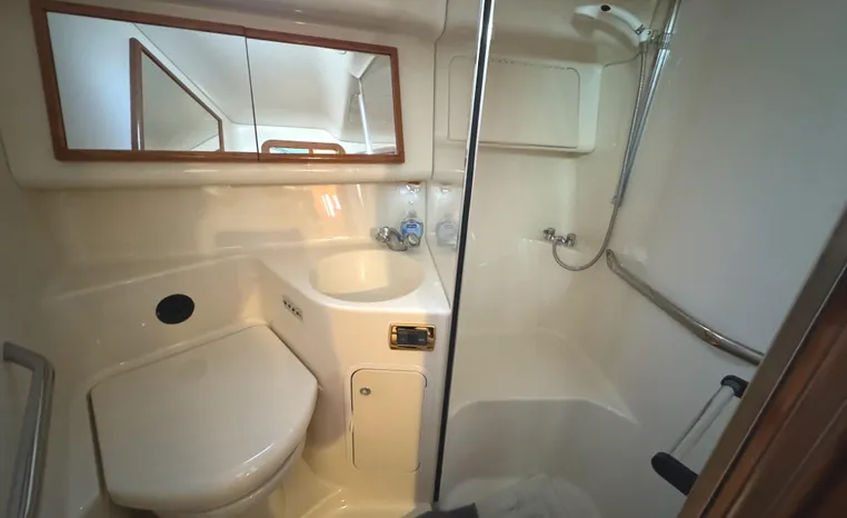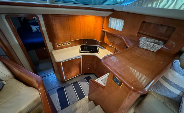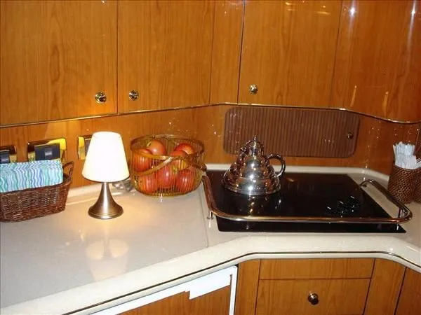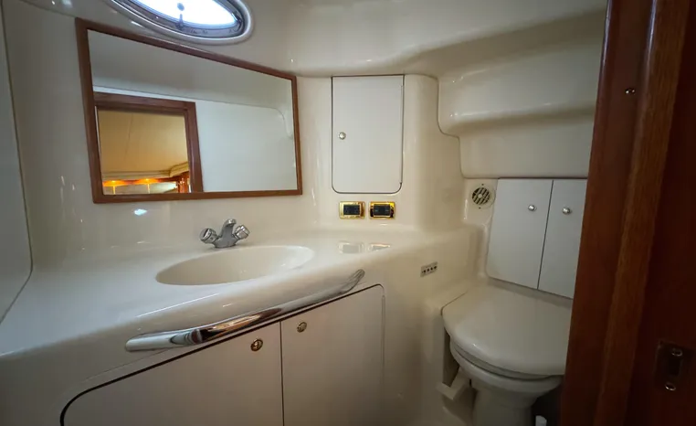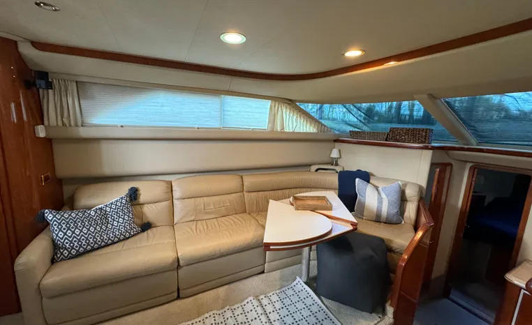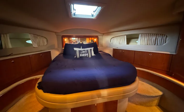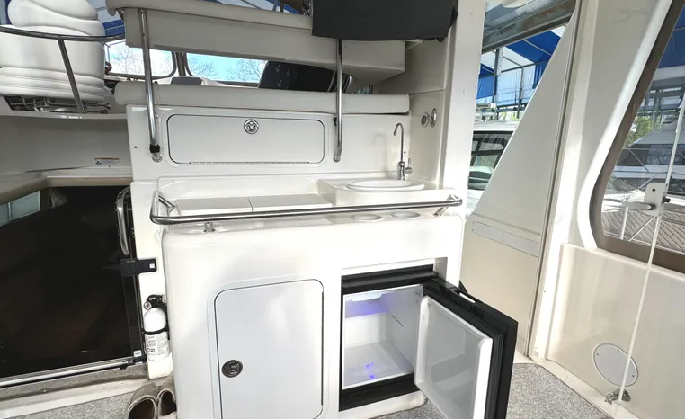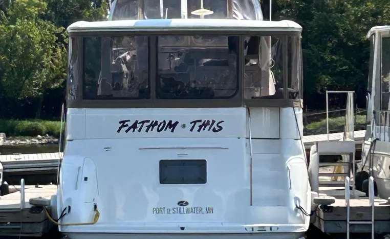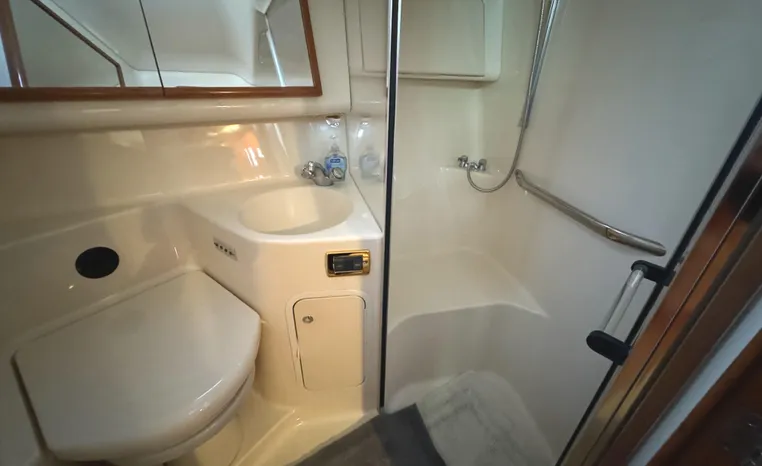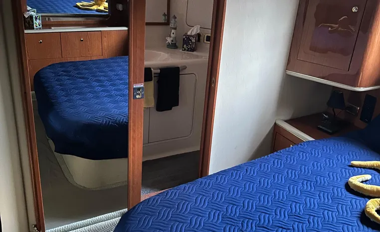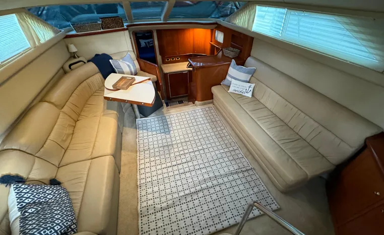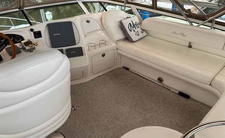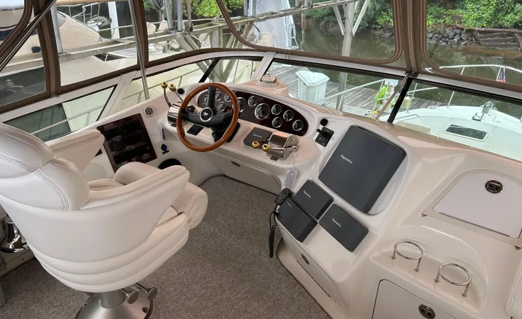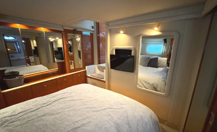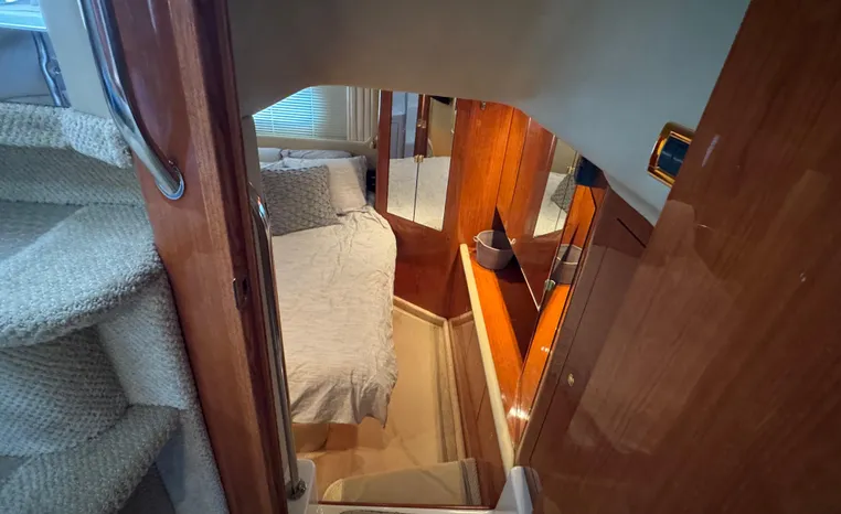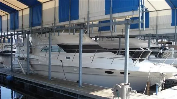 2001 Sea Ray 420 Aft Cabin, twin Mercruiser 370 hp, GM 496 CID 8.1L.,1050 approximate hours, enclosed cooling, Westerbeke 10kw generator, sound shield, 910 approximate hours, single 50 amp 125/250vac, one 25' , five batteries, battery charger, water heater, three CruiseAir reverse cycle heat/air units, sleeps eight, master stateroom aft with queen berth, ensuite Vacu-flush head, stall shower, vanity, guest stateroom forward with double berth, Vacu-flush head, stall shower, vanity, ultra leather interior, cherry woodwork, ultra leather convertible sofa, hi/lo cocktail table, ultra leather L-sofa, beige carpet, three built in TV's, solid surface countertops, single solid surface sink, pressure water, Norcold 12vdc/115vac under counter refrigerator and freezer, Kenyon three burner electric stove, Panasonic microwave/convection oven, Black & Decker coffee maker, Raytheon model 220 VHF marine radio, depth finder, Raytheon GPS/chart plotter, Raytheon RL80 radar, linen tweed canvas, bimini top with enclosure, hardtop with full enclosure, plexiglas wing doors, Guest remote spot light, anchor with 75' chain, Lofrans windlass, four fenders, fender racks, bow sun cushion, flybridge and aft deck carpeting, aft deck wet bar and refrigerator, aft deck furniture, dockside water, transom shower,fiberglass swim platform, boarding ladder, molded steps to aft deck, Bennett trim tabs, transom locker.