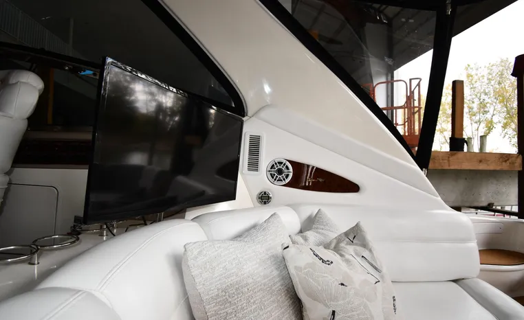 Freshwater / Great Lakes boat since new this vessel features Twin Caterpillar 3196 660-hp Diesel Engine's with --- original hours. Notable features include but are not limited to the following: Air-Conditioning & Heat (4-Units - Includes Cockpit AC/Heat), (2) Heads (Vacuflush) w/Vanity/Sink/Stall-Shower, Westerbeke 12.5kw Diesel Generator (2314-hrs.), Cherry (Vitra-Core) Interior Package, Satellite Television System, Windlass Anchor w/Forward Pedal-Controls (w/Freshwater Washdown), Bow-Thruster, Hydraulic Swim Platform, NEWER Raymarine Electronics Package (VHF Marine Radio, Autopilot, Dual Raymarine Hybrid-Touch - (1) C125 / (1) E125 Color Radar/GPS/Chartplotter), Premium Cockpit Sound System wJL-Audio Speakers / Subwoofers - Note (4) Tower-Speaekrs; 2-on Hardtop and 2-Underneath Hardtop), Cockpit Wet Bar w/Sink/Ice-Maker/Refrigerator, NEW Custom Canvas Enclosure, Sea-Dek Throughout Cockpit / Swim-Platform, Bose Surround Sound, and MUCH more!