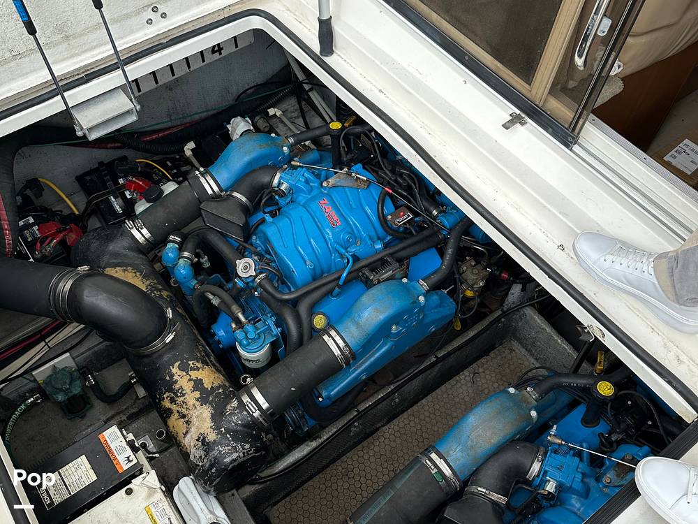 Under the hatch, she's got the muscle to match her style. Twin MerCruiser 7.4L big blocks deliver classic big-block performance with that unmistakable rumble.