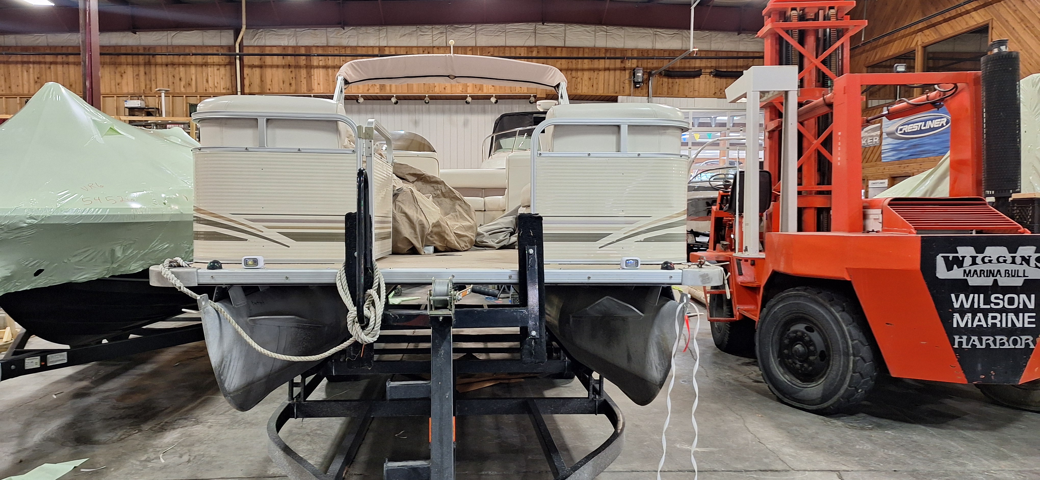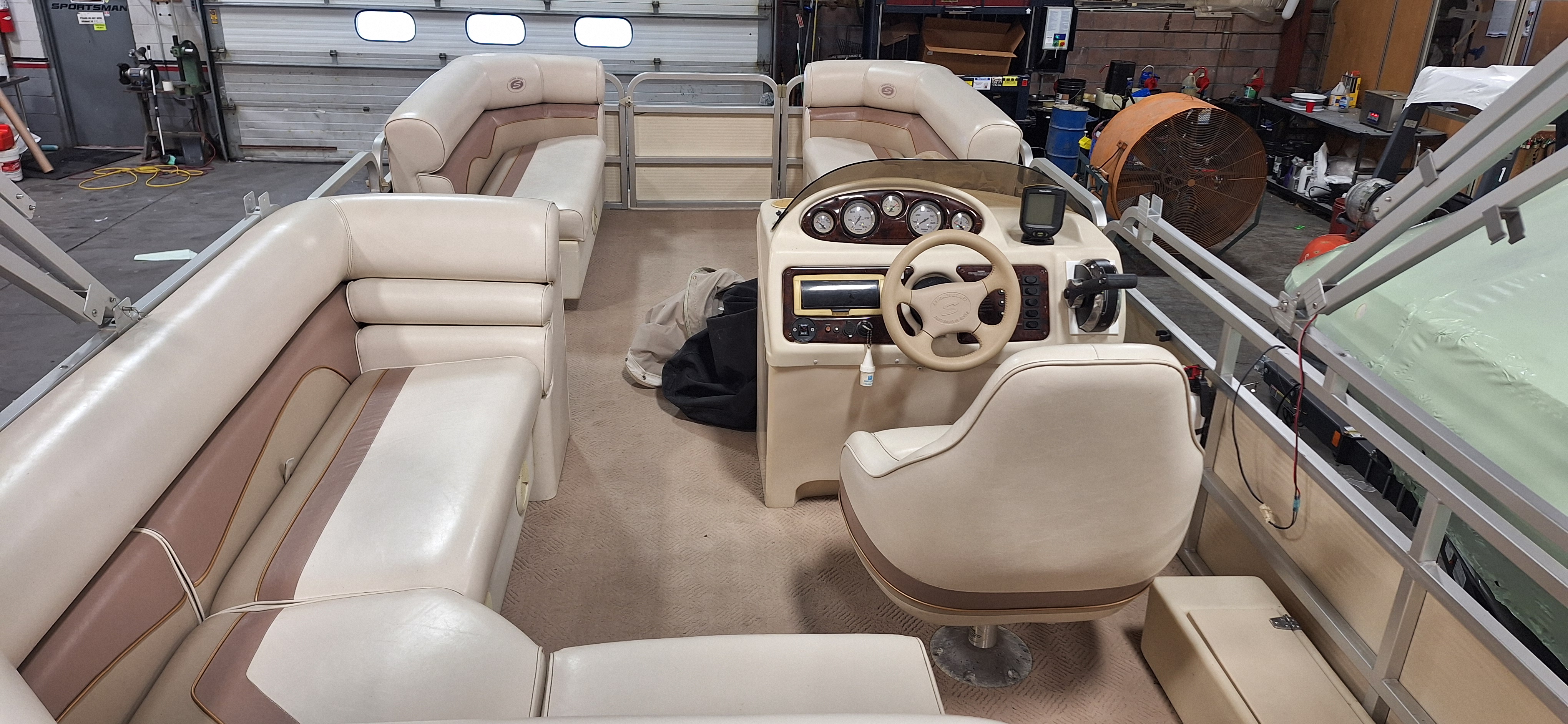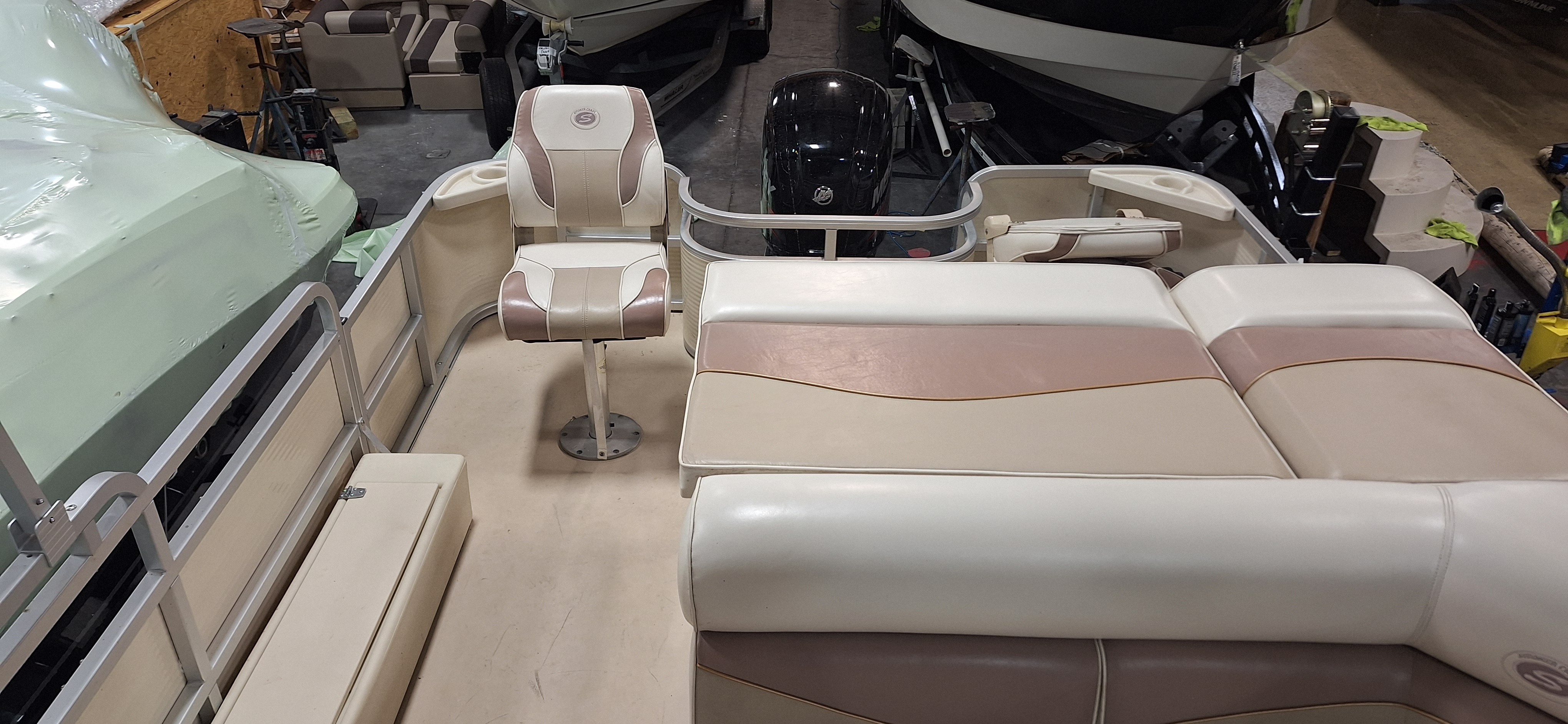 Clean and inspected pontoon powered by a Mercury 90hp four stroke