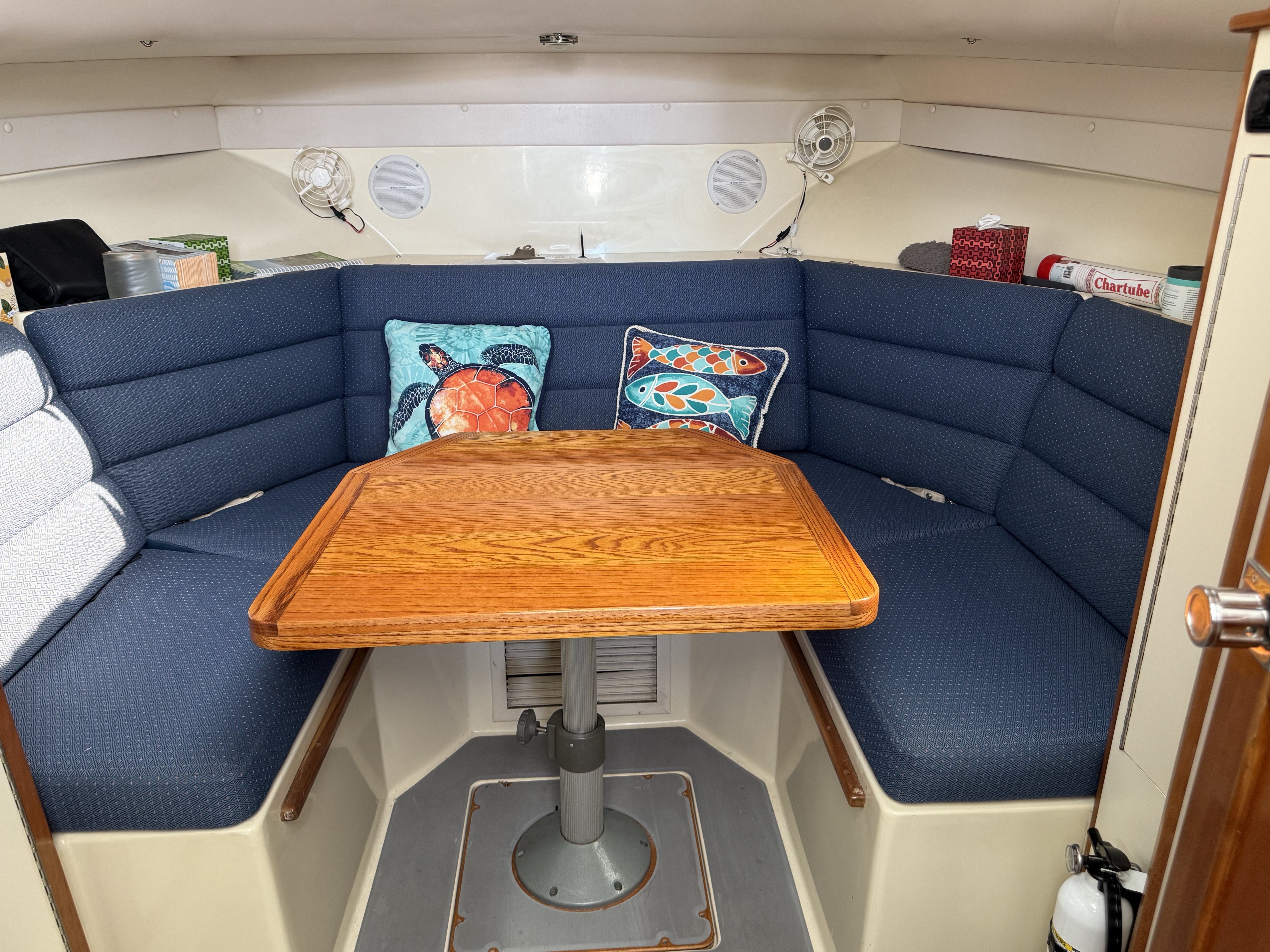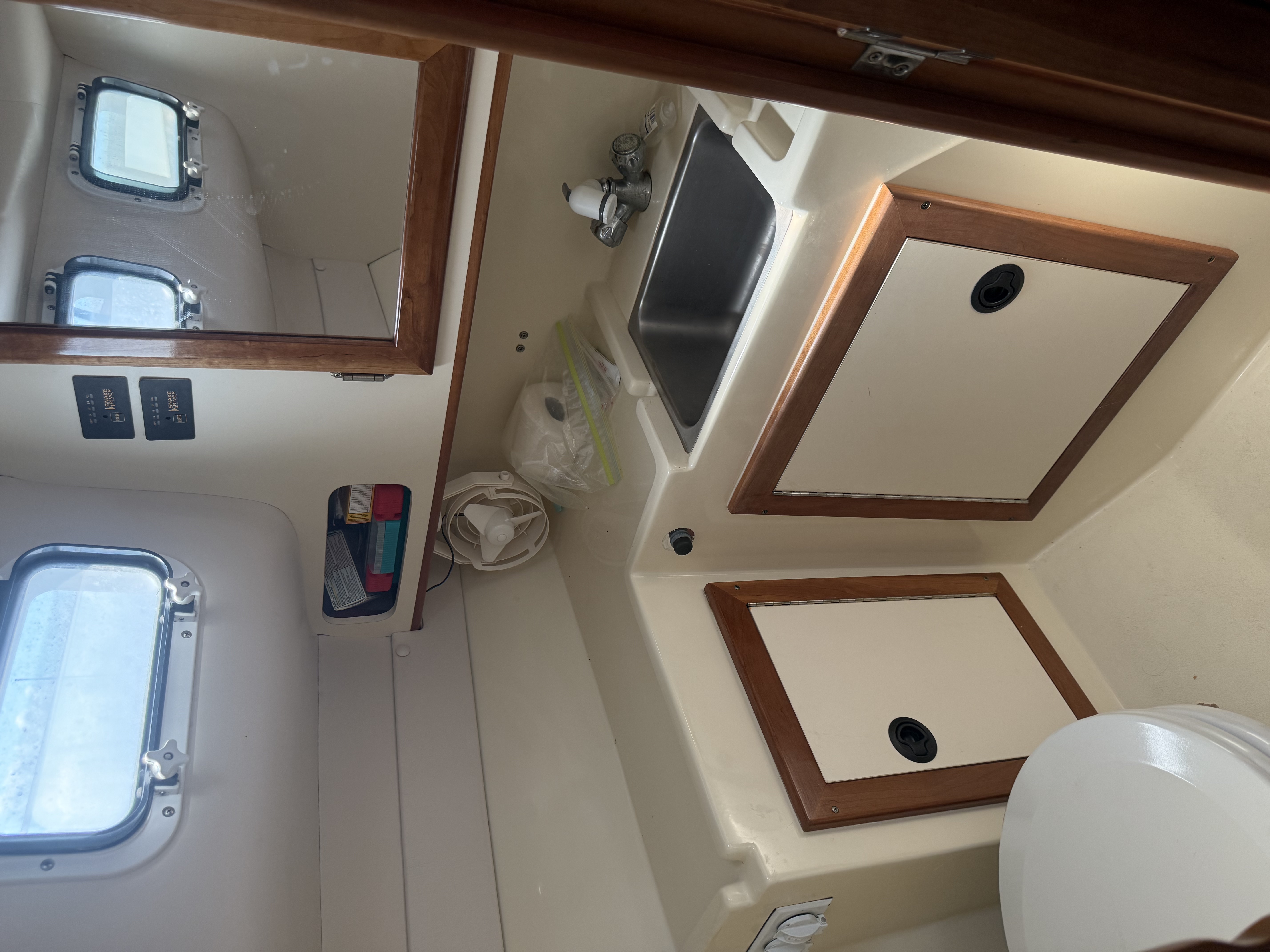 For cruising, the boat has a two-person berth and a single berth. It is equipped with a reverse thrust A/C and heater unit, 3 cabin fans, Bluetooth stereo with 4 speakers, water heater, refrigerator, microwave, fresh water pump, single burner butane stove, sink, small countertop, a private head with an electric flush toilet, and bathroom sink with a shower spray head.