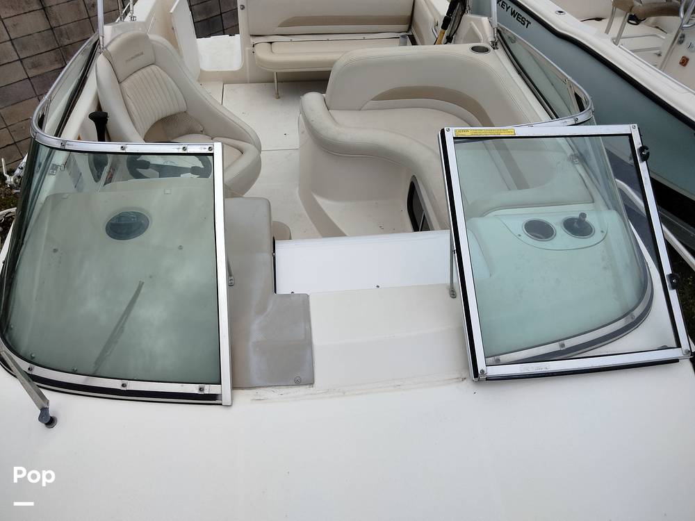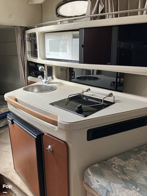 The interior features are an enclosed head, galley with sink and microwave, 2 burner stove and a small refrigerator. This model features a head equipped with a holding tank and a sink with hand wand that can be used as a shower. This Chaparral also has a mid-berth with a queen size bed for guest sleeping.