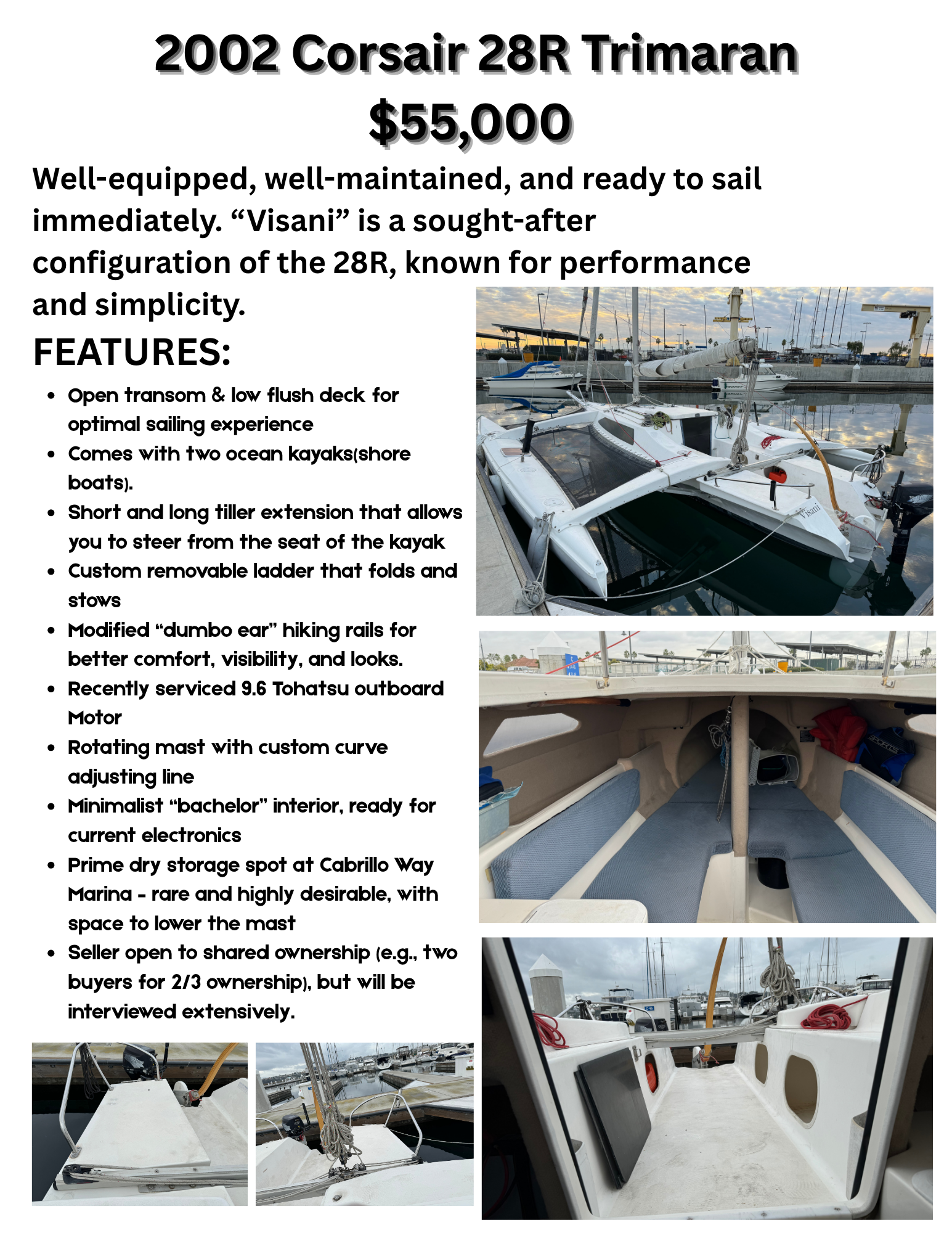 Well equipped and well maintained 2002 Corsair 28R with the sought after Visani configuration! Most notable besides the boat itself is that it comes with a very rare and desirable dry storage space at the Cabrillo Marina. More details are located on the flyer in the first pic. Serious buyers only. I am selling for the owner. If interested, I will make an appointment to meet with the owner and see the boat. Reasonable offers will be considered, but lowballers will be ignored. Happy to answer any questions!