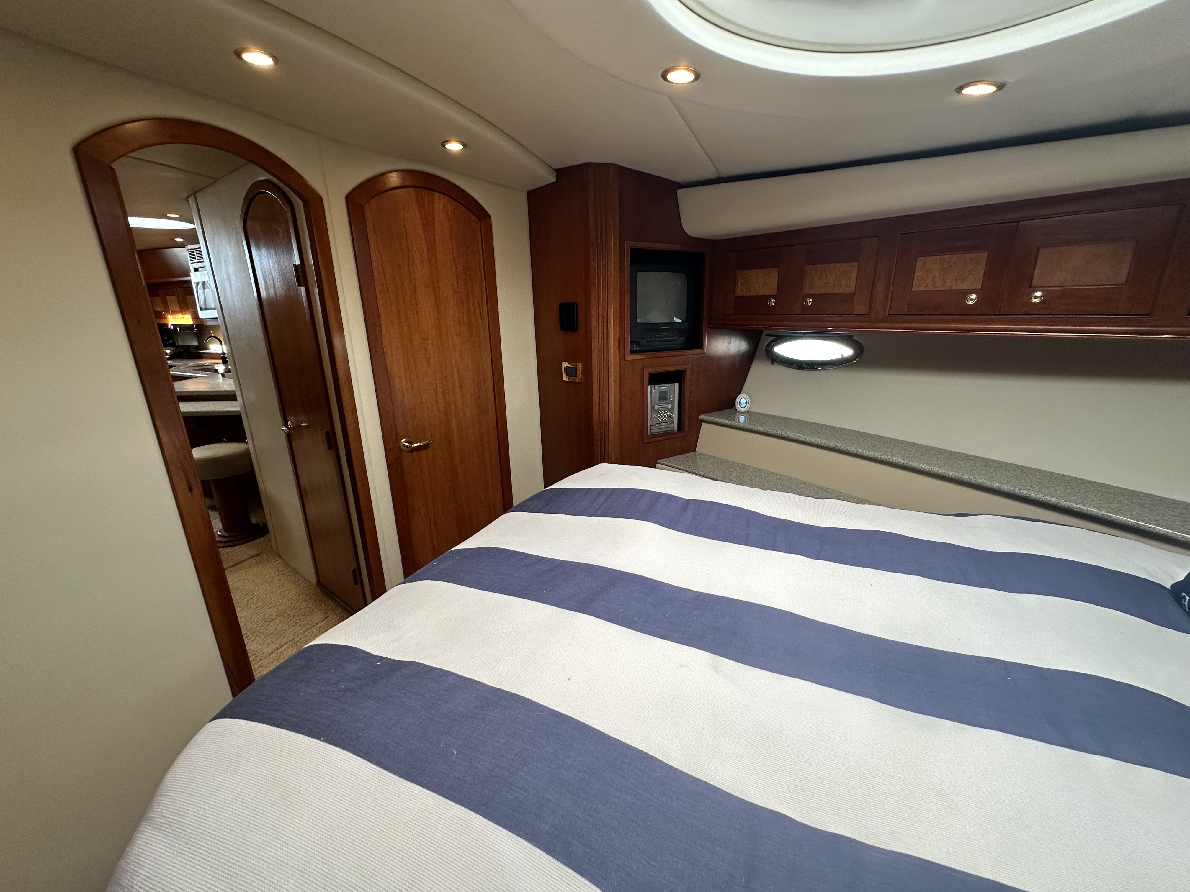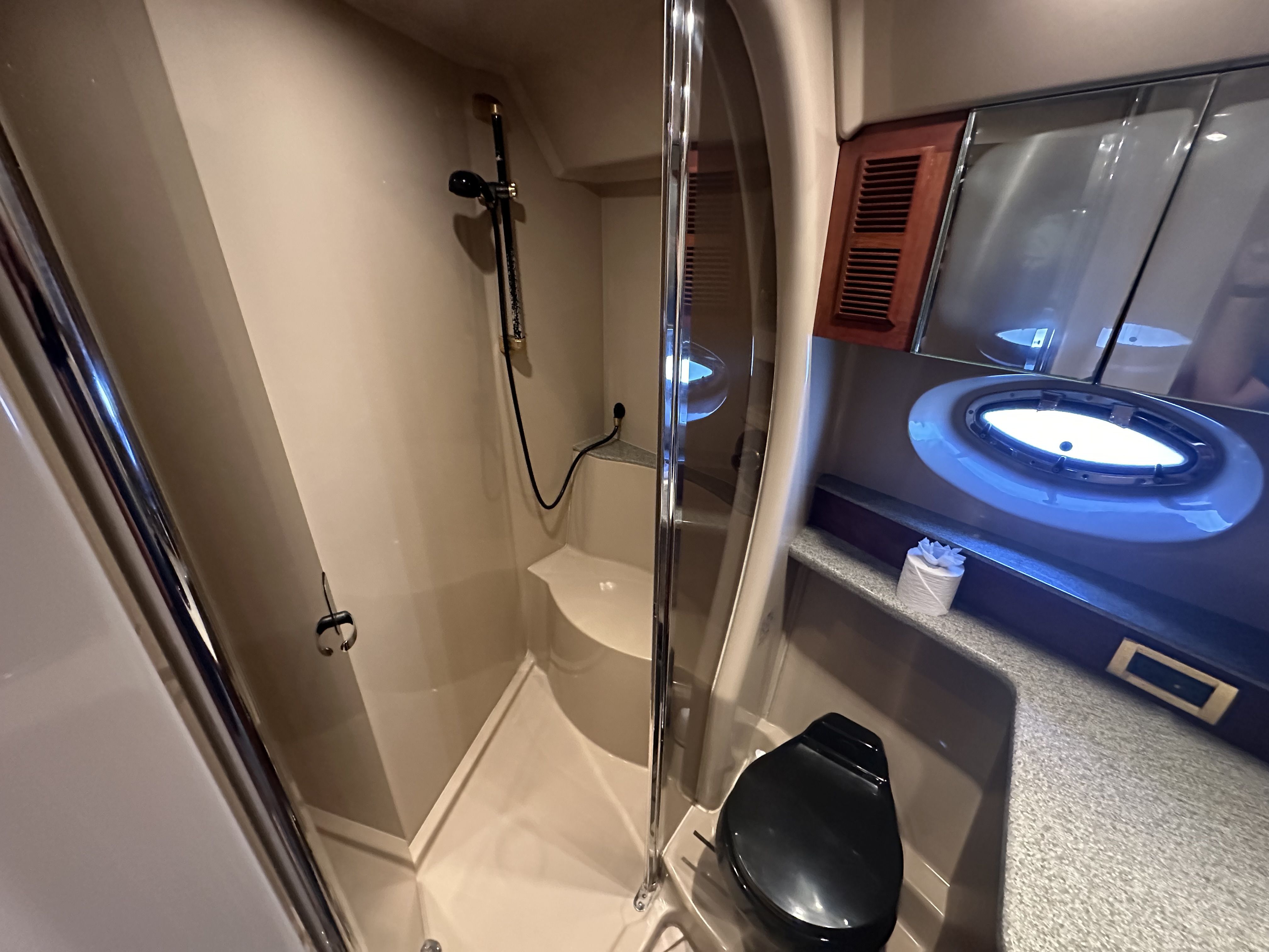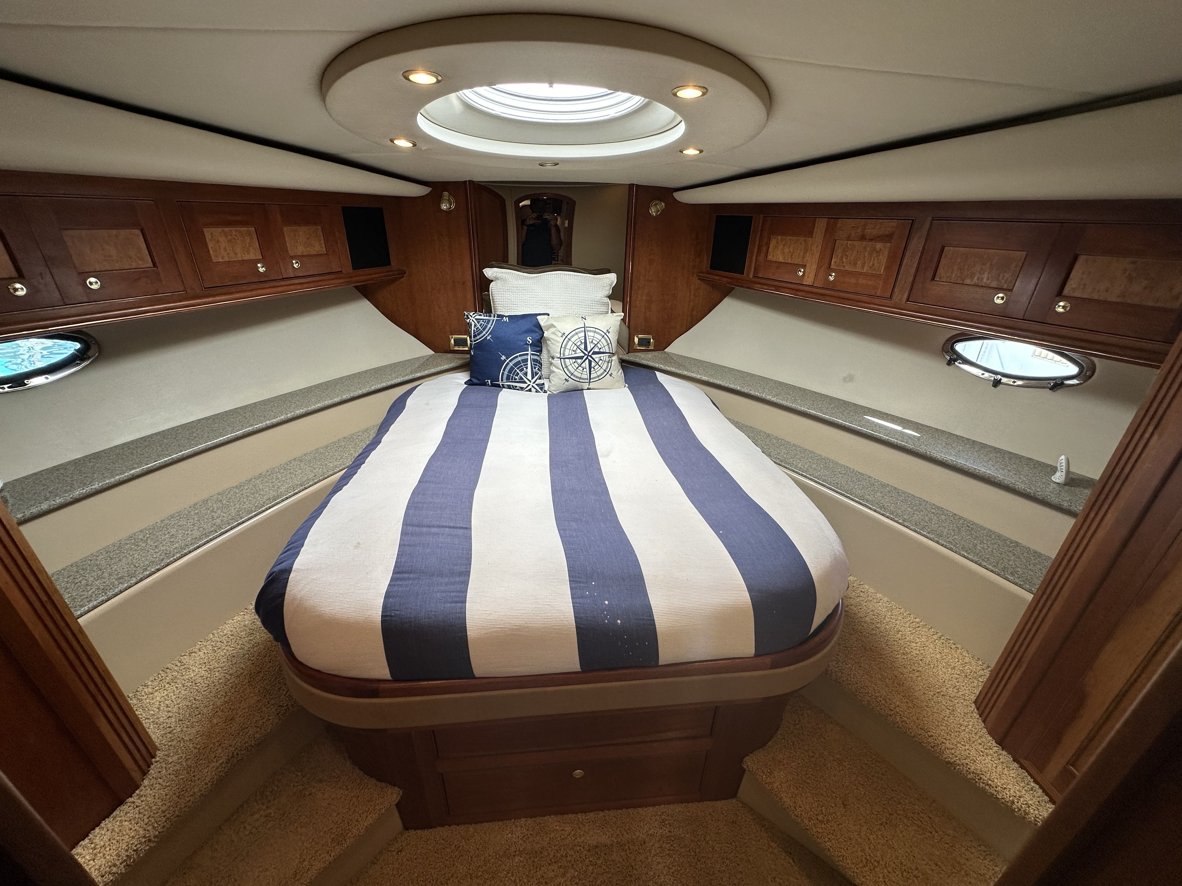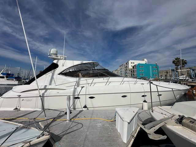 The Cruisers 5370 Express is an offshore thoroughbred, with the performance, handling, accommodations and storage necessary for long-term cruising. The above-deck configuration includes: a walkaround helm area that gives the pilot and copilot easy helm access; generous horseshoe seating aft that can be electrically converted to a spacious sunlounge; an aft deck / platform seating area; a fully equipped wetbar with refrigerator / icemaker for onboard entertaining and plenty of storage for water toys. The 5370 also features 12-inch-wide side decks, allowing for easy forward access, and she has been designed so owners may add an available hydraulic lift to the extended swim platform or electric davit for ease of handling a dinghy or personal watercraft. A camper top and front and side curtains will keep owners and guests protected from inclement weather, while a Bimini top will cool off hot summer afternoons on the water. A stylish hardtop with opening sunroof is also available. Owners have a choice of interior layouts: a three-stateroom layout, a two-stateroom layout with additional living space, and a two-stateroom layout with separate office space. The two-stateroom layout features a forward stateroom with a large island berth and a deluxe amidships master stateroom, which boasts a large island berth and a walk-in, cedar-lined closet. The three-stateroom layout includes a third cabin with twin berths or, owners may opt to use the third cabin as an onboard office. The 5370 features a full-service galley, equipped with a large refrigerator / freezer with ice maker, a double sink, an electric three-burner stove, a microwave / convection oven with exhaust fan and a coffee maker. To starboard, the 5370 provides a dinette with a unique electric lift dinette table that stows under the floor and raises automatically for use. This wonderfully appointed yacht includes a stereo with six-CD changer and a TV / VCR with remote.
