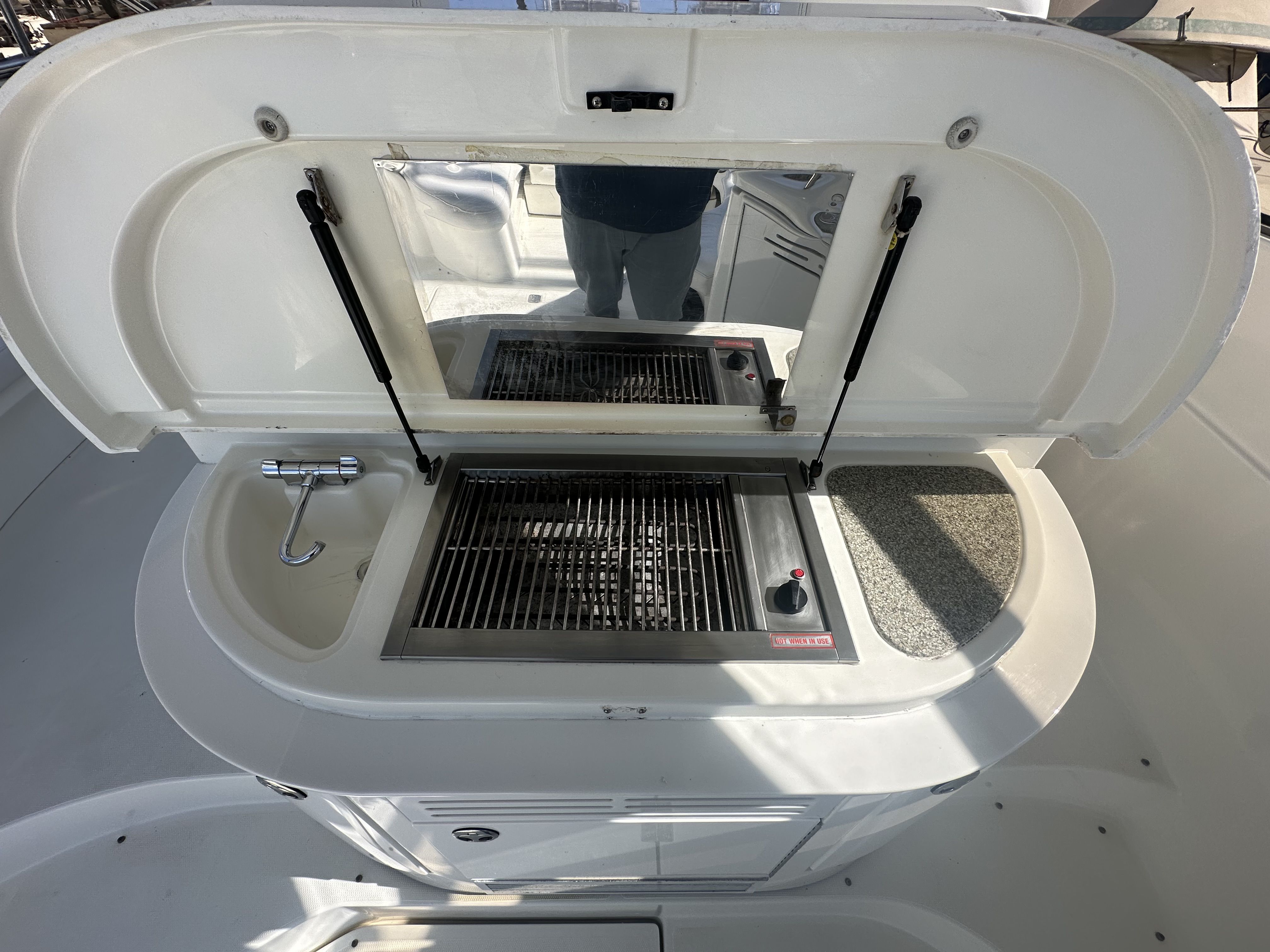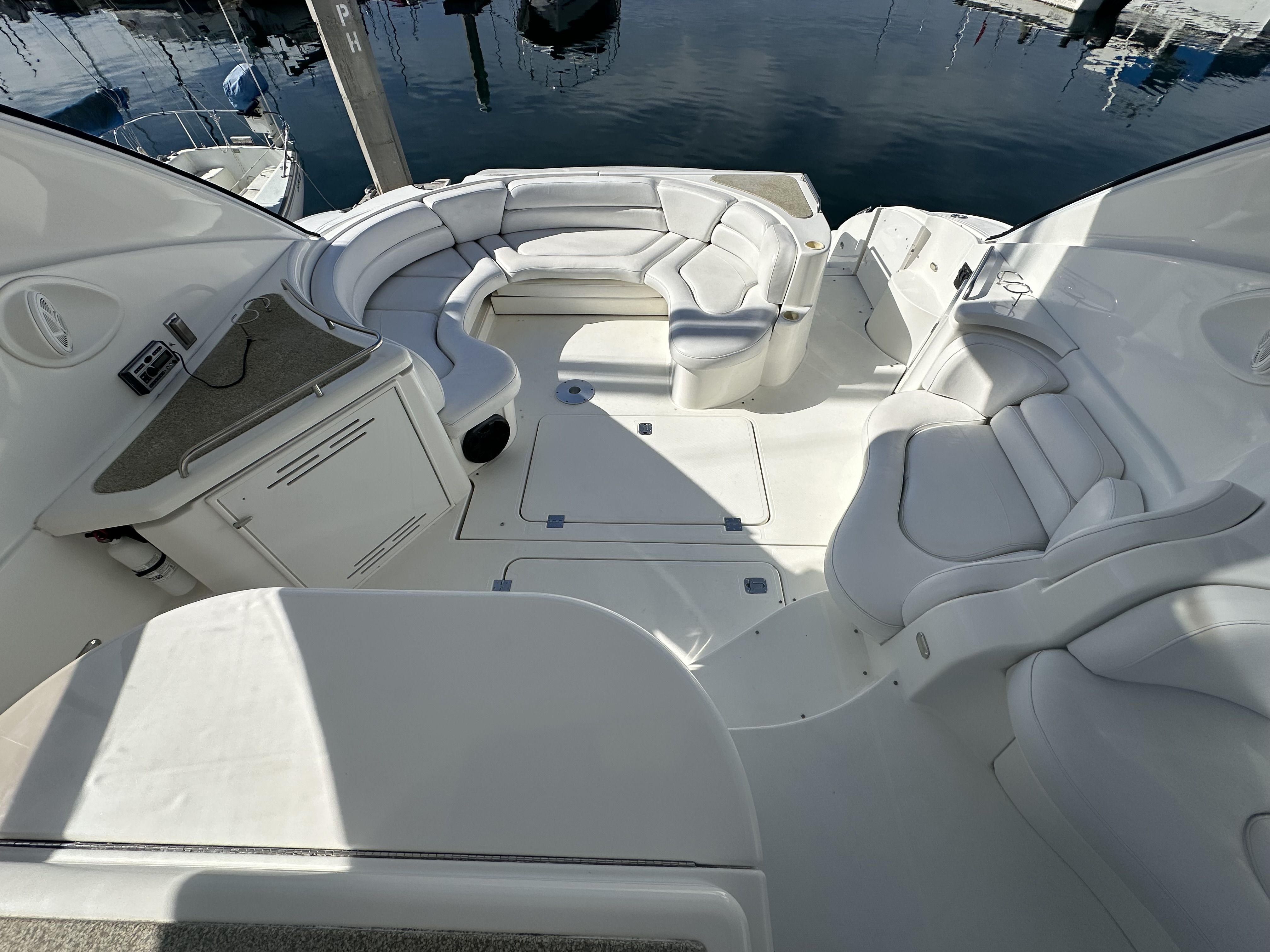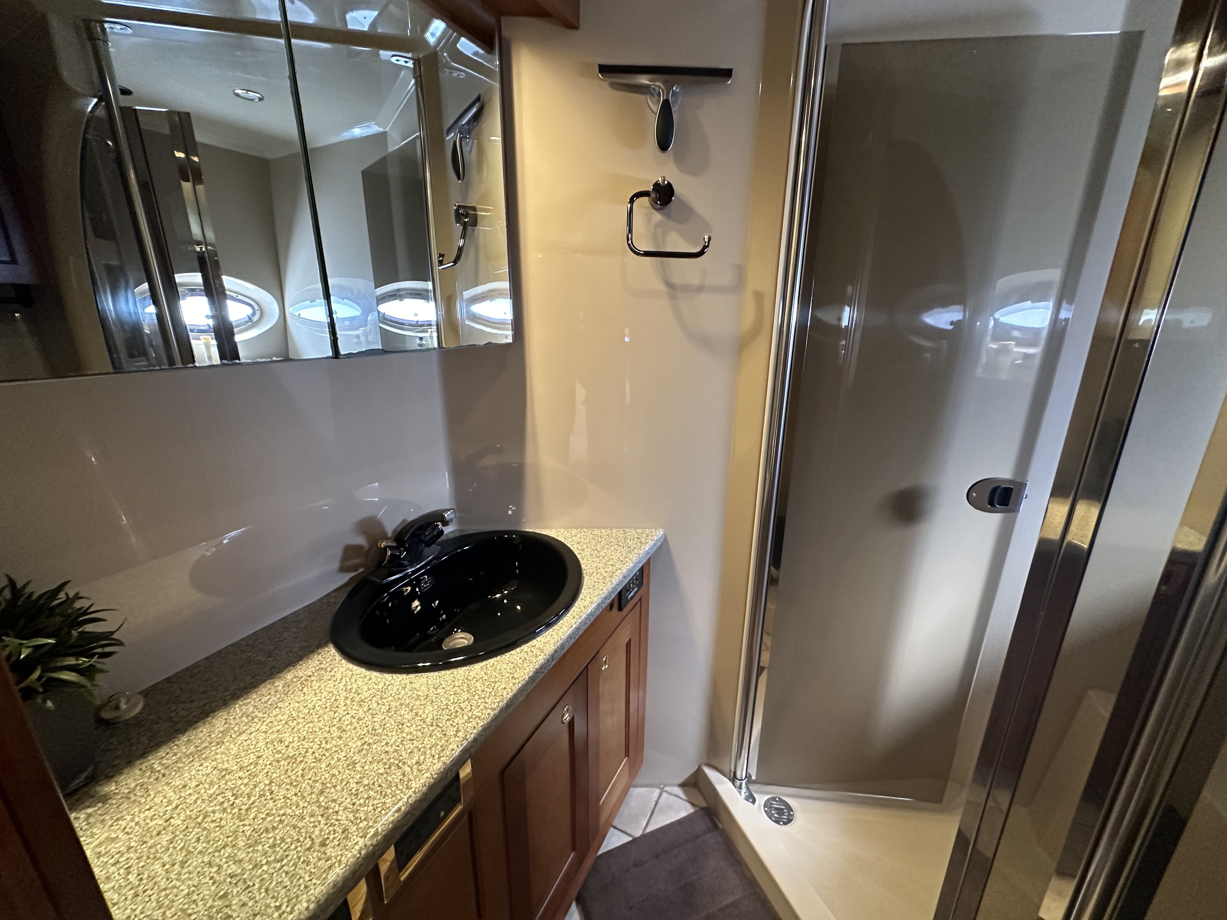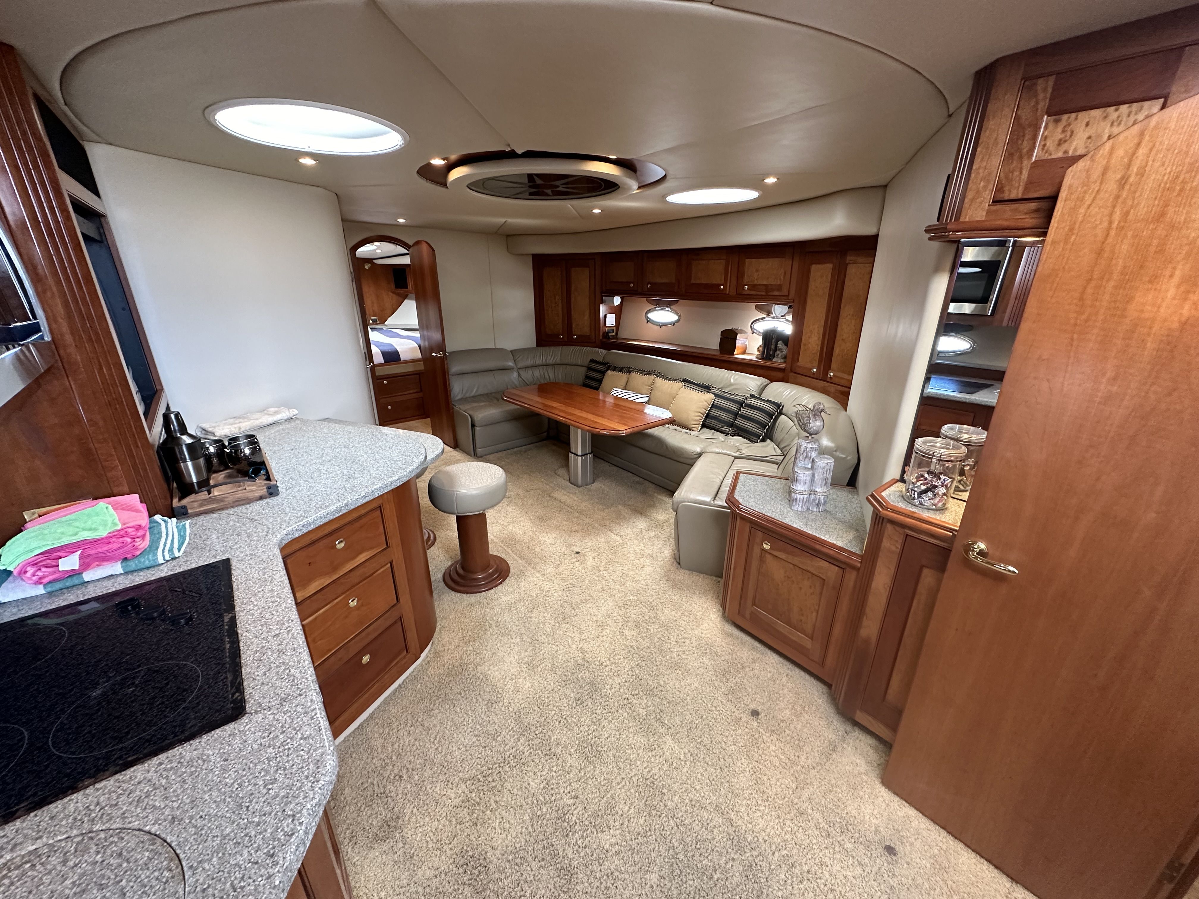 The Cruisers 5370 Express is an offshore thoroughbred, with the performance, handling, accommodations and storage necessary for long-term cruising. The above-deck configuration includes: a walkaround helm area that gives the pilot and copilot easy helm access; generous horseshoe seating aft that can be electrically converted to a spacious sunlounge; an aft deck / platform seating area; a fully equipped wetbar with refrigerator / icemaker for onboard entertaining and plenty of storage for water toys. The 5370 also features 12-inch-wide side decks, allowing for easy forward access, and she has been designed so owners may add an available hydraulic lift to the extended swim platform or electric davit for ease of handling a dinghy or personal watercraft. A camper top and front and side curtains will keep owners and guests protected from inclement weather, while a Bimini top will cool off hot summer afternoons on the water. A stylish hardtop with opening sunroof is also available. Owners have a choice of interior layouts: a three-stateroom layout, a two-stateroom layout with additional living space, and a two-stateroom layout with separate office space. The two-stateroom layout features a forward stateroom with a large island berth and a deluxe amidships master stateroom, which boasts a large island berth and a walk-in, cedar-lined closet. The three-stateroom layout includes a third cabin with twin berths or, owners may opt to use the third cabin as an onboard office. The 5370 features a full-service galley, equipped with a large refrigerator / freezer with ice maker, a double sink, an electric three-burner stove, a microwave / convection oven with exhaust fan and a coffee maker. To starboard, the 5370 provides a dinette with a unique electric lift dinette table that stows under the floor and raises automatically for use. This wonderfully appointed yacht includes a stereo with six-CD changer and a TV / VCR with remote.
