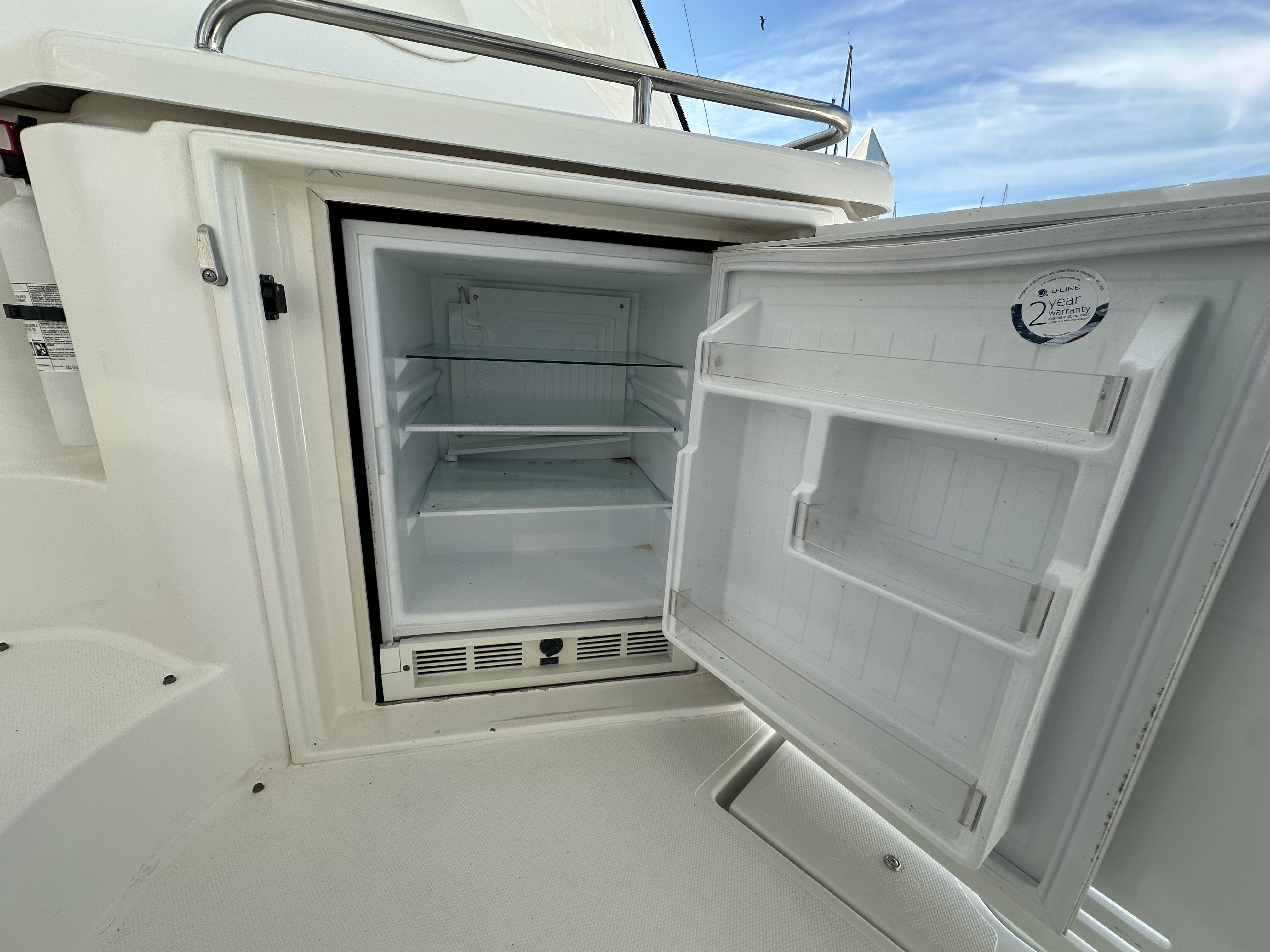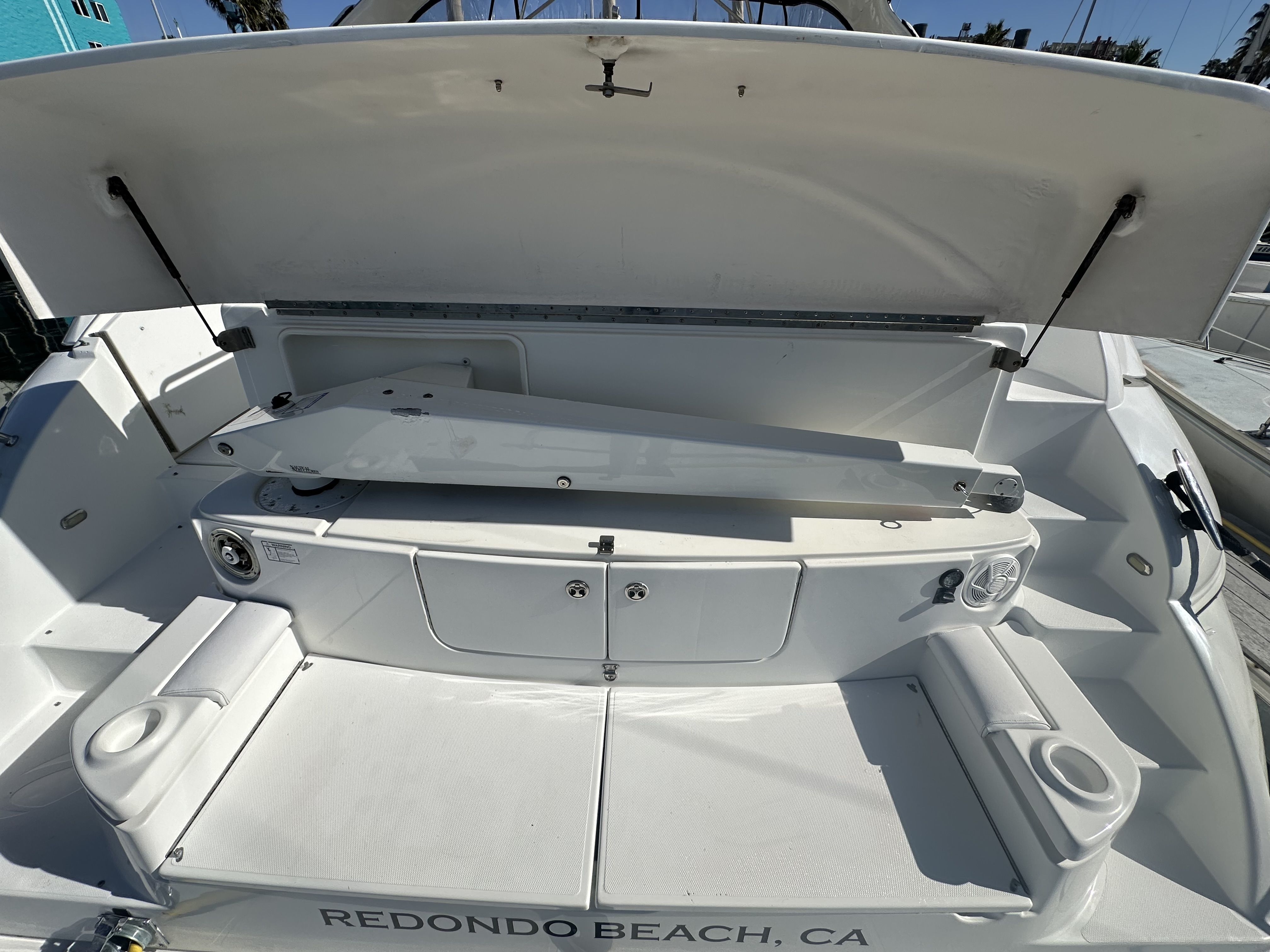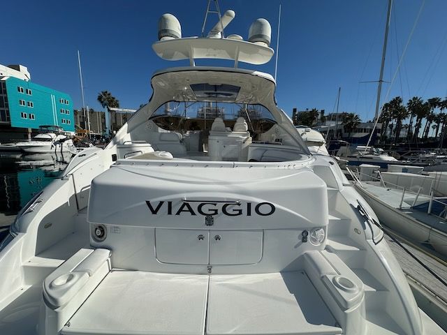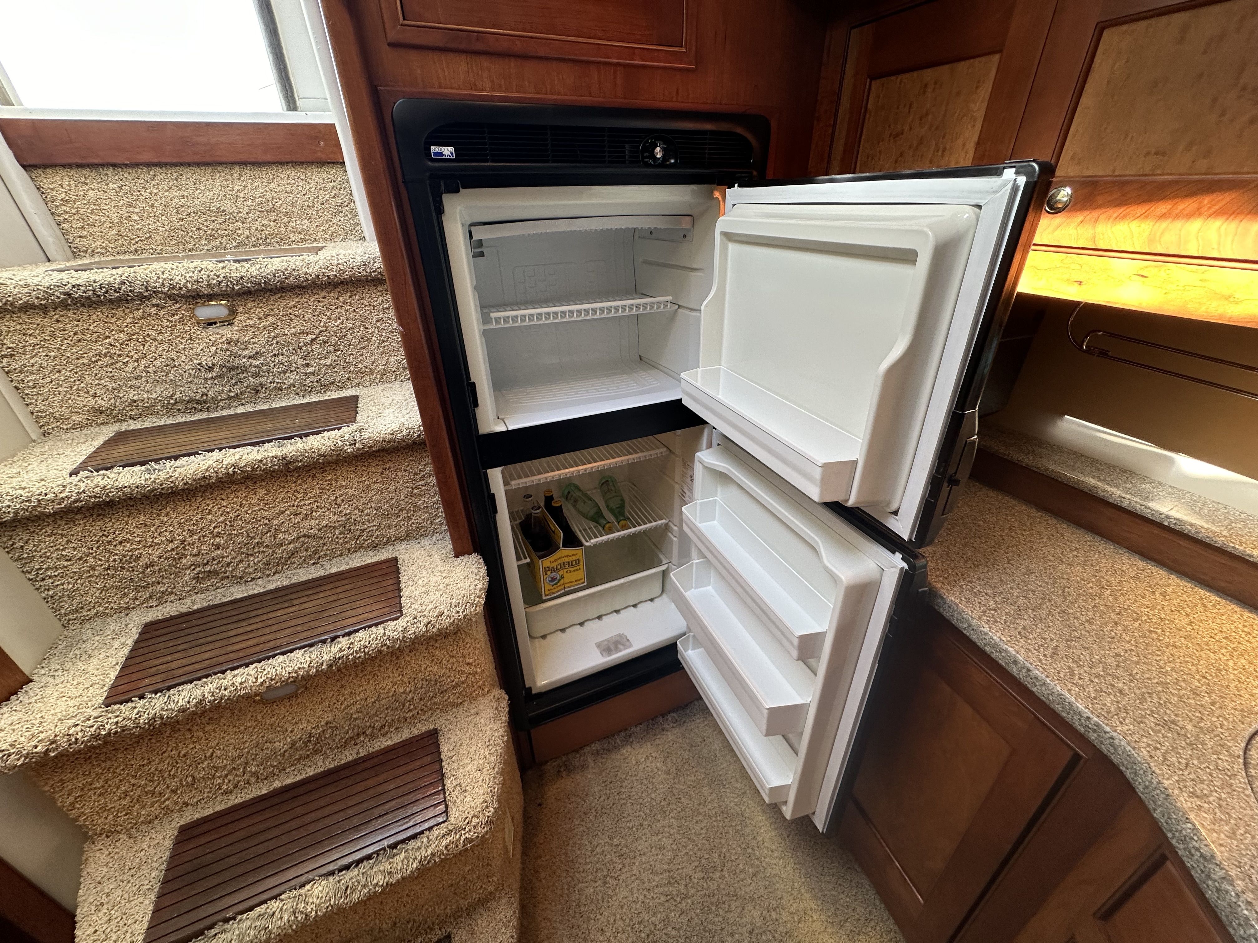 The Cruisers 5370 Express is an offshore thoroughbred, with the performance, handling, accommodations and storage necessary for long-term cruising. The above-deck configuration includes: a walkaround helm area that gives the pilot and copilot easy helm access; generous horseshoe seating aft that can be electrically converted to a spacious sunlounge; an aft deck / platform seating area; a fully equipped wetbar with refrigerator / icemaker for onboard entertaining and plenty of storage for water toys. The 5370 also features 12-inch-wide side decks, allowing for easy forward access, and she has been designed so owners may add an available hydraulic lift to the extended swim platform or electric davit for ease of handling a dinghy or personal watercraft. A camper top and front and side curtains will keep owners and guests protected from inclement weather, while a Bimini top will cool off hot summer afternoons on the water. A stylish hardtop with opening sunroof is also available. Owners have a choice of interior layouts: a three-stateroom layout, a two-stateroom layout with additional living space, and a two-stateroom layout with separate office space. The two-stateroom layout features a forward stateroom with a large island berth and a deluxe amidships master stateroom, which boasts a large island berth and a walk-in, cedar-lined closet. The three-stateroom layout includes a third cabin with twin berths or, owners may opt to use the third cabin as an onboard office. The 5370 features a full-service galley, equipped with a large refrigerator / freezer with ice maker, a double sink, an electric three-burner stove, a microwave / convection oven with exhaust fan and a coffee maker. To starboard, the 5370 provides a dinette with a unique electric lift dinette table that stows under the floor and raises automatically for use. This wonderfully appointed yacht includes a stereo with six-CD changer and a TV / VCR with remote.