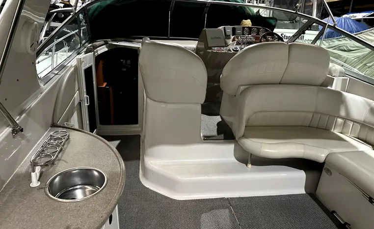 Freshwater / Great Lakes boat since new this vessel features Twin Volvo 8.1-litre Gi 375-hp Gas Inboard Engine's with 643-Hours showing on meters in bilge. Notable features include but are not limited to the following: Air-Conditioning & Heat (1-Unit), Head (Vacuflush) w/Vanity/Sink/Stall-Shower, Central Vacuum System, Kohler 7.3kw Generator (240-Hours), Windlass Anchor w/Forward Pedal-Controls, Complete Electronics Package (VHF Marine Radio, Depth/Speed, New Garmin Radar and New Garmin/GPS/Chartplotter, Raymarine Autopilot, Upgraded Fusion Stereo w/Premium Sound System w/iPod/MP3-Connection, Cockpit Wet Bar w/Sink/Ice-Maker/Refrigerator, Full Camper-Top Canvas Package w/Screens, Mooring Cover and MUCH more!