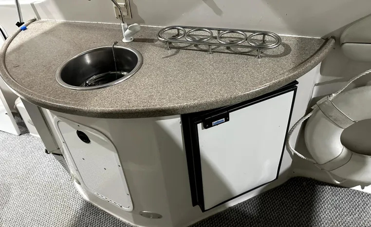 Freshwater / Great Lakes boat since new this vessel features Twin Volvo 8.1-litre Gi 375-hp Gas Inboard Engine's with 643-Hours showing on meters in bilge. Notable features include but are not limited to the following: Air-Conditioning & Heat (1-Unit), Head (Vacuflush) w/Vanity/Sink/Stall-Shower, Central Vacuum System, Kohler 7.3kw Generator (240-Hours), Windlass Anchor w/Forward Pedal-Controls, Complete Electronics Package (VHF Marine Radio, Depth/Speed, New Garmin Radar and New Garmin/GPS/Chartplotter, Raymarine Autopilot, Upgraded Fusion Stereo w/Premium Sound System w/iPod/MP3-Connection, Cockpit Wet Bar w/Sink/Ice-Maker/Refrigerator, Full Camper-Top Canvas Package w/Screens, Mooring Cover and MUCH more!