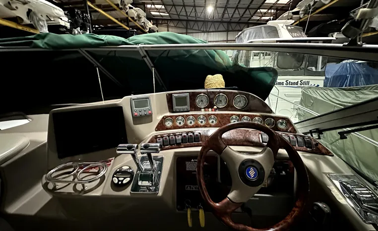 Freshwater / Great Lakes boat since new this vessel features Twin Volvo 8.1-litre Gi 375-hp Gas Inboard Engine's with 643-Hours showing on meters in bilge. Notable features include but are not limited to the following: Air-Conditioning & Heat (1-Unit), Head (Vacuflush) w/Vanity/Sink/Stall-Shower, Central Vacuum System, Kohler 7.3kw Generator (240-Hours), Windlass Anchor w/Forward Pedal-Controls, Complete Electronics Package (VHF Marine Radio, Depth/Speed, New Garmin Radar and New Garmin/GPS/Chartplotter, Raymarine Autopilot, Upgraded Fusion Stereo w/Premium Sound System w/iPod/MP3-Connection, Cockpit Wet Bar w/Sink/Ice-Maker/Refrigerator, Full Camper-Top Canvas Package w/Screens, Mooring Cover and MUCH more!