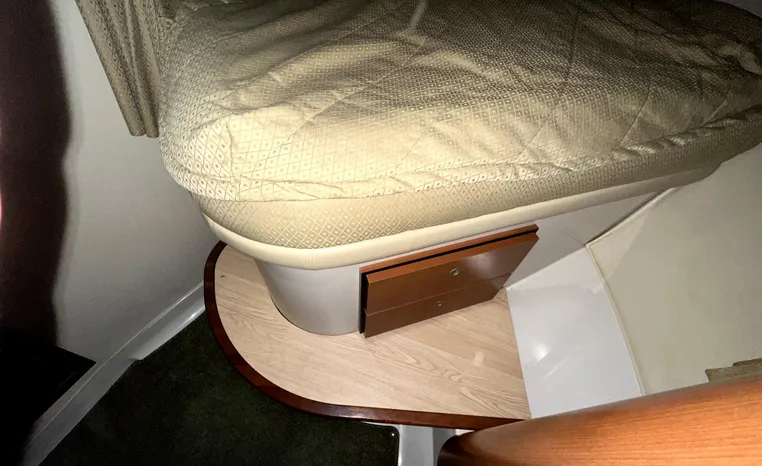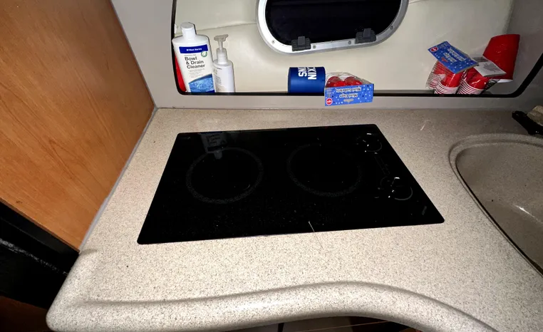 This 378 Vista joins a growing list of midsize family cruisers vying for the attention of the nation’s boaters. The Vista is a well-styled boat with her flowing lines andforward-facing arch, and she has one of the larger cockpits to be found in a 37-footer. Rather than the typical mid-cabin interior, the 378 features an expansive salon with two convertible sofas, one along the aft bulkhead and the other along the starboard side. Privacy curtains separate the fore and aft sleeping areas from the main salon, although an aft-cabin bulkhead with door was optional. The galley offers abundant storage and counter space, enhanced by faux granite countertops and cherry cabinets. Note that air-conditioning and a central vacuum system are standard, as is the flat-screen TV installed above the galley. On deck, a walk- through windshield provides easy access to the fore-deck. Cockpit seating includes a U-shaped lounge aft, double helm seat and a port-side lounge, and the engine compartment is reached through a deck access panel or the standard power hatch. Twin 375hp gas inboards cruise the 378 Vista in the low 20s and top out at just over 30 knots.