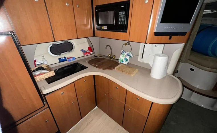 Freshwater / Great Lakes boat since new this vessel features Twin Volvo 8.1-litre Gi 375-hp Gas Inboard Engine's with 643-Hours showing on meters in bilge. Notable features include but are not limited to the following: Air-Conditioning & Heat (1-Unit), Head (Vacuflush) w/Vanity/Sink/Stall-Shower, Central Vacuum System, Kohler 7.3kw Generator (240-Hours), Windlass Anchor w/Forward Pedal-Controls, Complete Electronics Package (VHF Marine Radio, Depth/Speed, New Garmin Radar and New Garmin/GPS/Chartplotter, Raymarine Autopilot, Upgraded Fusion Stereo w/Premium Sound System w/iPod/MP3-Connection, Cockpit Wet Bar w/Sink/Ice-Maker/Refrigerator, Full Camper-Top Canvas Package w/Screens, Mooring Cover and MUCH more!