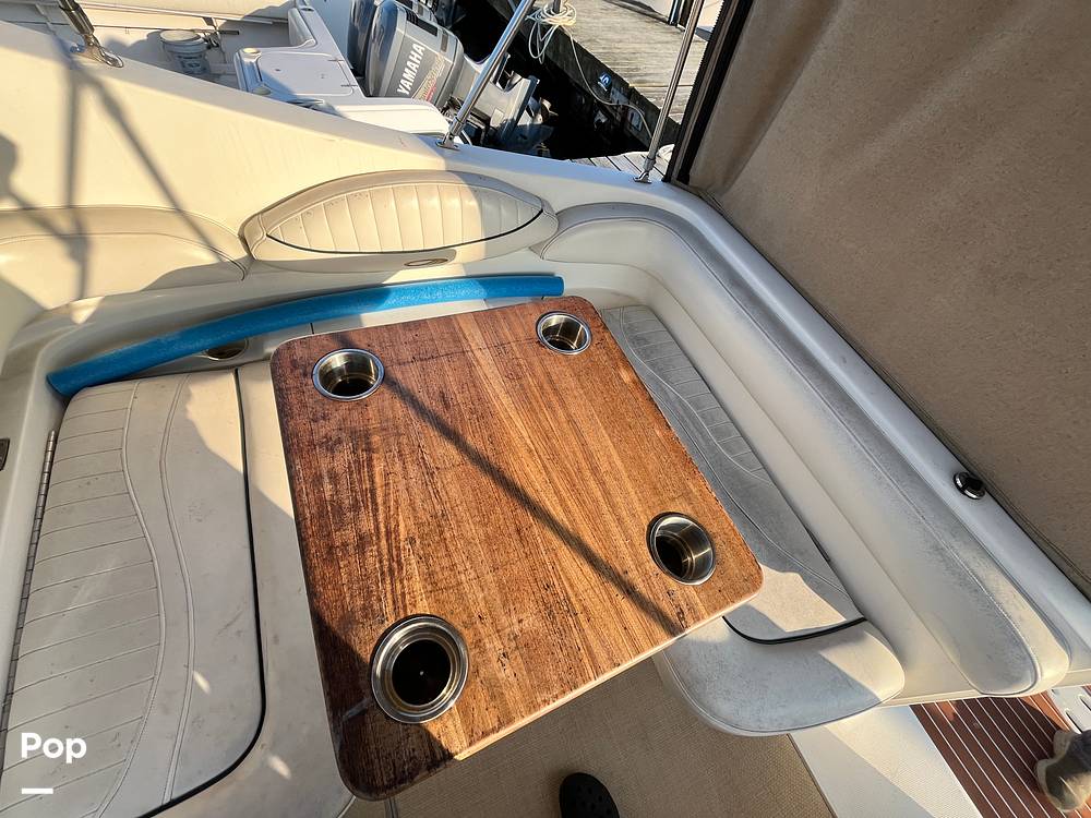 Boarding is a breeze with dock-level access, a rear swim deck, and a walk-through transom door. The walk-through windshield provides access to the bow to enjoy the forward top deck and anchor locker. The roomy cockpit is designed for entertaining, featuring a U-shaped lounge with a round table, a sink, and snap-in marine carpeting.