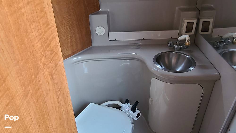 A center sliding hatchway provides access to the cabin below, where you'll find a dinette, a forward queen-size berth, and a dinette that can double as a sleeping area, a galley with sink, one burner flat cooktop, space for a mini-refrigerator/freezer, microwave, and lots of storage compartments and drawers. The head features a toilet, a shower, a vanity, a mirror, and storage.