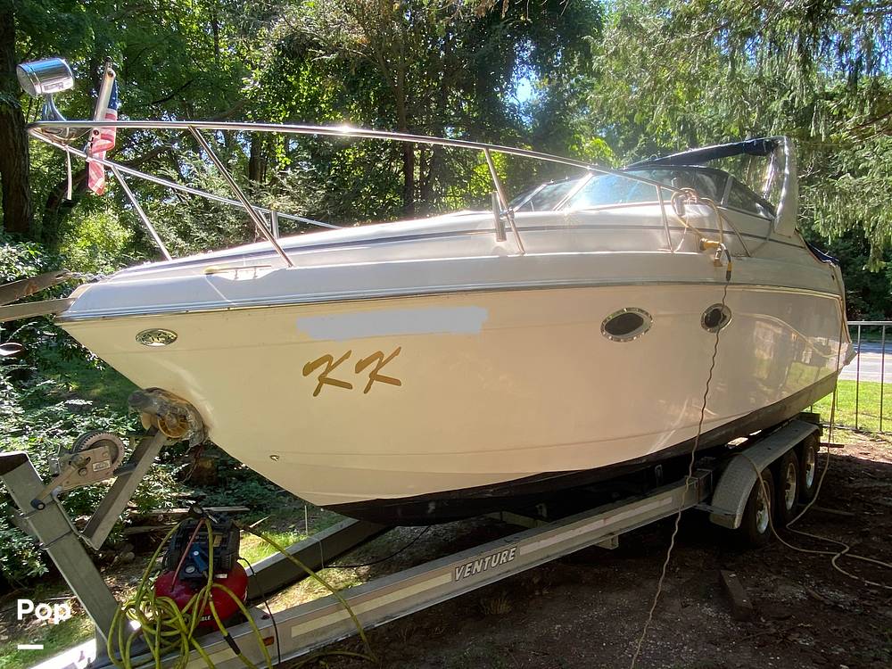 This 2002 Rinker 270 Fiesta Vee is a great express cruiser with a 9-foot beam and plenty of room for friends and family. On deck, there is plenty of seating and a large swim platform for easy entry and exit from the water.