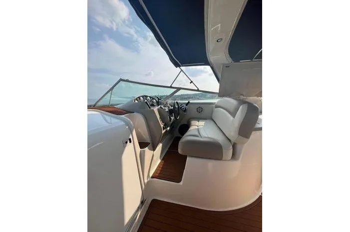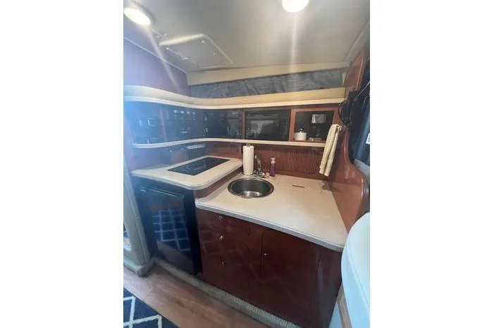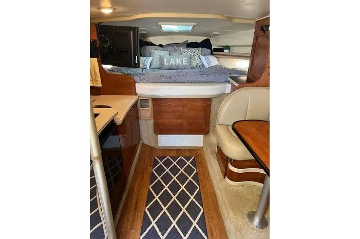 The cockpit features wraparound seating, a wet bar with sink and refrigerator, and easy access to the swim platform—ideal for relaxing at anchor or enjoying watersports. Below deck, the well-appointed cabin sleeps up to six with a forward berth, convertible dinette, and mid-cabin. The full galley includes a refrigerator, stove, microwave, and plenty of storage, while the enclosed head offers a separate shower stall.