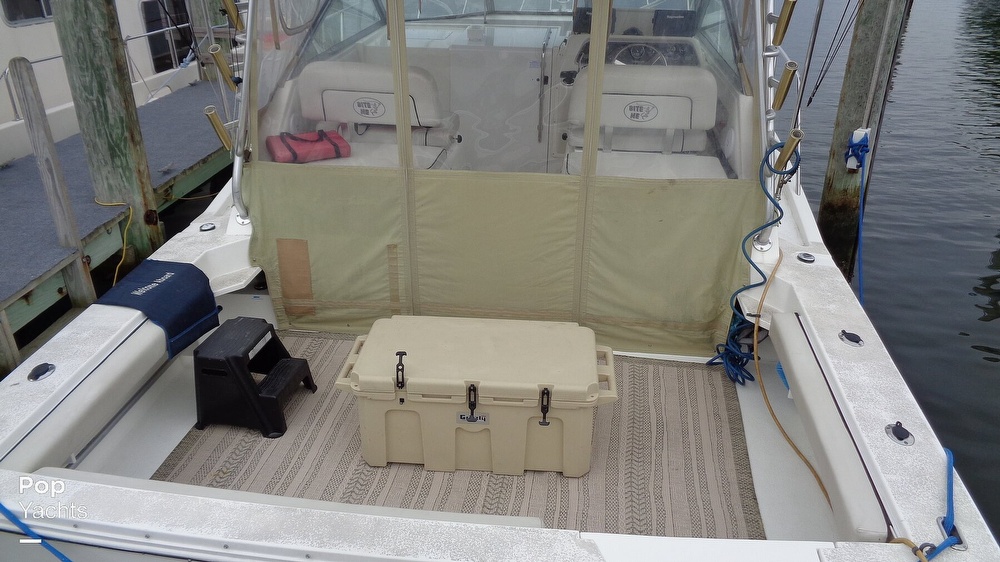 The spacious cockpit has plenty of room for anglers or deck chairs and also has coaming bolsters. The boat is equipped with a wide swim platform and a transom door makes accessing the platform easy. Additional equipment includes Hurley Davits to handle dinghy w/ outboard and