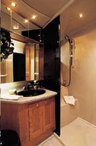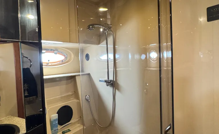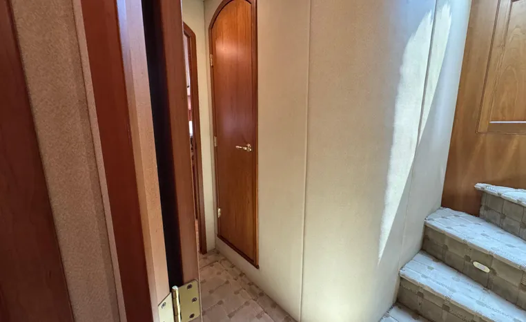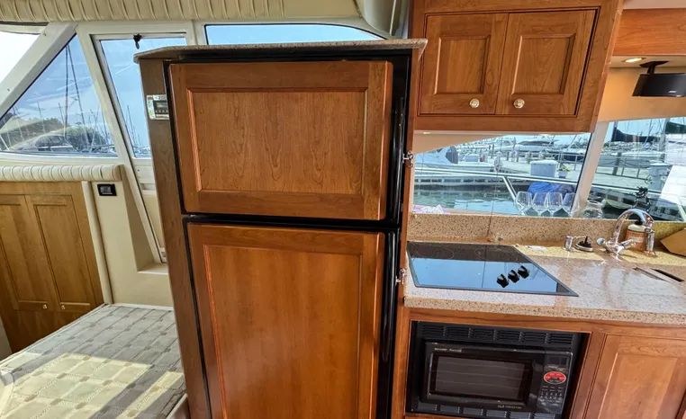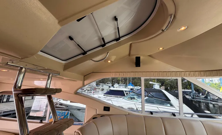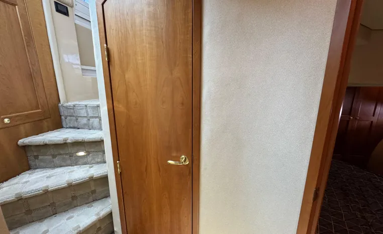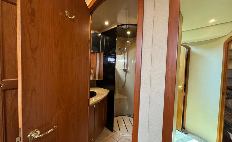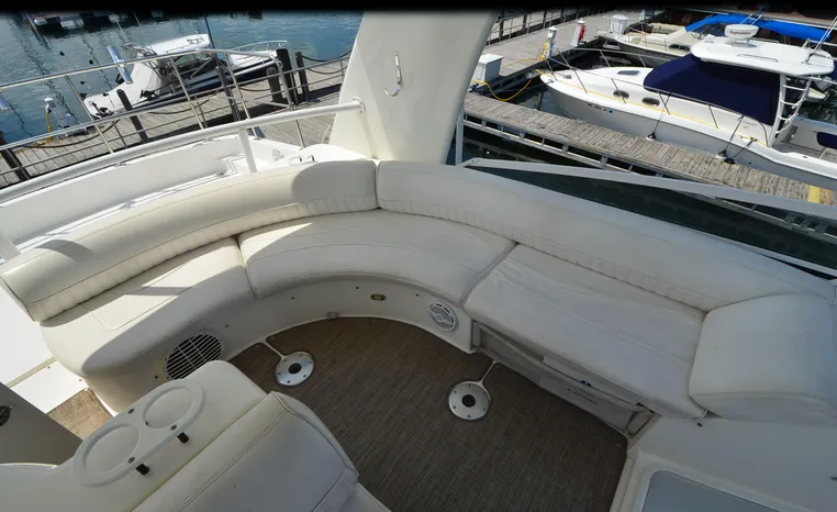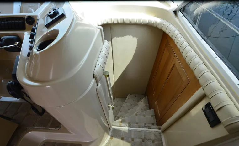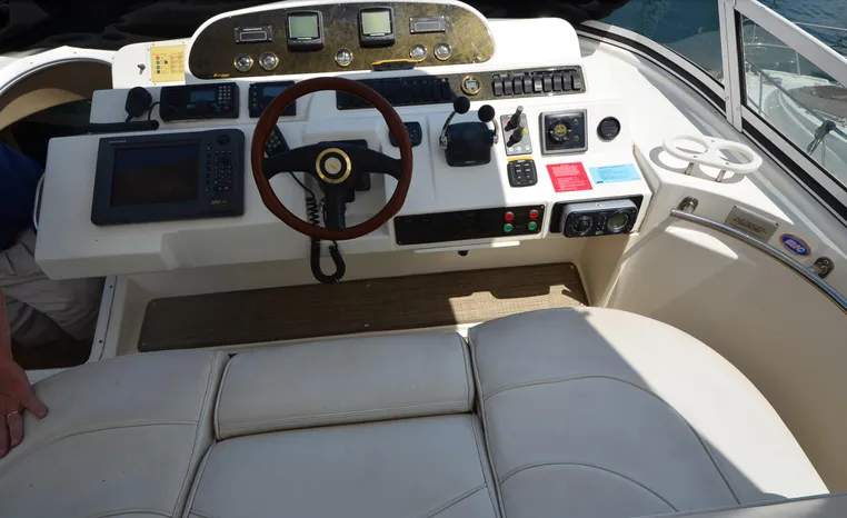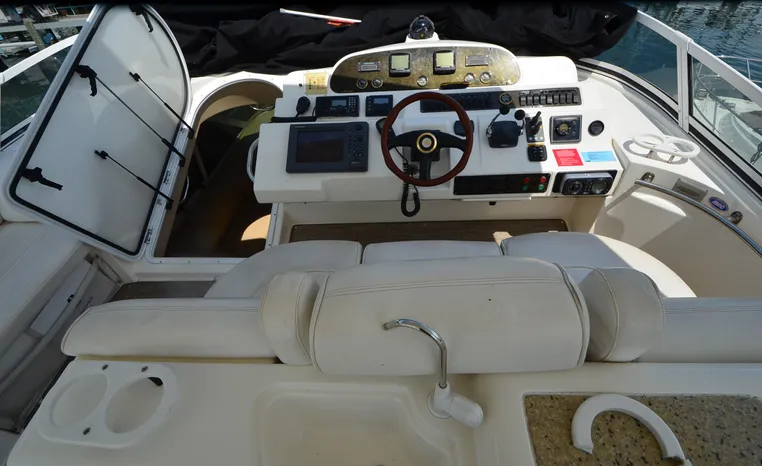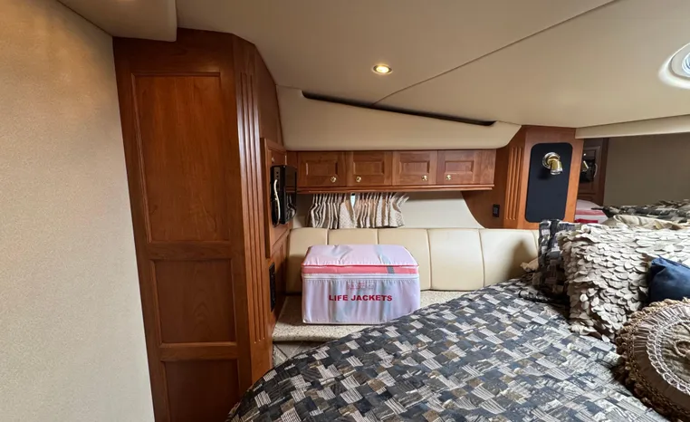 The Cruisers 5000 Sedan Sport, with three deluxe staterooms, three deck levels, a unique indoor stairway to the bridge and the finest appointments afloat, ensures an unparalleled cruising experience. Her roomy bridge deck was designed to provide serious comfort, featuring a large wrap-around settee, triple-wide helm seat, a wet bar with refrigerator and ice maker, and a stereo / CD player. The generous aft deck space incorporates an extended swim platform, which is also available with a hydraulic lift. The salon boasts a convertible, crescent-shaped dinette / sofa, an L-shaped sofa / sleeper and a well-equipped lower helm station. A well-thought-out galley features a coffee maker, dishwasher, microwave / convection oven, and full-size refrigerator / freezer, as well as plenty of storage, counter space, and attractive wood flooring. The master stateroom, forward stateroom, and twin-berth midcabin are accompanied by two spacious heads with separate showers, as well as countless amenities to enhance the liveaboard life. The third cabin also serves as a laundry room with washer / dryer unit.