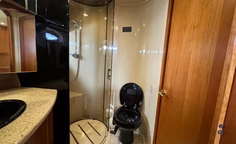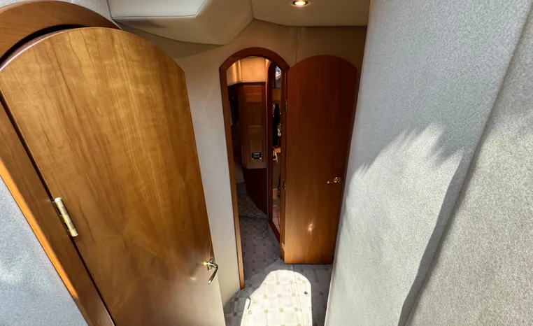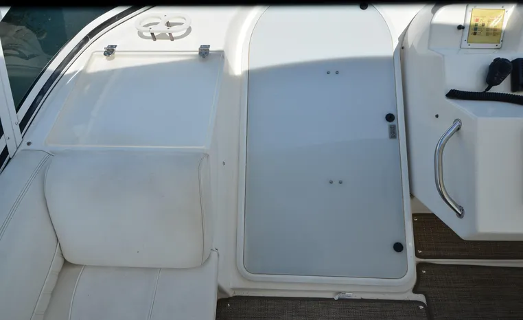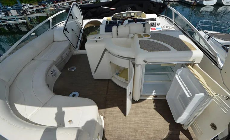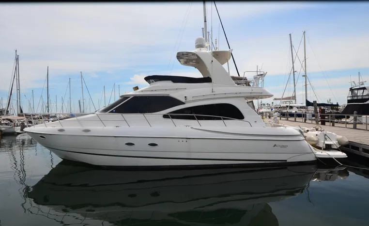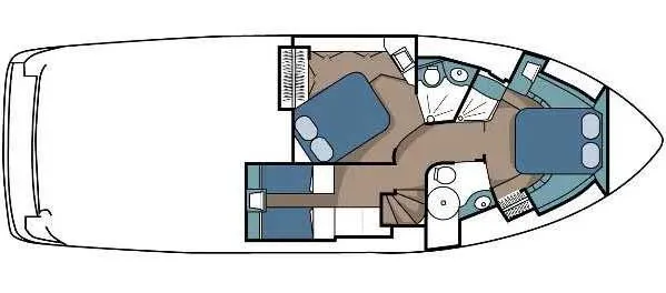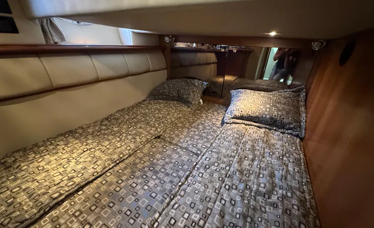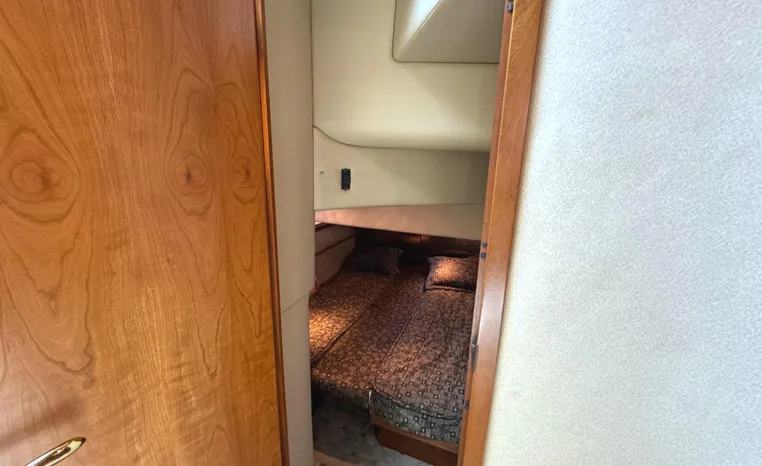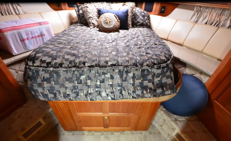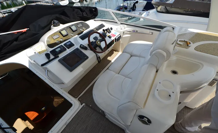 The Cruisers 5000 Sedan Sport, with three deluxe staterooms, three deck levels, a unique indoor stairway to the bridge and the finest appointments afloat, ensures an unparalleled cruising experience. Her roomy bridge deck was designed to provide serious comfort, featuring a large wrap-around settee, triple-wide helm seat, a wet bar with refrigerator and ice maker, and a stereo / CD player. The generous aft deck space incorporates an extended swim platform, which is also available with a hydraulic lift. The salon boasts a convertible, crescent-shaped dinette / sofa, an L-shaped sofa / sleeper and a well-equipped lower helm station. A well-thought-out galley features a coffee maker, dishwasher, microwave / convection oven, and full-size refrigerator / freezer, as well as plenty of storage, counter space, and attractive wood flooring. The master stateroom, forward stateroom, and twin-berth midcabin are accompanied by two spacious heads with separate showers, as well as countless amenities to enhance the liveaboard life. The third cabin also serves as a laundry room with washer / dryer unit.