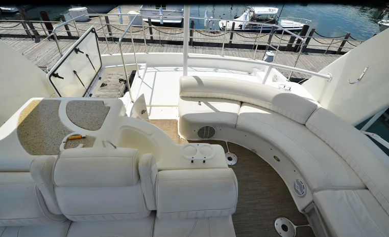 Custom Canvas covers for helm, seating, and wet bar included.