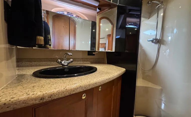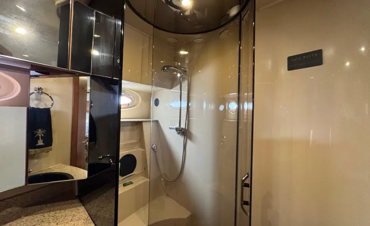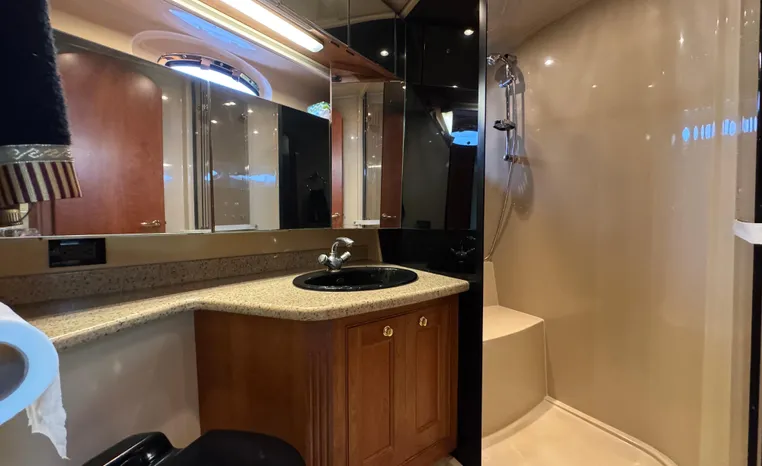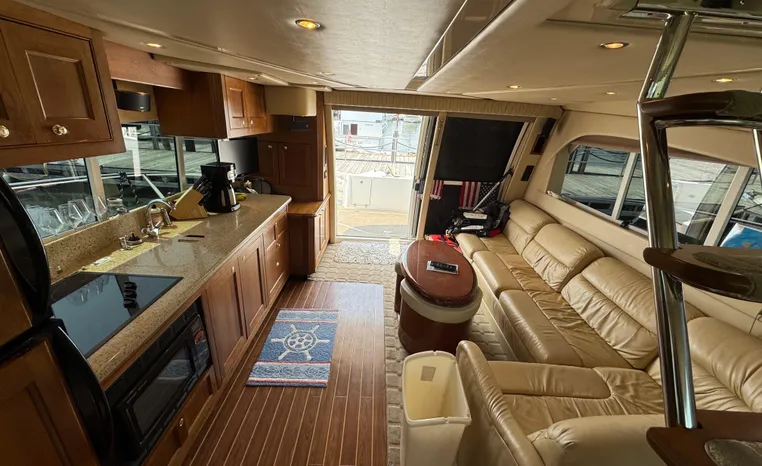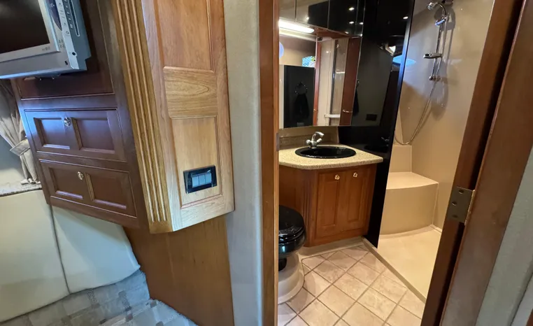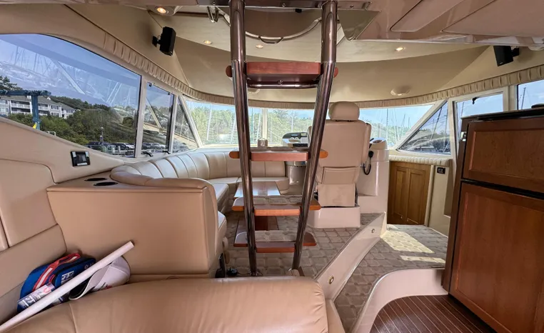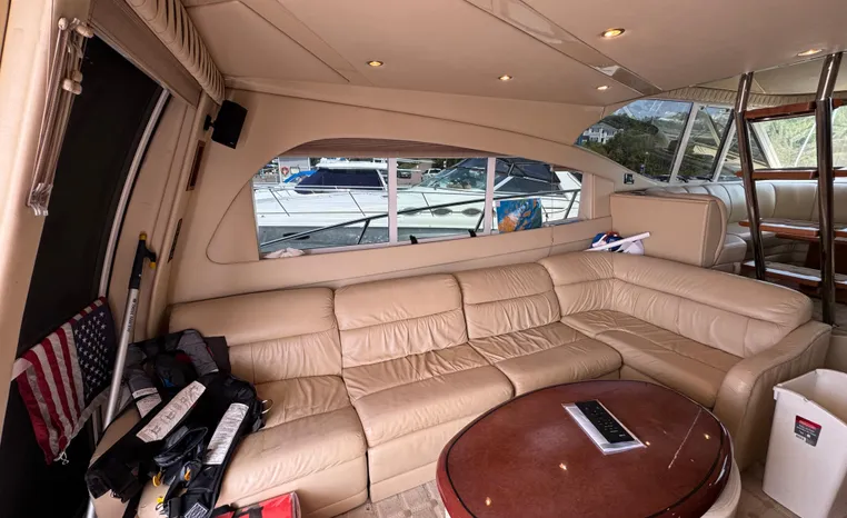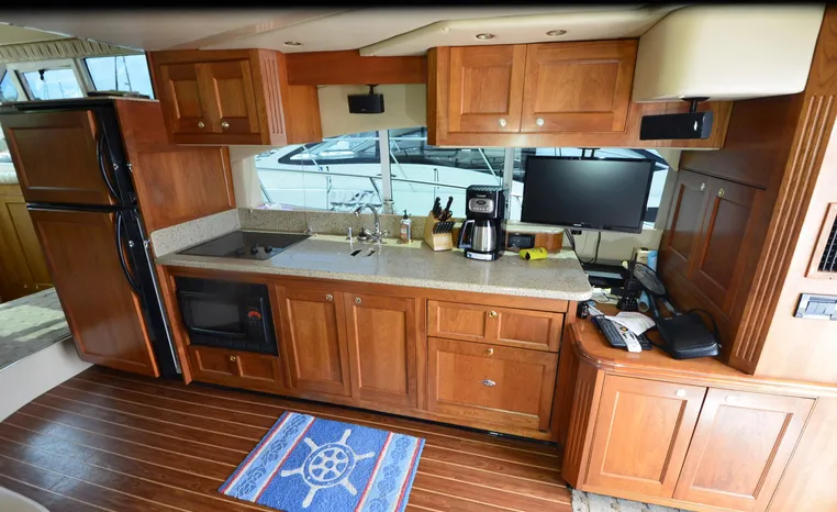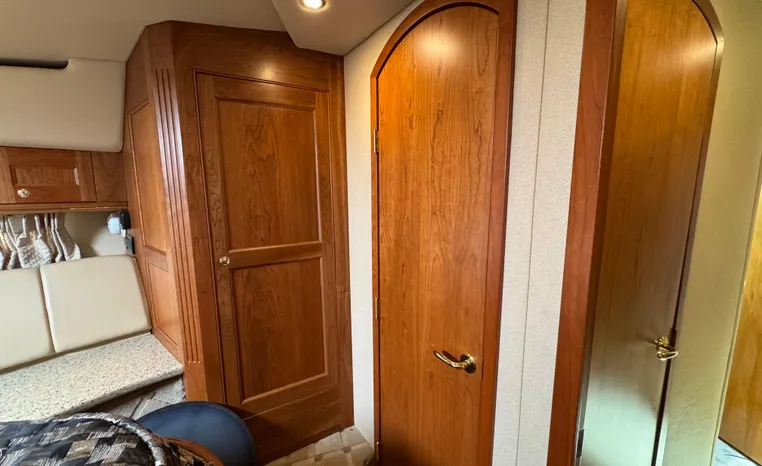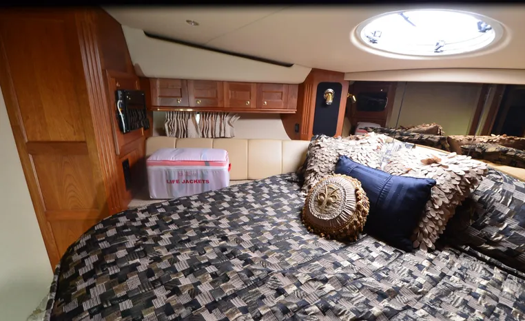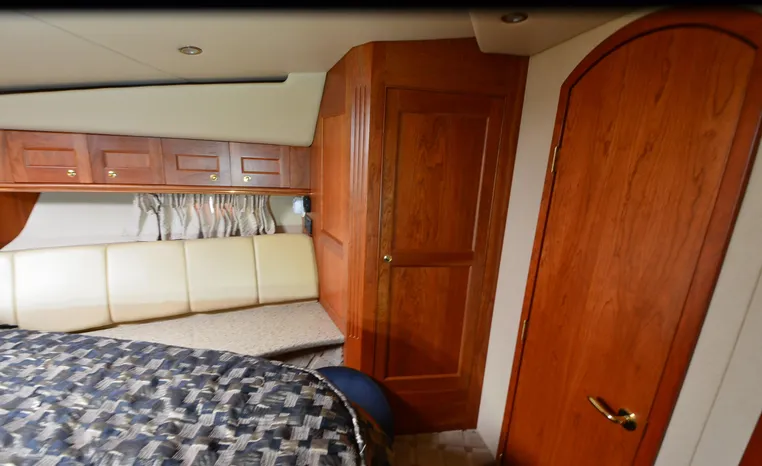 The Cruisers 5000 Sedan Sport, with three deluxe staterooms, three deck levels, a unique indoor stairway to the bridge and the finest appointments afloat, ensures an unparalleled cruising experience. Her roomy bridge deck was designed to provide serious comfort, featuring a large wrap-around settee, triple-wide helm seat, a wet bar with refrigerator and ice maker, and a stereo / CD player. The generous aft deck space incorporates an extended swim platform, which is also available with a hydraulic lift. The salon boasts a convertible, crescent-shaped dinette / sofa, an L-shaped sofa / sleeper and a well-equipped lower helm station. A well-thought-out galley features a coffee maker, dishwasher, microwave / convection oven, and full-size refrigerator / freezer, as well as plenty of storage, counter space, and attractive wood flooring. The master stateroom, forward stateroom, and twin-berth midcabin are accompanied by two spacious heads with separate showers, as well as countless amenities to enhance the liveaboard life. The third cabin also serves as a laundry room with washer / dryer unit.