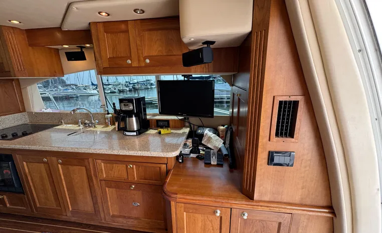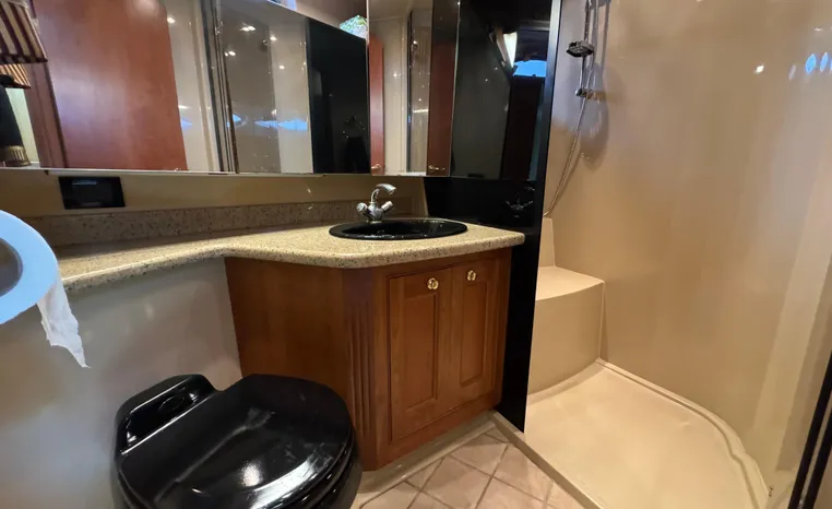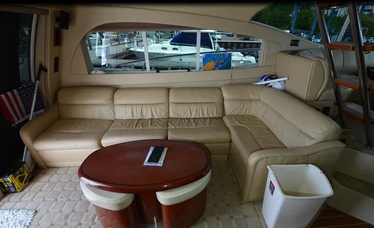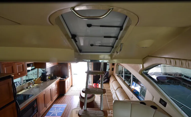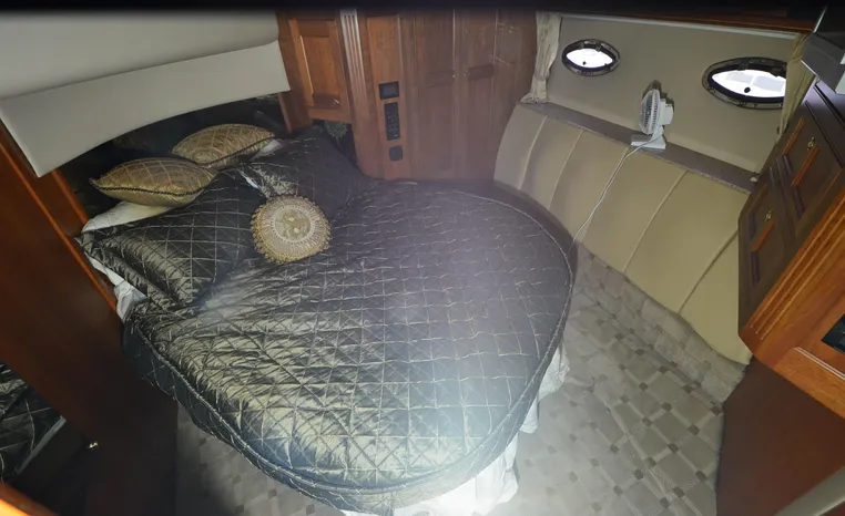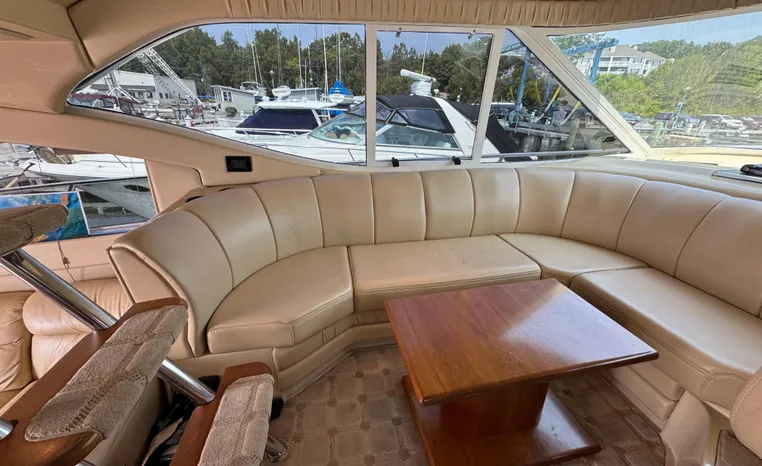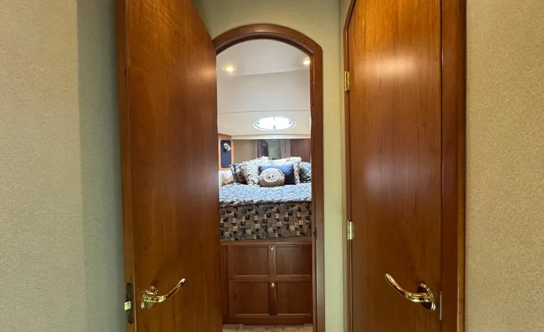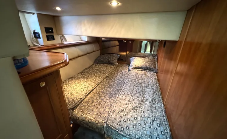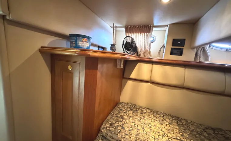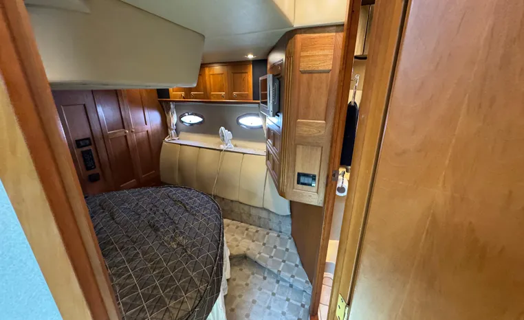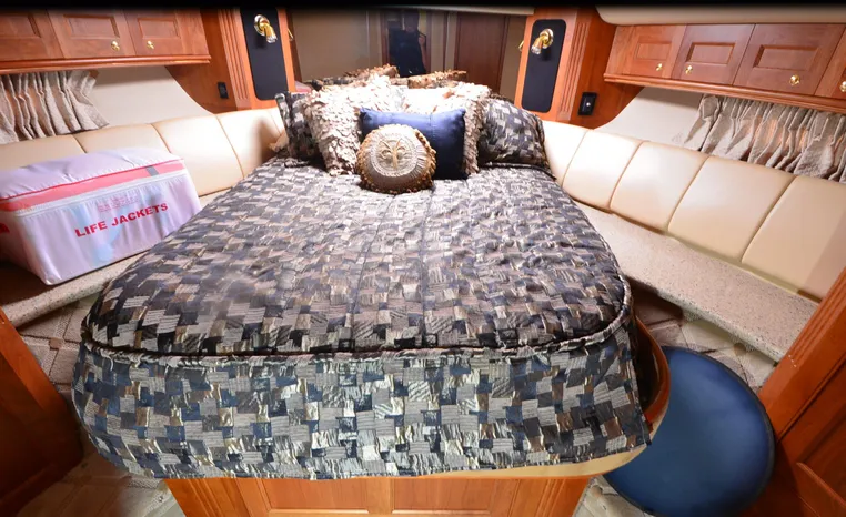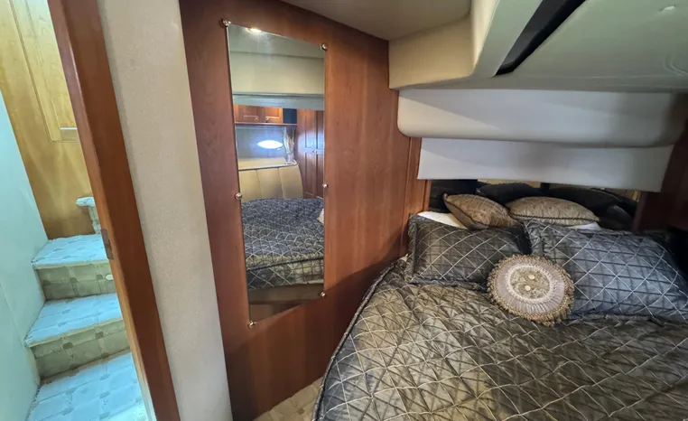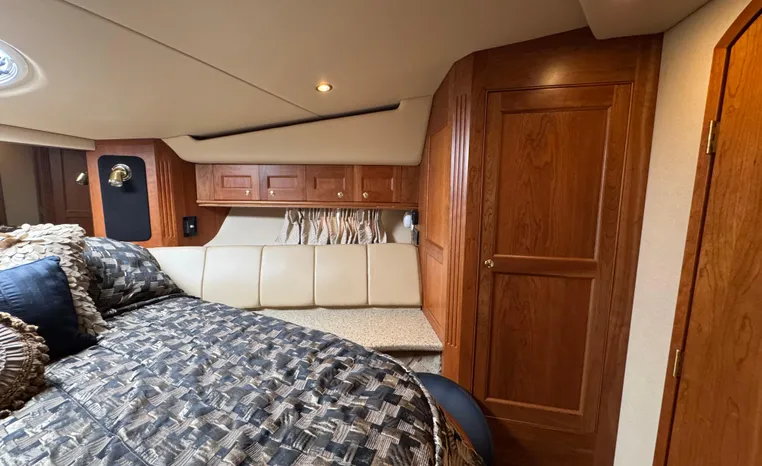 The Cruisers 5000 Sedan Sport, with three deluxe staterooms, three deck levels, a unique indoor stairway to the bridge and the finest appointments afloat, ensures an unparalleled cruising experience. Her roomy bridge deck was designed to provide serious comfort, featuring a large wrap-around settee, triple-wide helm seat, a wet bar with refrigerator and ice maker, and a stereo / CD player. The generous aft deck space incorporates an extended swim platform, which is also available with a hydraulic lift. The salon boasts a convertible, crescent-shaped dinette / sofa, an L-shaped sofa / sleeper and a well-equipped lower helm station. A well-thought-out galley features a coffee maker, dishwasher, microwave / convection oven, and full-size refrigerator / freezer, as well as plenty of storage, counter space, and attractive wood flooring. The master stateroom, forward stateroom, and twin-berth midcabin are accompanied by two spacious heads with separate showers, as well as countless amenities to enhance the liveaboard life. The third cabin also serves as a laundry room with washer / dryer unit.