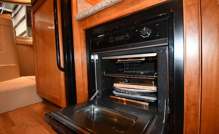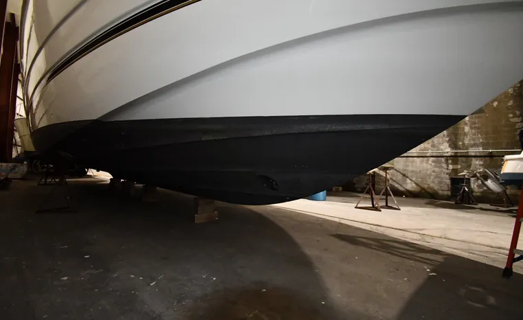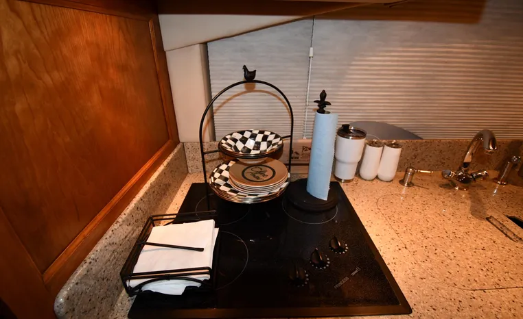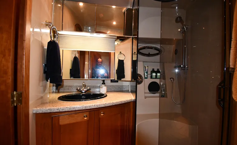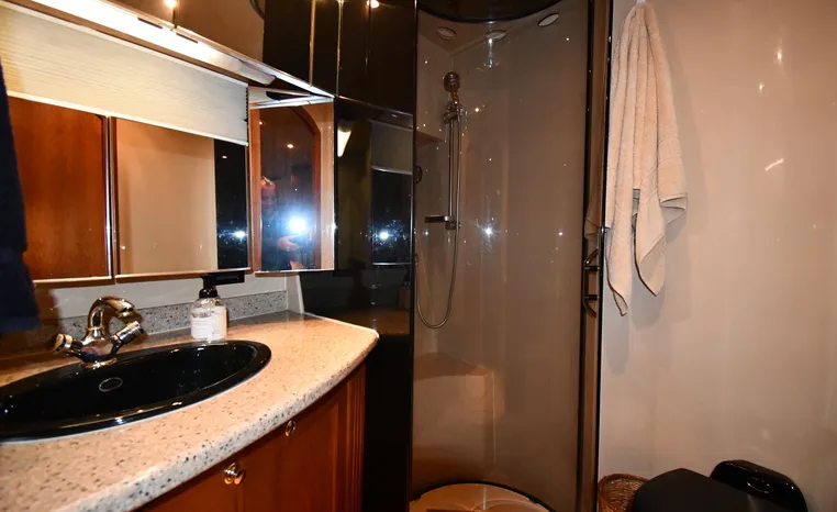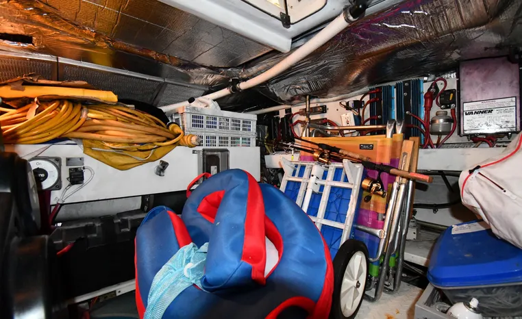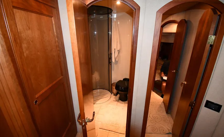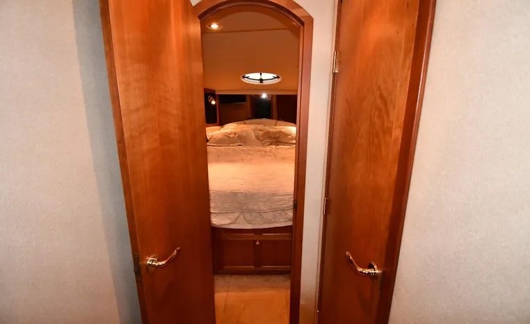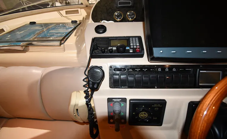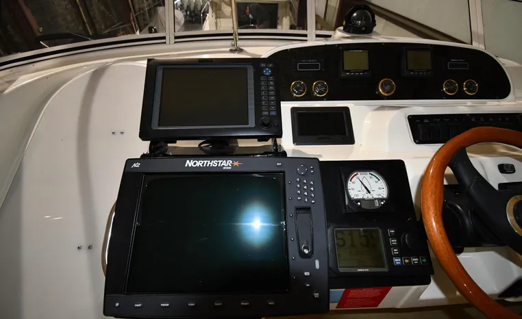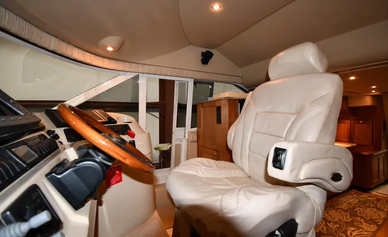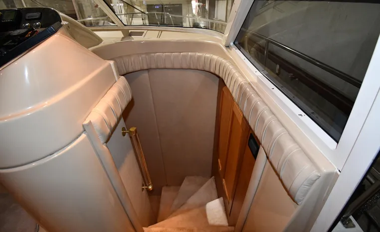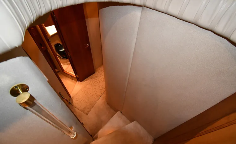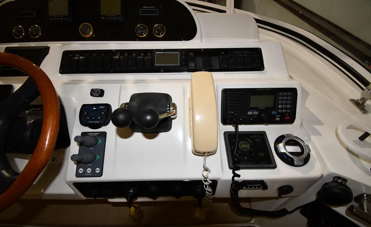 Well-mannered flybridge with sleek profile, vast interior is ideal for liveaboards, cruisers alike. Wide-open salon is open huge starboard side galley, raised helm/dinette area forward. Inside bridge access is rare in a boat this size. Two of three staterooms have double berths; both heads have separate shower stalls. Note rich cherry-wood cabinetry, good engine room access. Fully cored hull has prop pockets to reduce draft and shaft angles.
