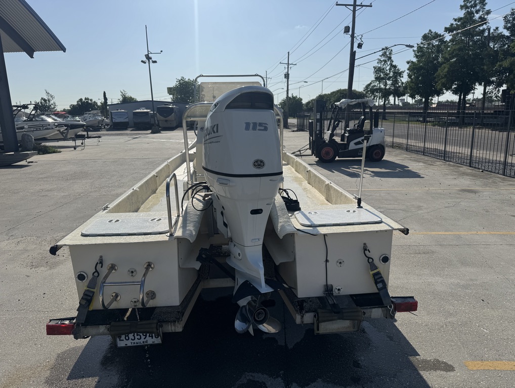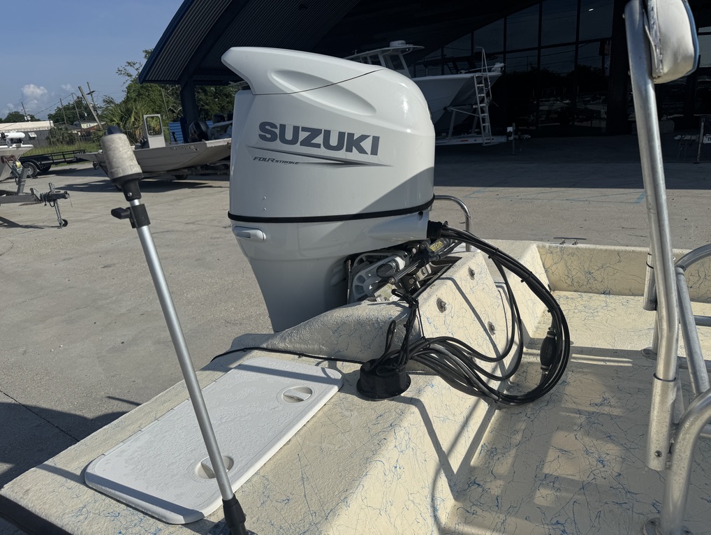 The boat features a clean layout with large casting decks, ample storage, and a poling platform for serious anglers. The Suzuki 115 provides quiet, fuel-efficient performance with the peace of mind of modern 4-stroke reliability.