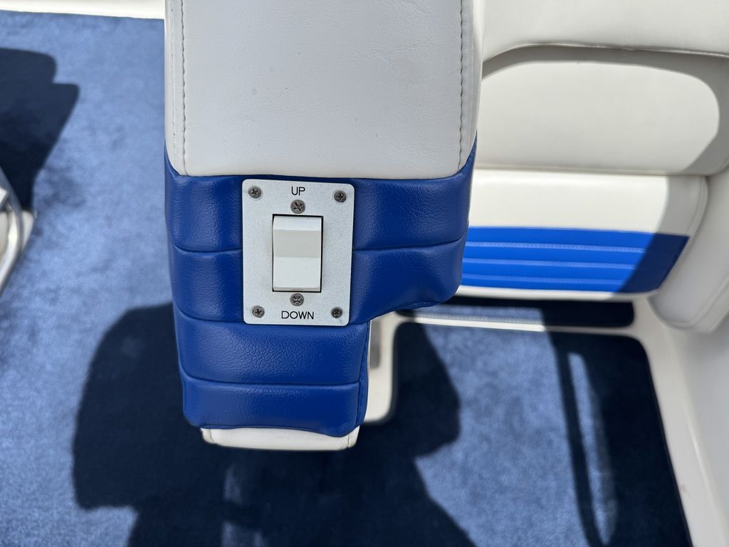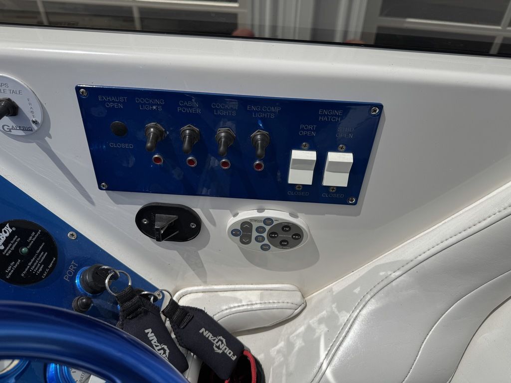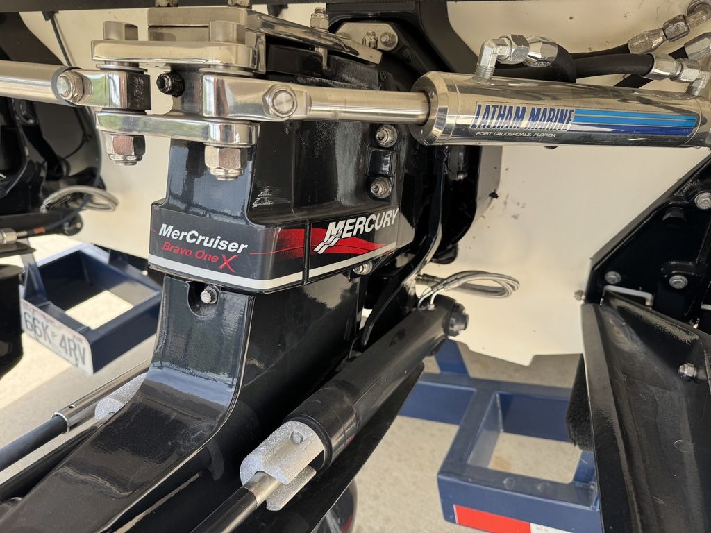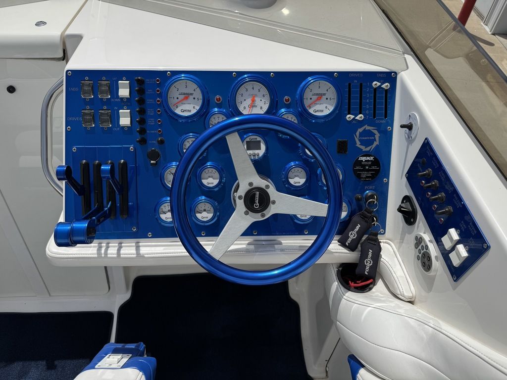 Latham Marine steering assemblies, 4 blade stainless steel props, docking lights, Gaffrig throttle and shift assembly, Gaffrig gauges, mechanical trim and tab indicators, electric bolsters, built in coolers, sink, pump out head, daybed, Rockford Fosgate speakers, Kenwood head unit, and more!