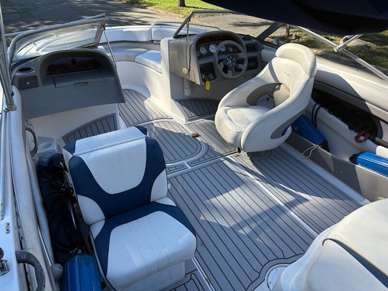 Features include bimini, new foam decking, tilt steering, captain’s chair with wrap-around backrest, ample storage, ski tow, swim platform, and more!