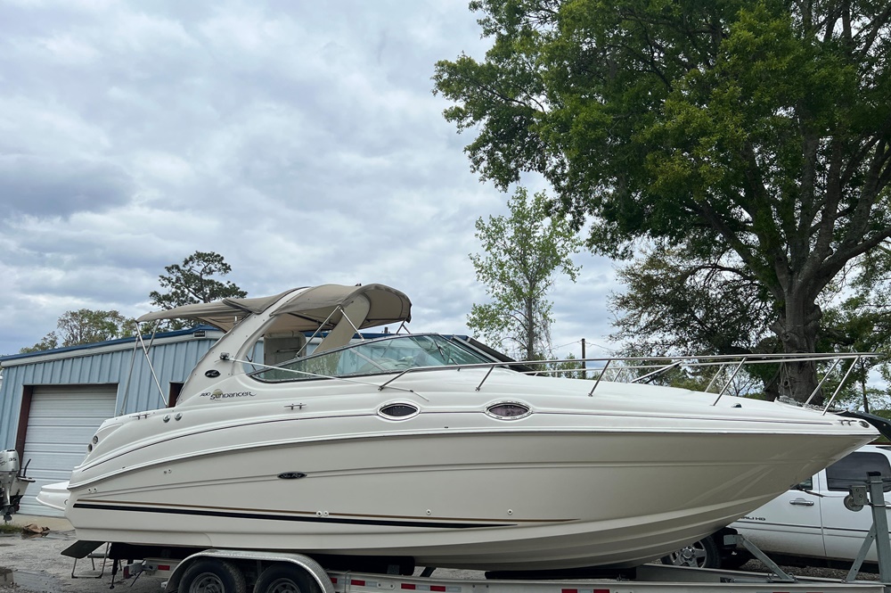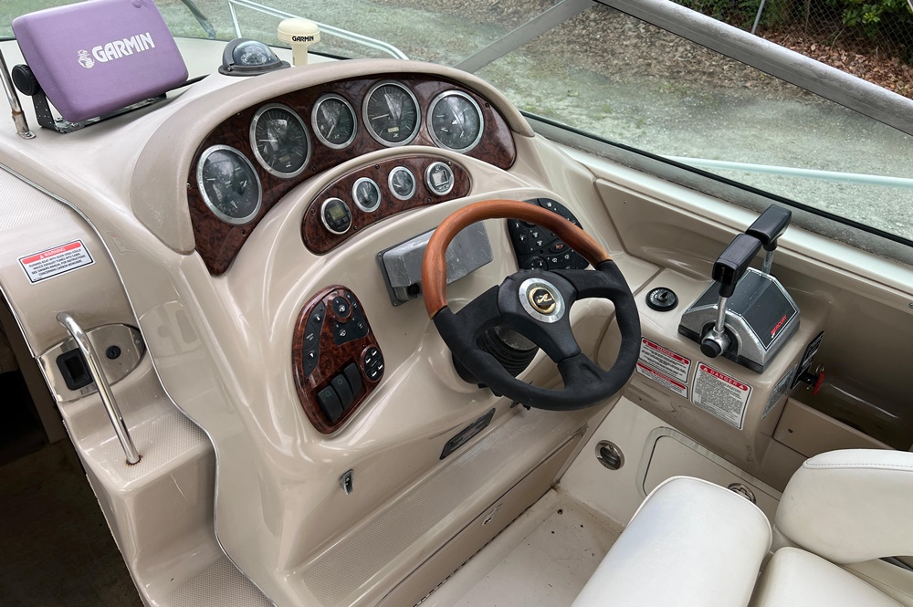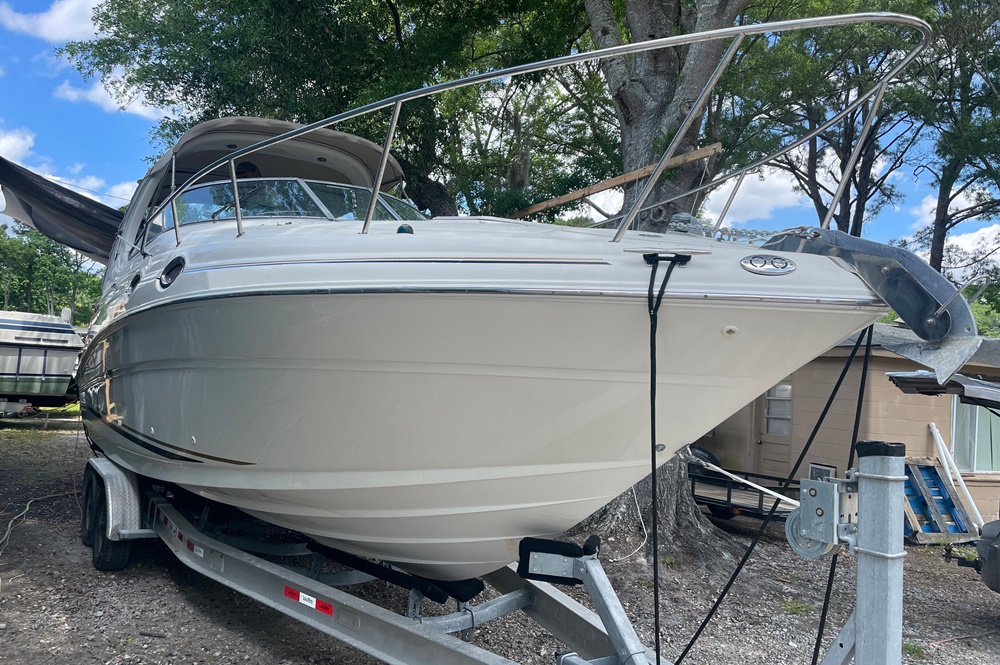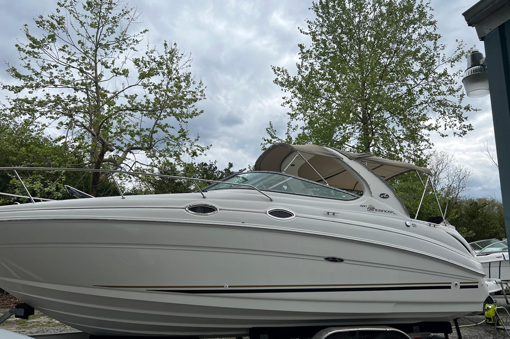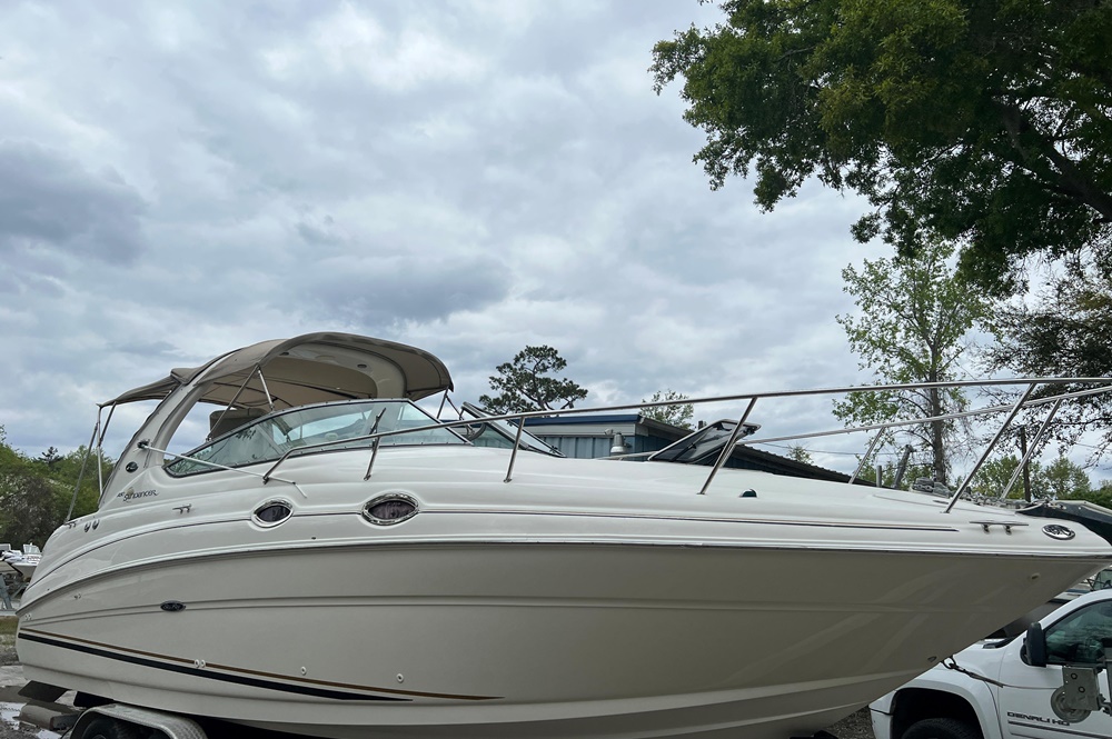 Boaters everywhere will cheer all 28 beautiful feet of the Sea Ray 280 Sundancer, from the stainless steel bow rail to the extended swim platform. The standard fiberglass sport spoiler only adds to her distinctive profile. With room to sleep six, she's just right for families who hate to leave the water when darkness falls. Standard power is a 496 Magnum Bravo III MCM stern drive.